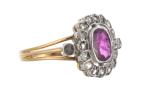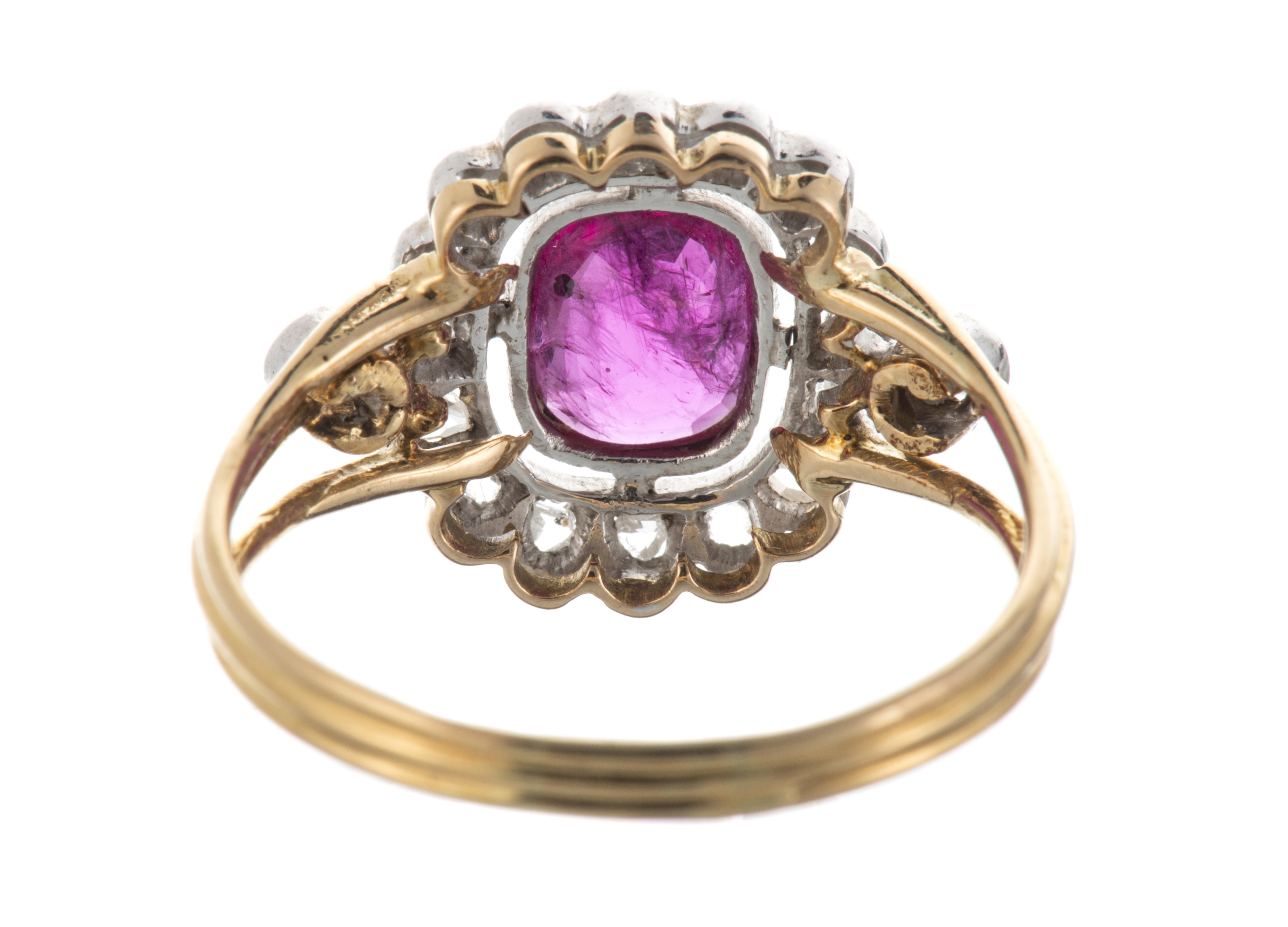 Bague en or jaune et or gris .750 avec un rubis central probablement Birman de env. 1.5 ct et un entourage de 18 diamants de taille rose dont deux latéraux