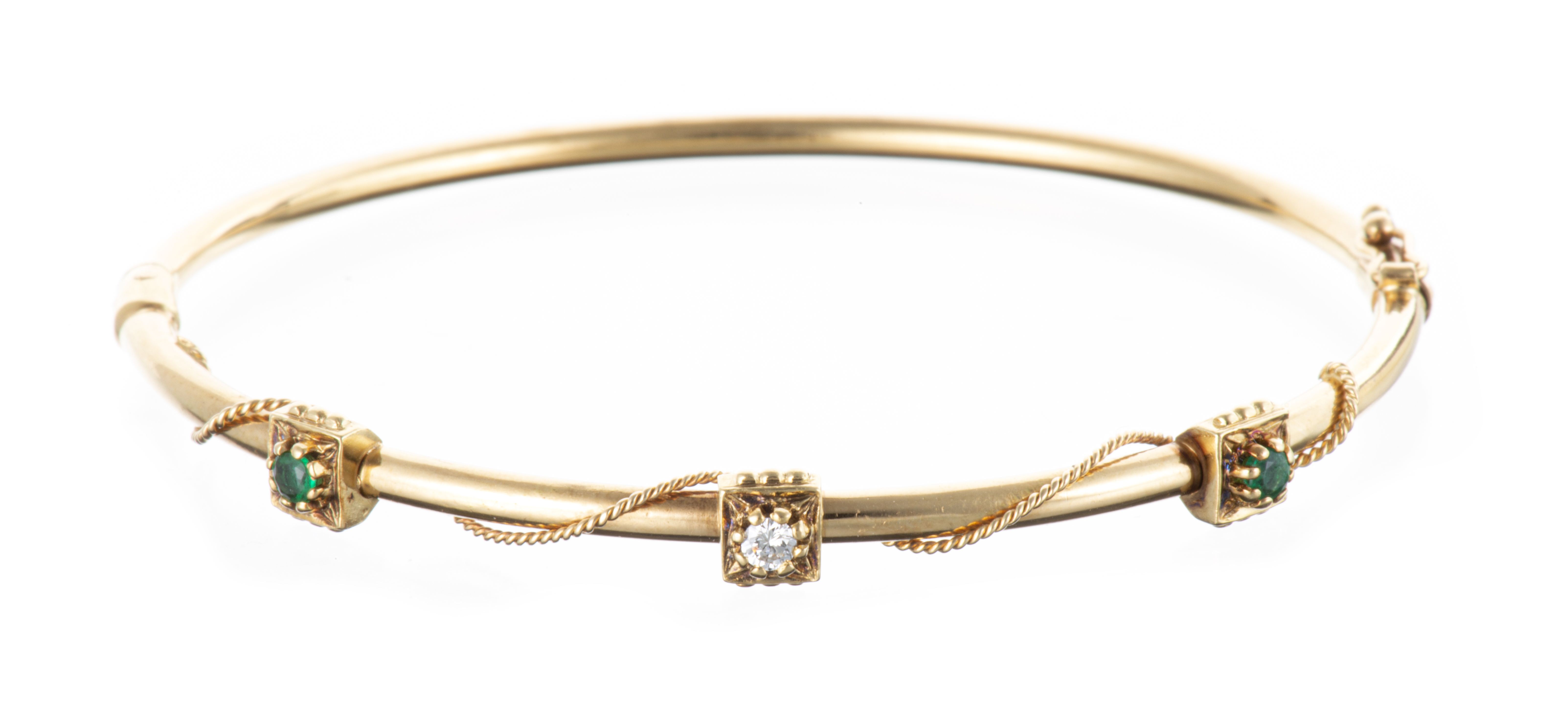Bracelet en or jaune .750 serti de 2 émeraudes rondes de 0.03 ct chacune et un diamant de taille brillant de 0.04 ct.