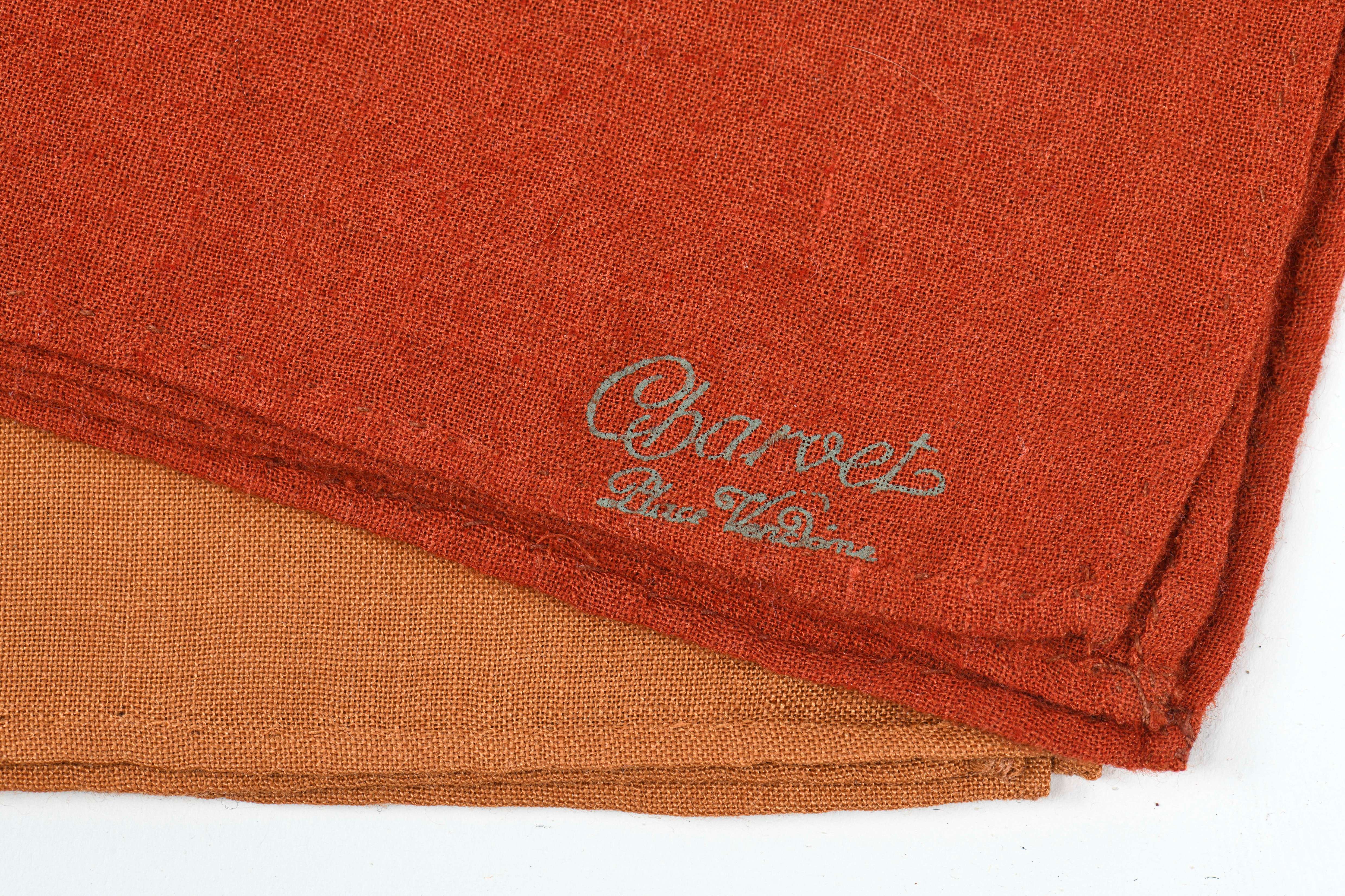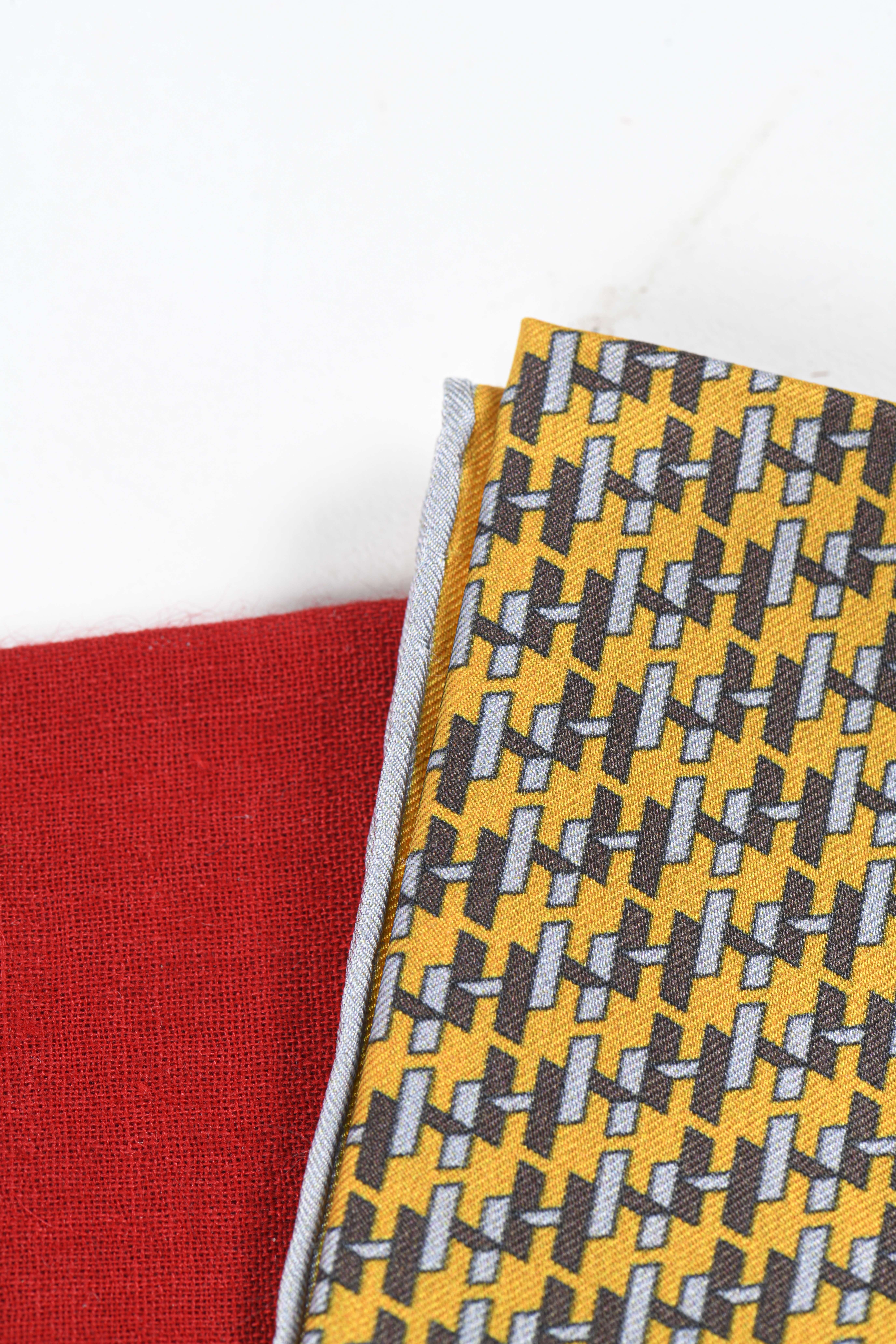 - CHARVET Place Vendôme, trois pochettes laine et soie de teinte unie, rouge, moutarde et ocre 30 x 31 cm