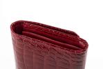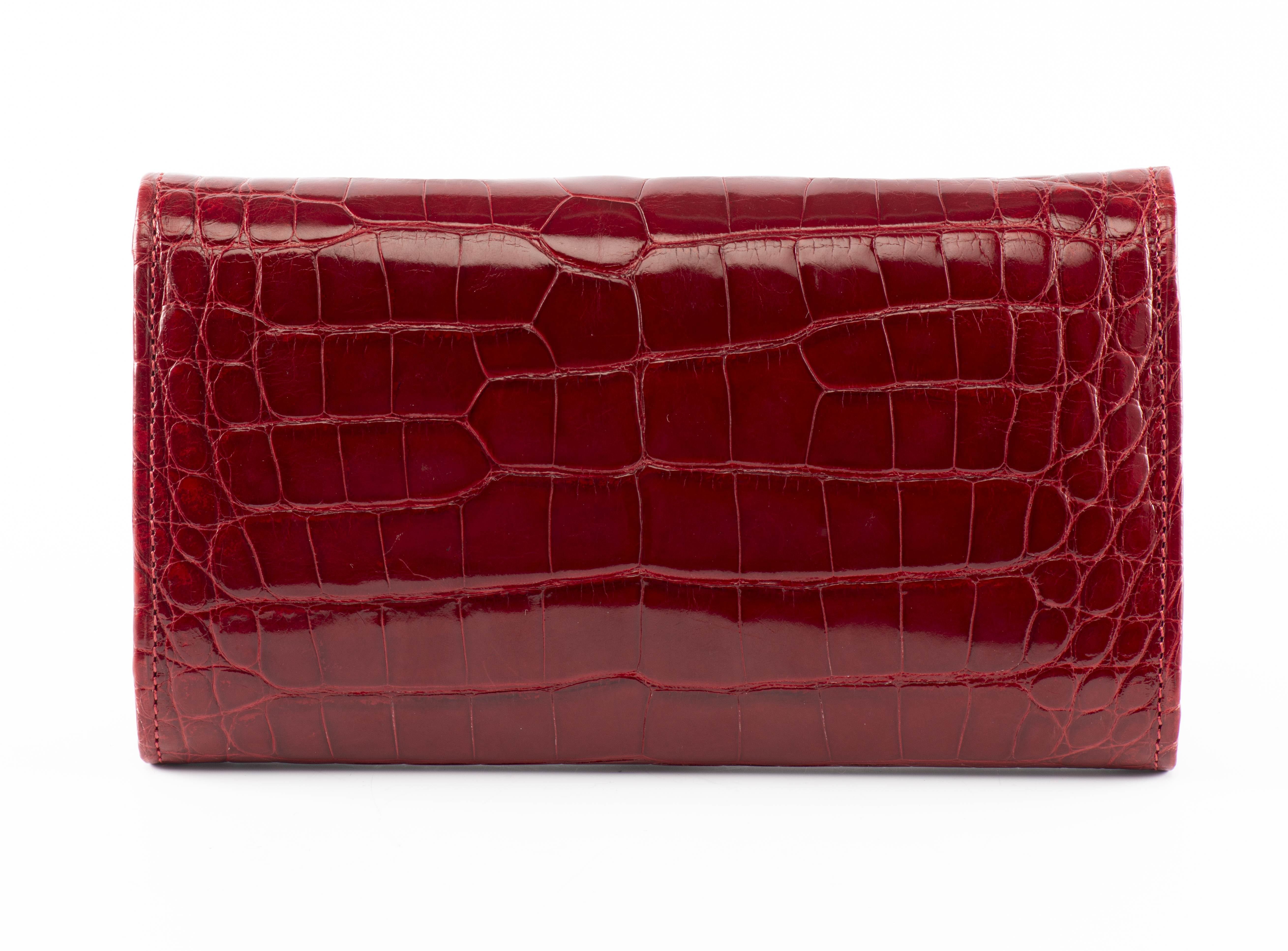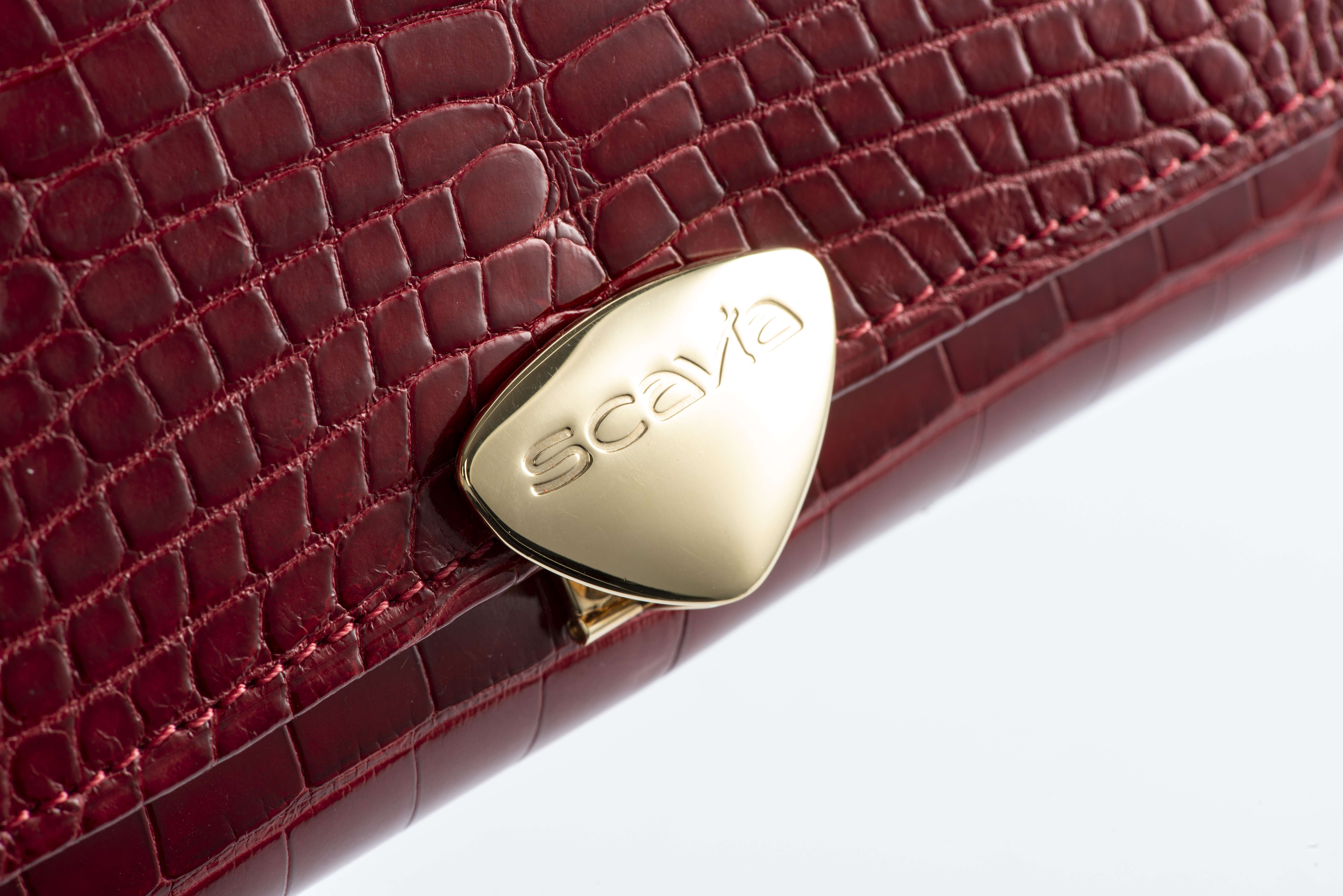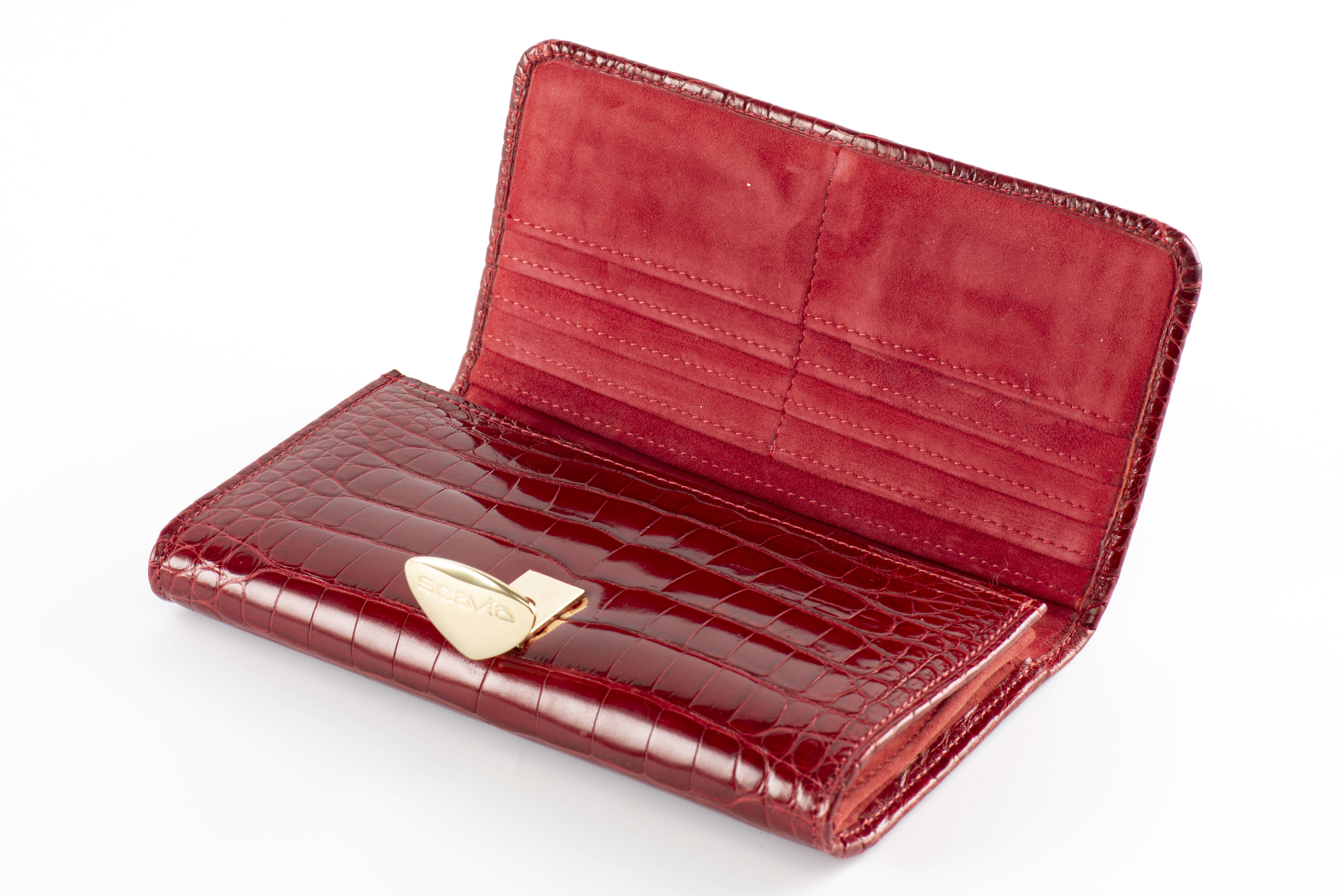 SCAVIA. Portfeuille en crocodile rouge à fermoir griffé doré.
