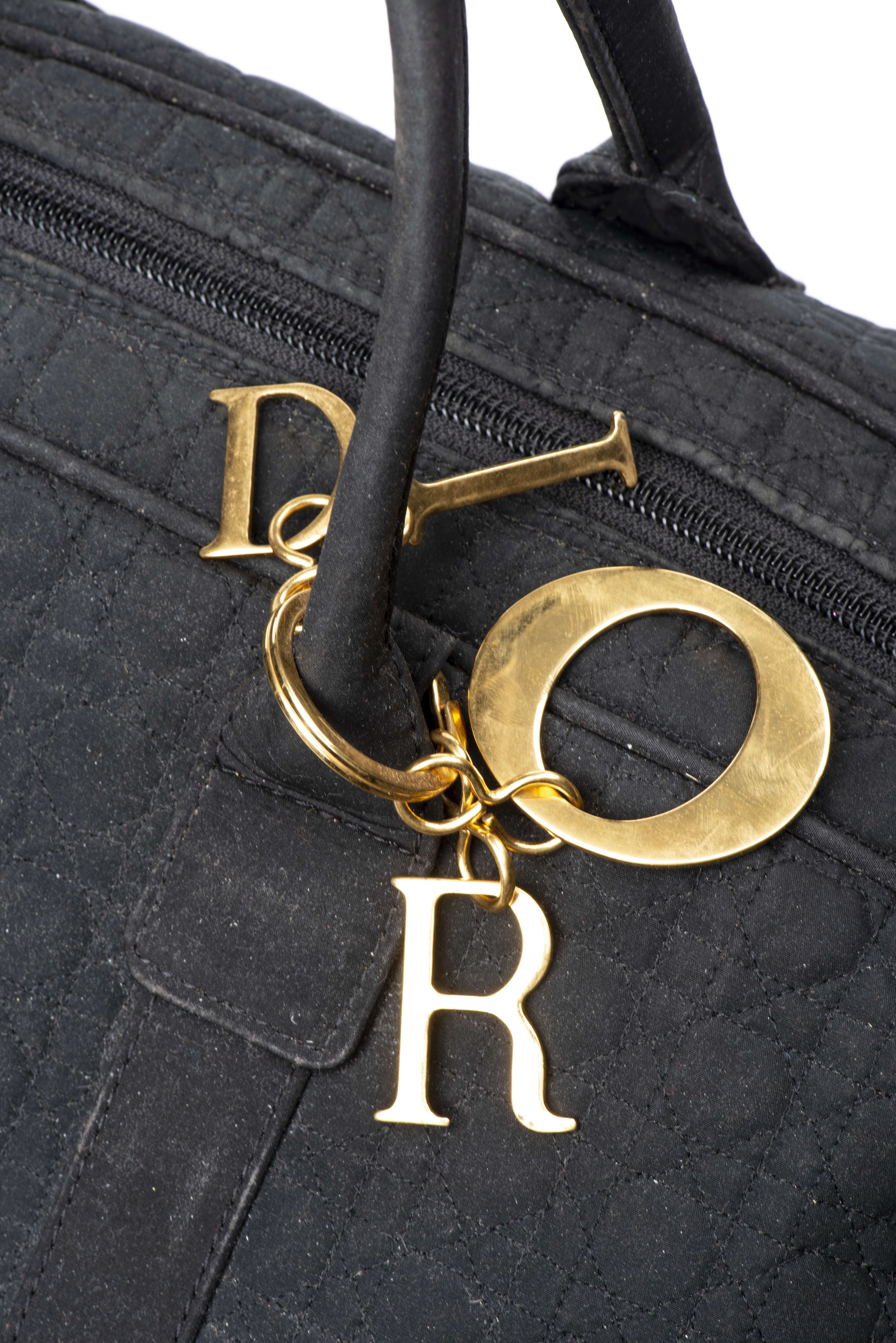 Christian DIOR, sac de voyage "Lady Dior" en tissu noir matelassé à surpiqûres cannage, bijouterie initiales dorées et bijouterie camée monogrammé CD, fermeture éclair, doublure intérieure en tissu rouge monogrammé CD, une poche intérieure à la fermeture éclair avec étiquette Christian Dior Paris n° RU 0958, une petite poche à fermeture éclair à l'extérieur d'un côté.