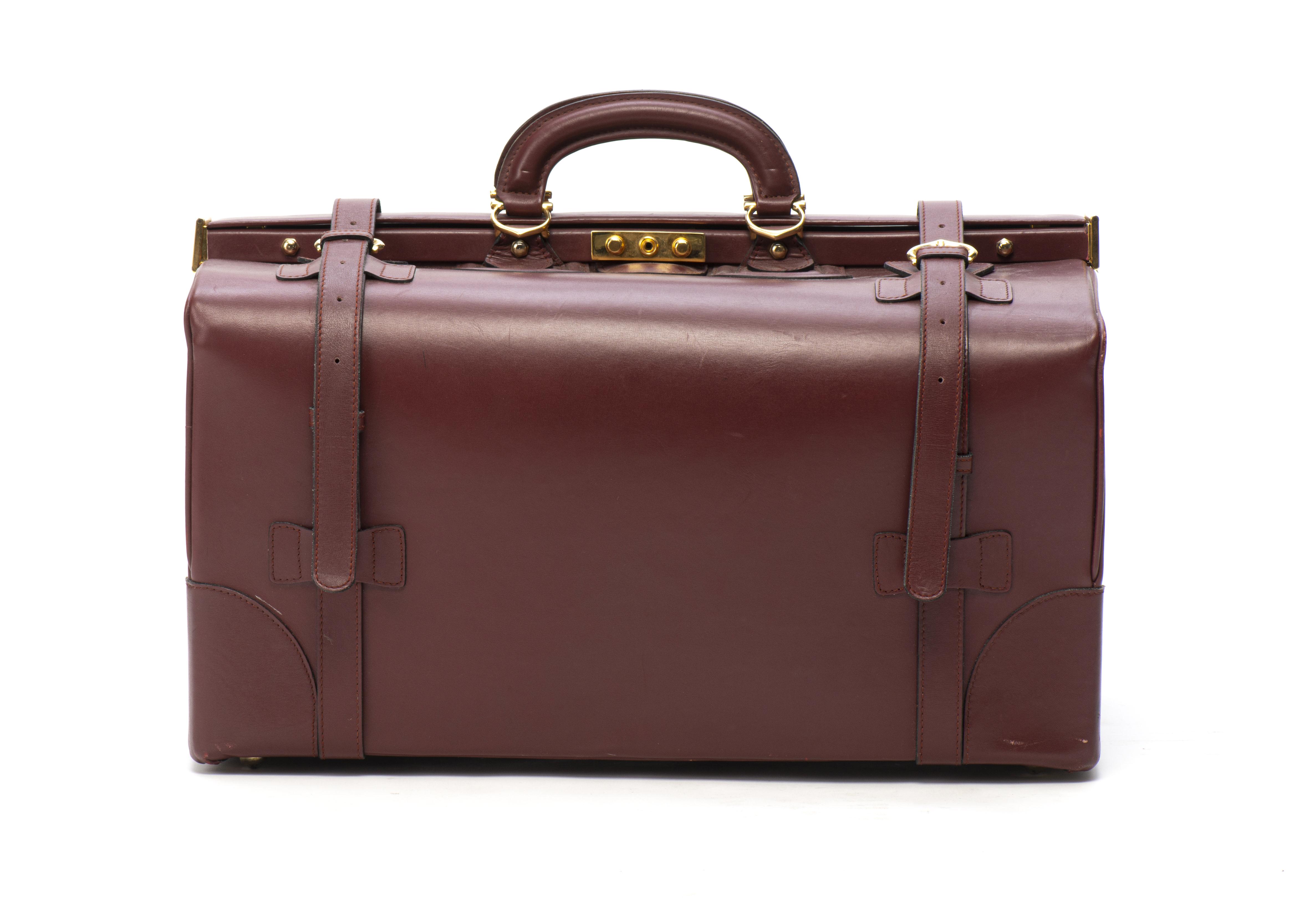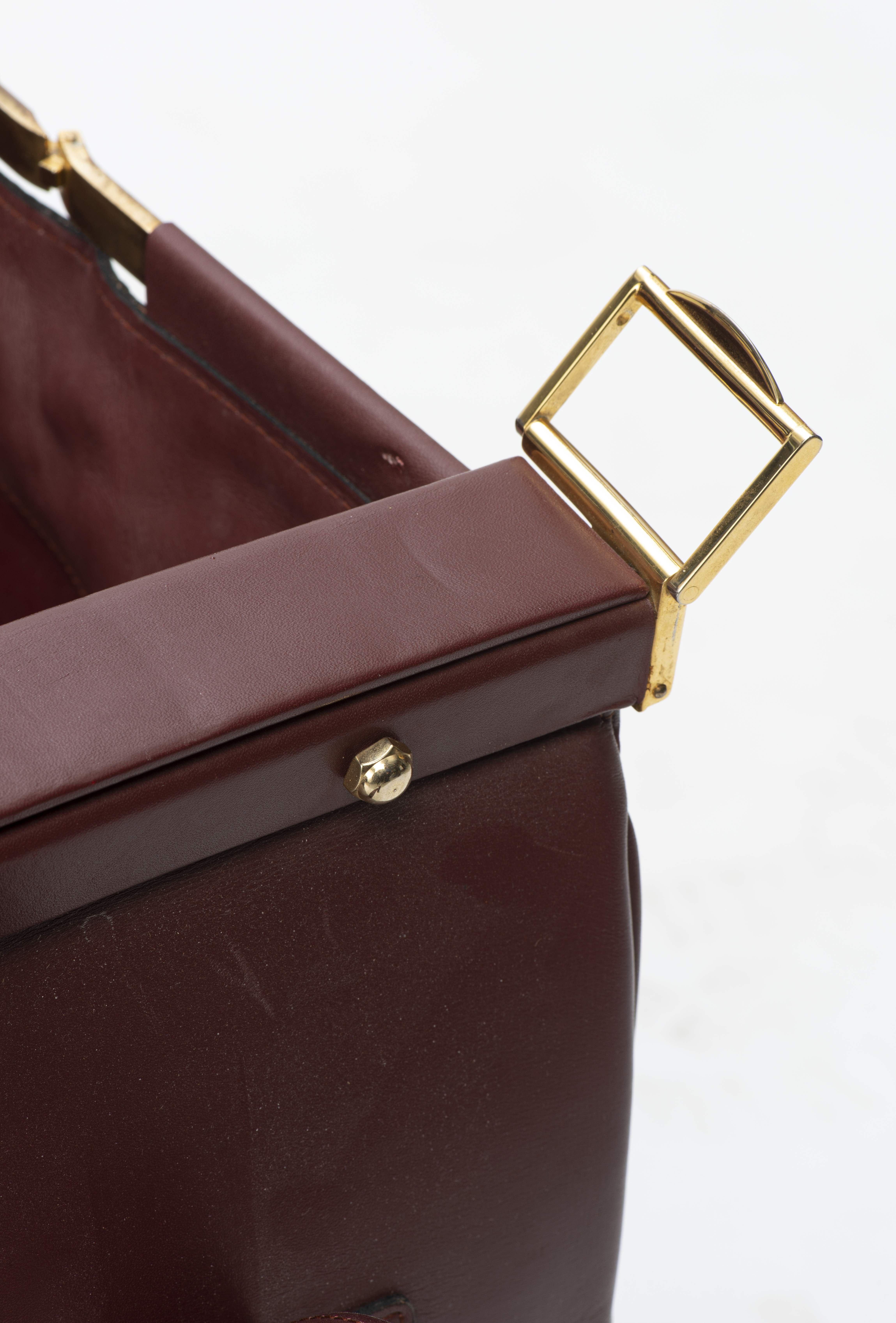 CARTIER. Mallette de toilette en cuir lisse grenat ou sac de voyage "Square Mouth" en cuir rouge bordeaux, agrémenté du sigle sur les côtés, garniture en métal plaqué or, sangles, double poignées, pas de clé.
