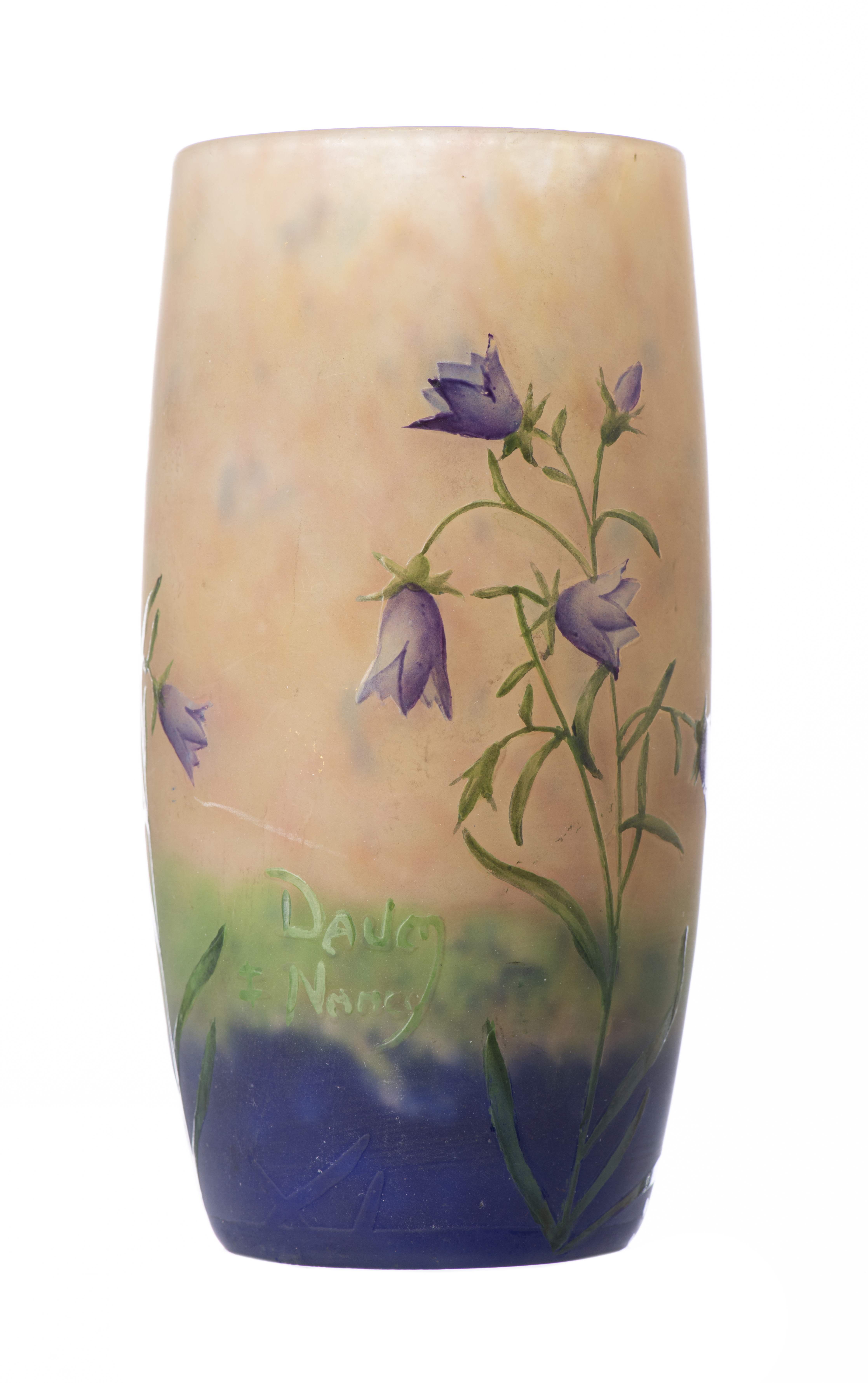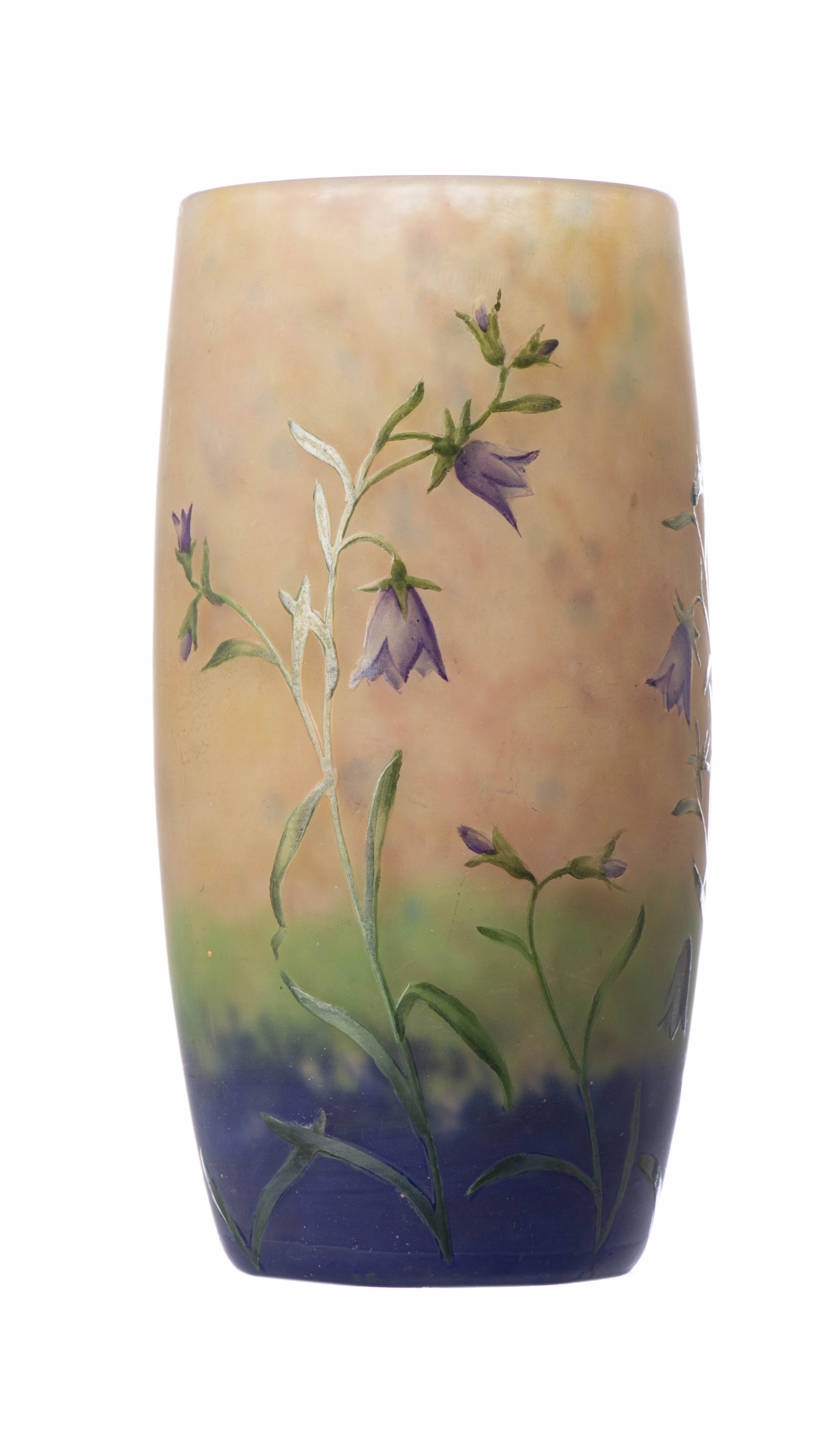 DAUM Nancy, Violettes, Vase gobelet en verre épais, fond jaune-rosé, bleu et vert jaspé de poudres intercalaires violette et rose. Décor émaillé de fleurs de violettes gravé en réserve.