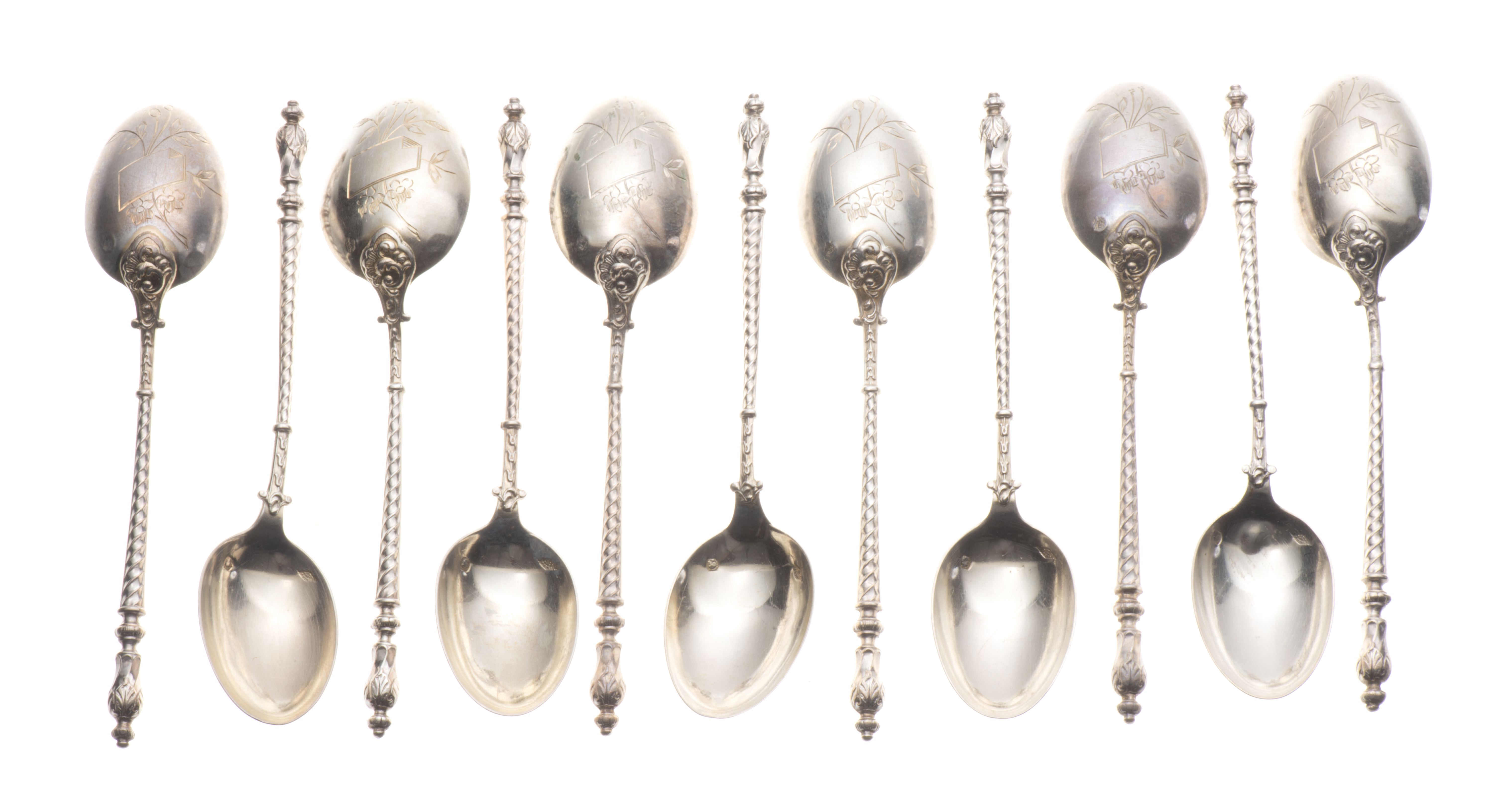 Onze cuillères à thé en argent français de 2e titre à manche torsadé d'époque Nap. III ou Henri IV.