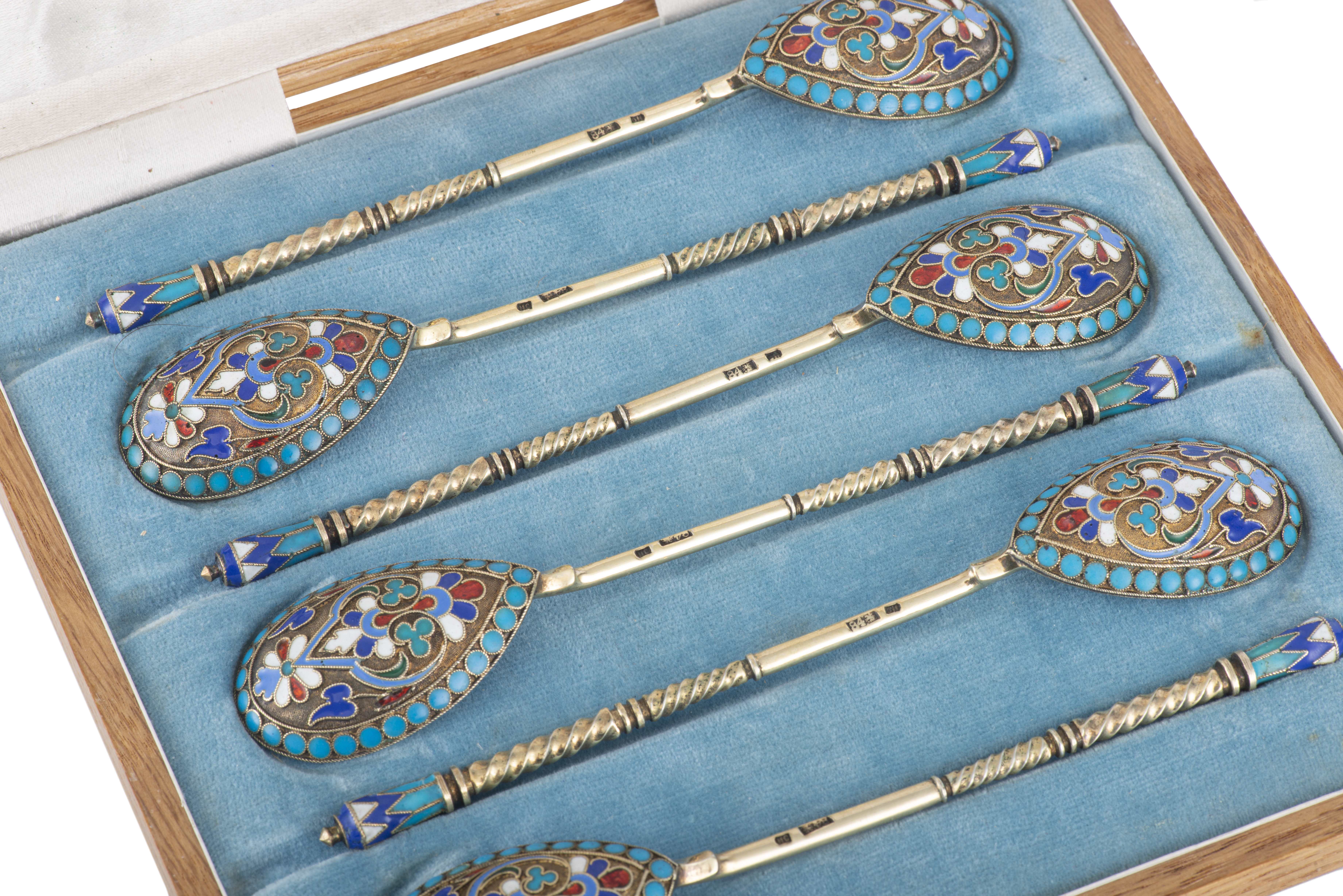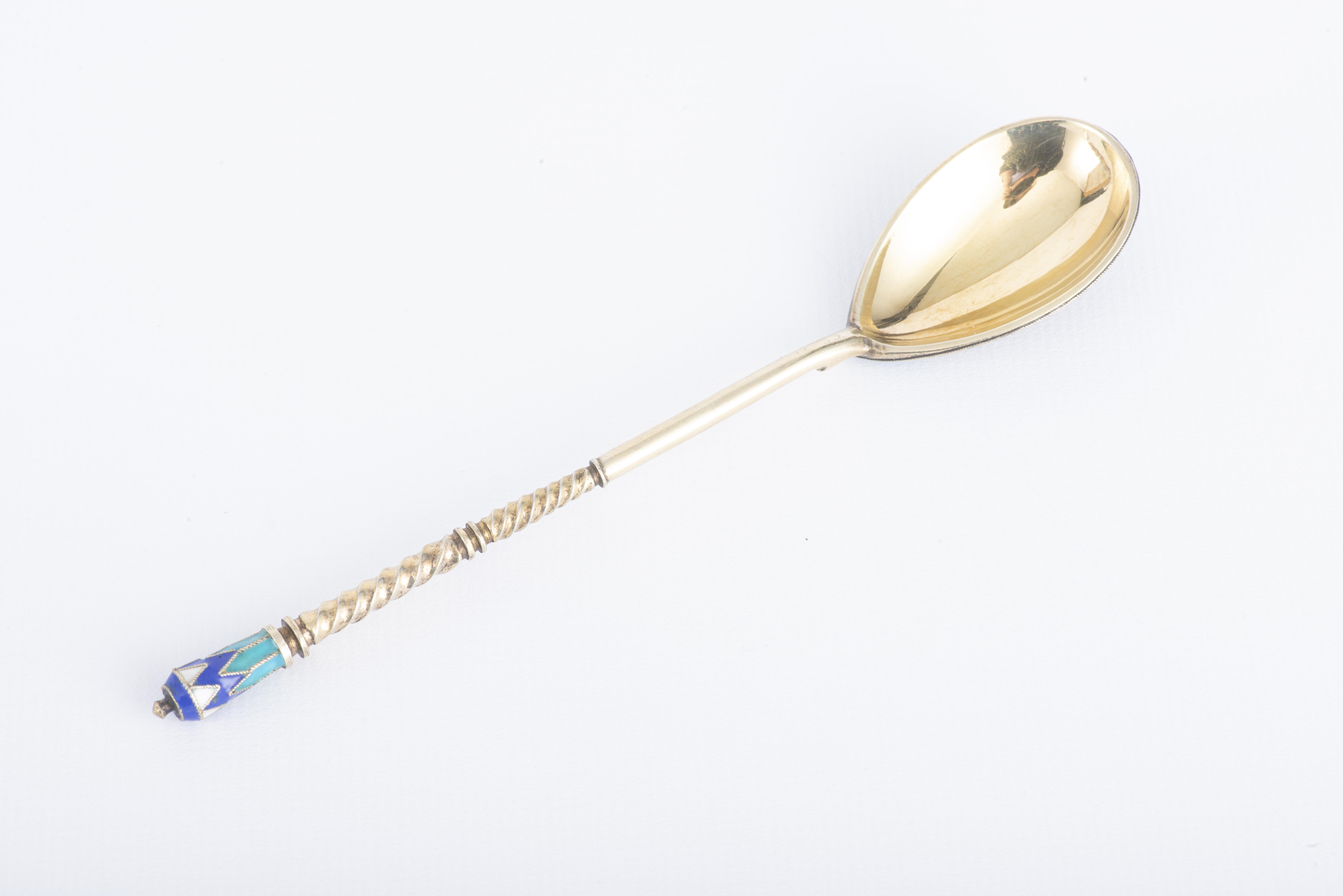 Lot de 6 cuillères en argent russe émaillé et vermeil à 84 zolotnics mon. ИС.