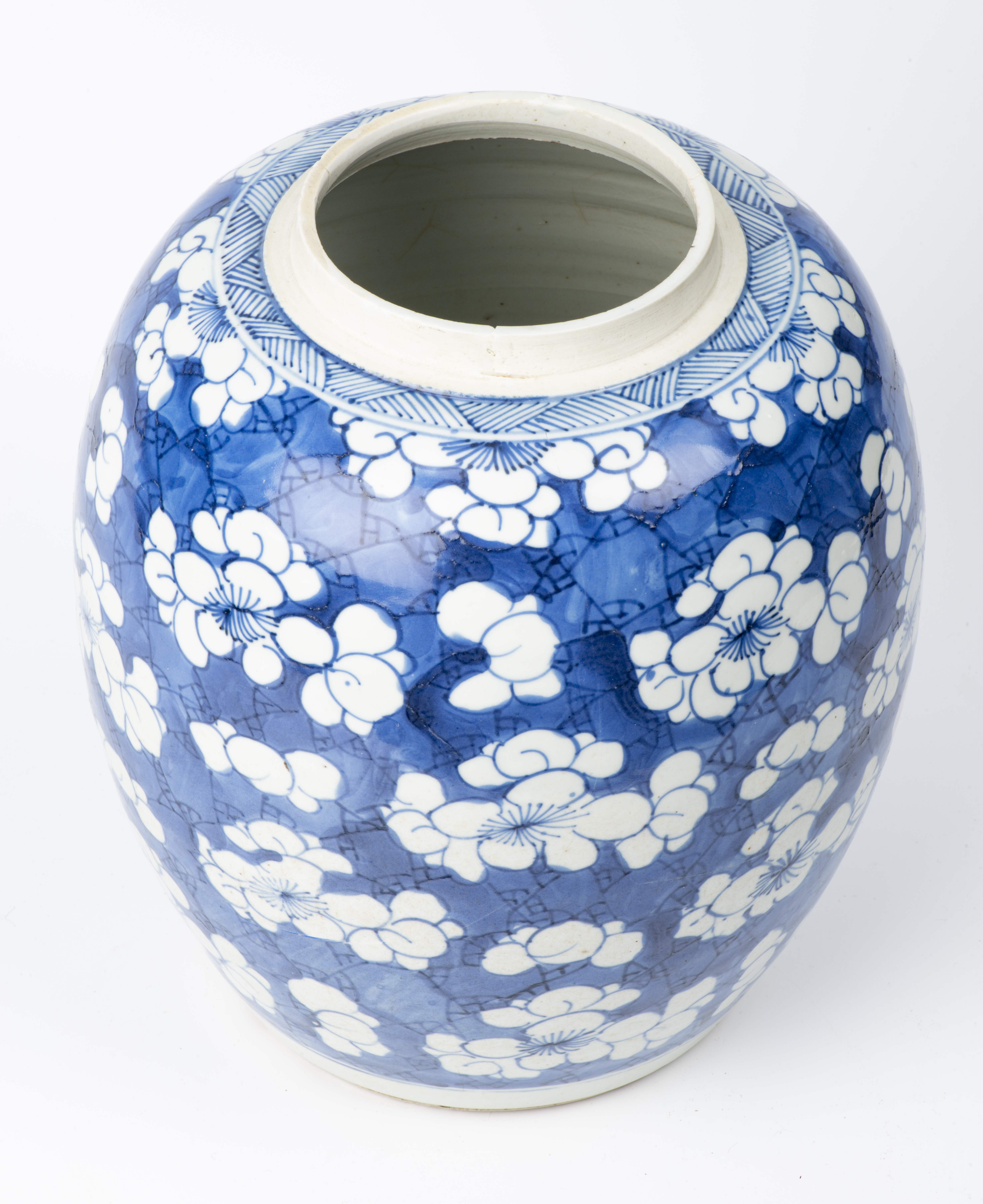 Pot à gingembre en porcelaine de Chine à couverte en bleu & blanc de fleurs de prunier sur champ de glace craquelée bleue. Epoque Kangxi.