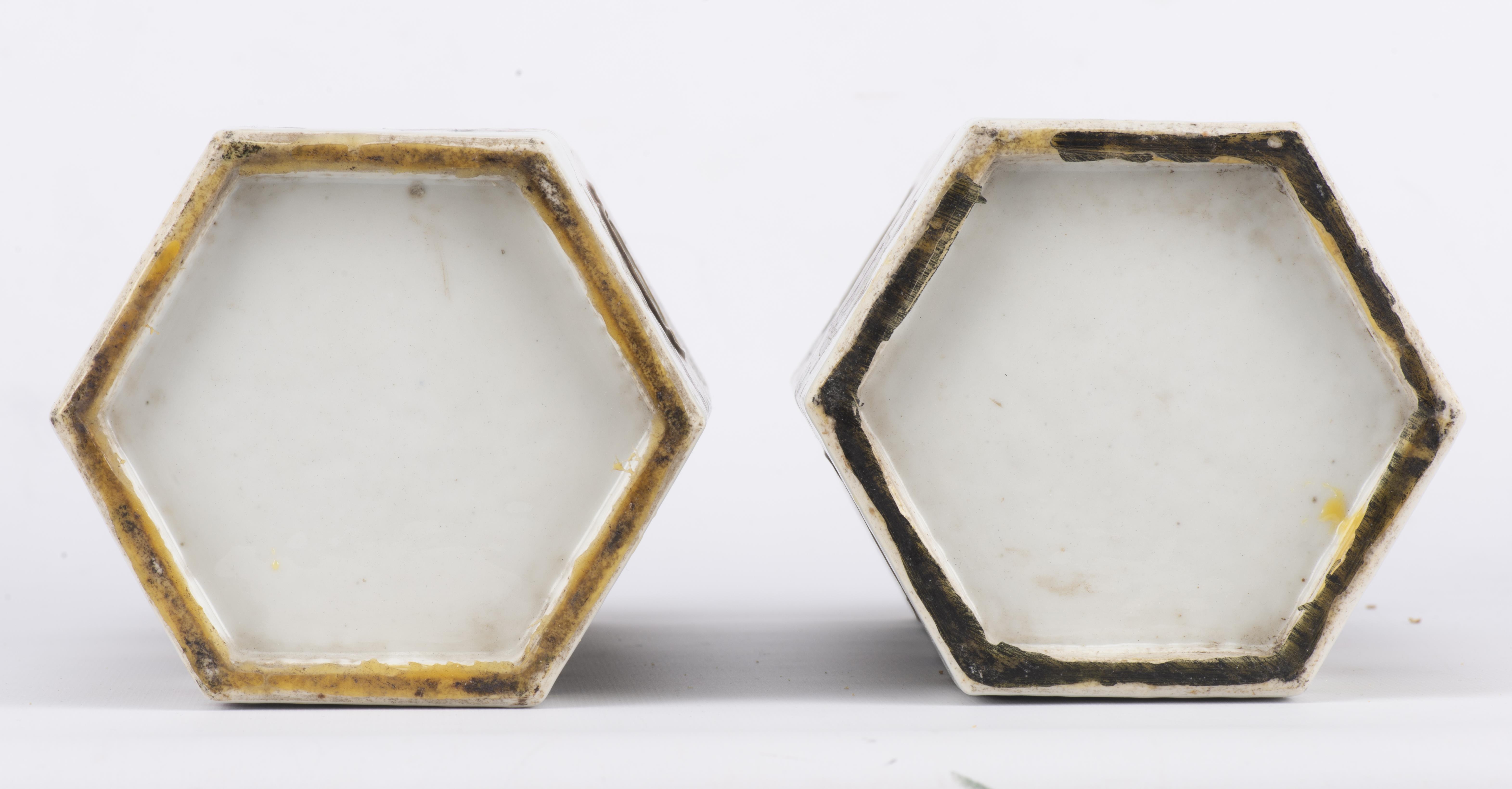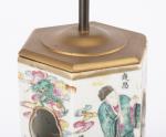 CHINE, Deux lampes de table à pieds hexagonaux en porcelaine de Chine à décor de personnages et animaux (anciens porte-chapeaux) avec ajourage. XIXe