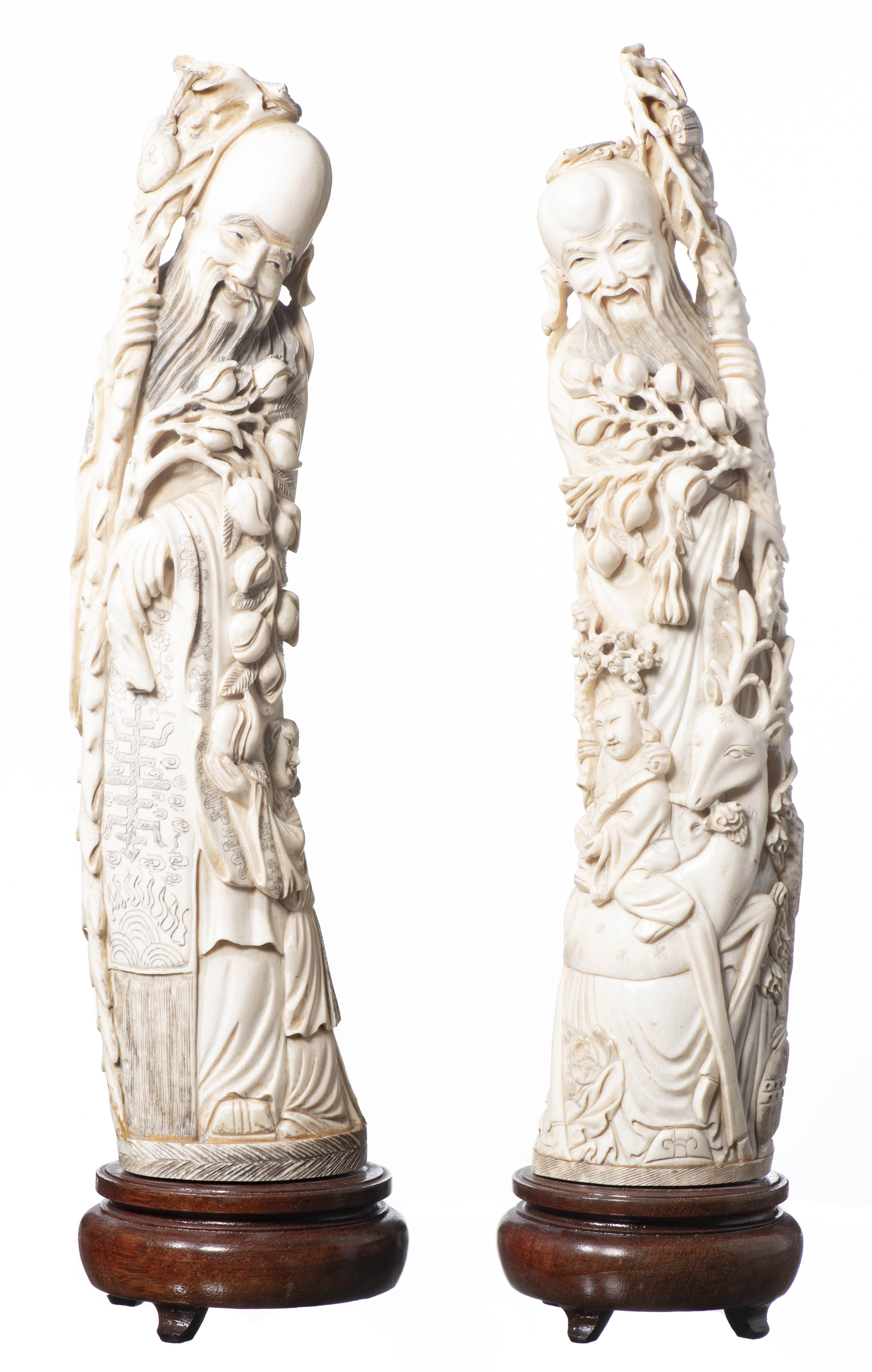 Deux Shoulao debout portant des branches de pêchers, l'un accompagné d'un enfant portant un ruyi et une branche de kakis assis sur un cerf tenant un lingzhi dans sa gueule pour l'un, et l'autre accompagné d'un enfant portant une grosse pêche de longévité.