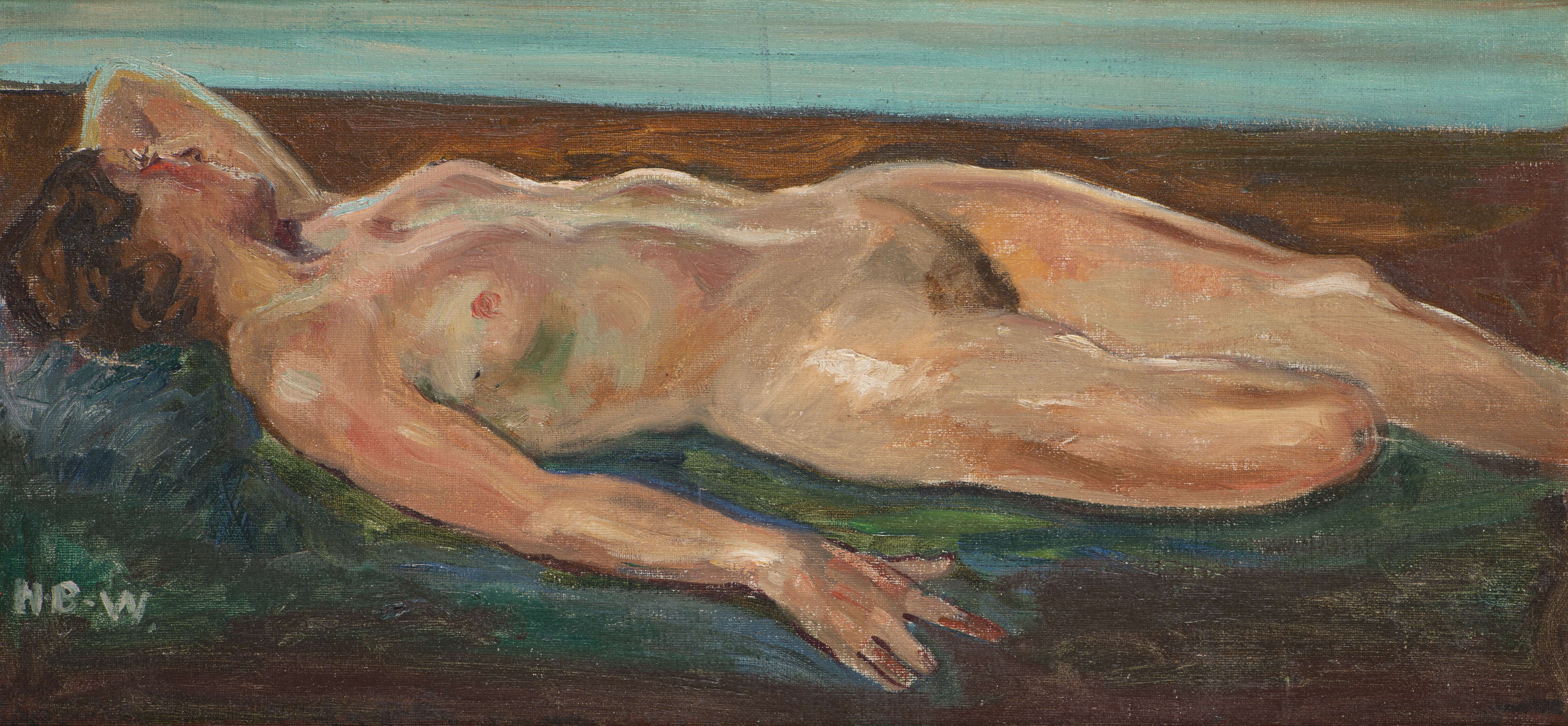 Anonyme (XXe), "Nu couché", huile sur toile contrecollé sur bois monogrammée bg NBW.