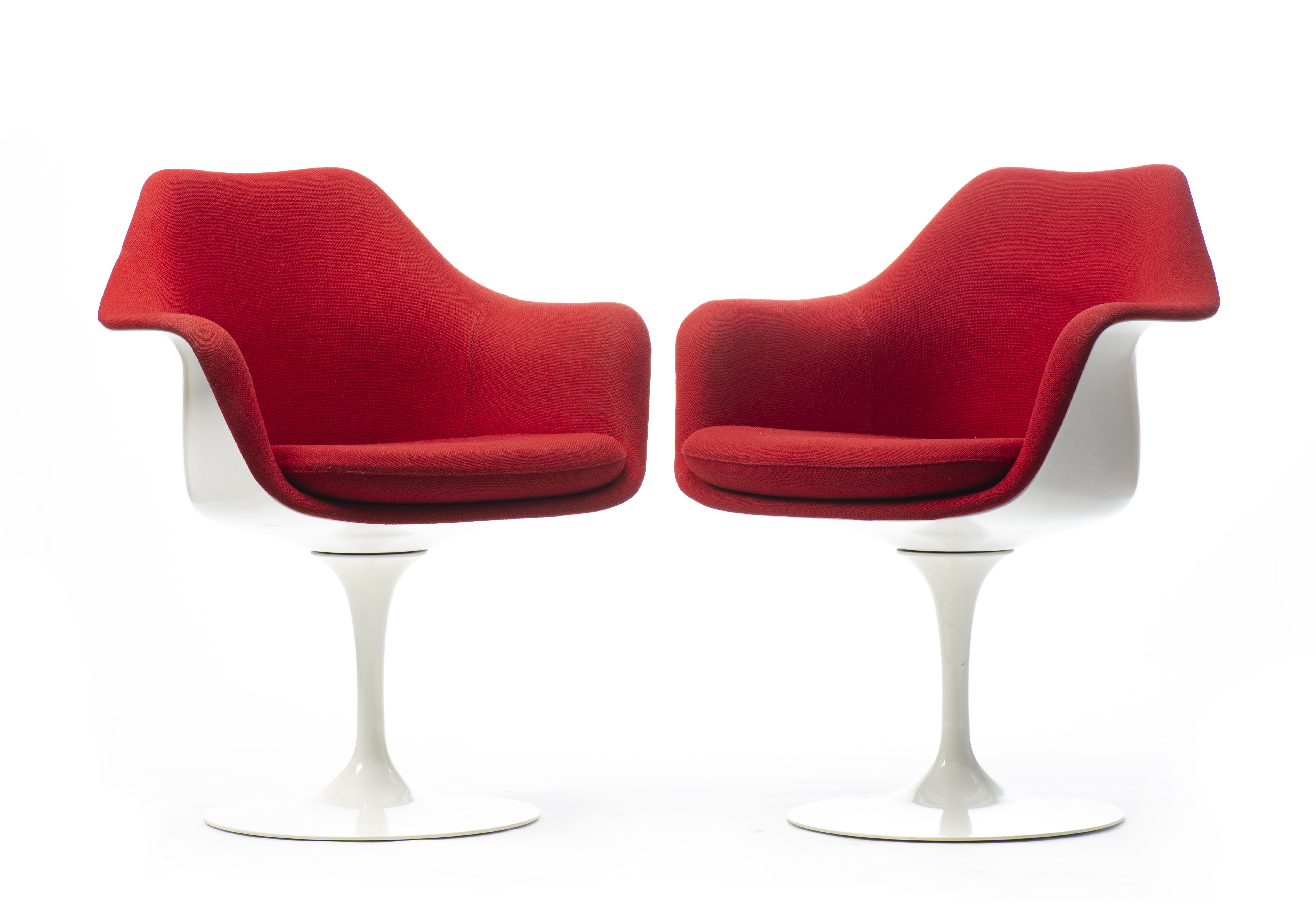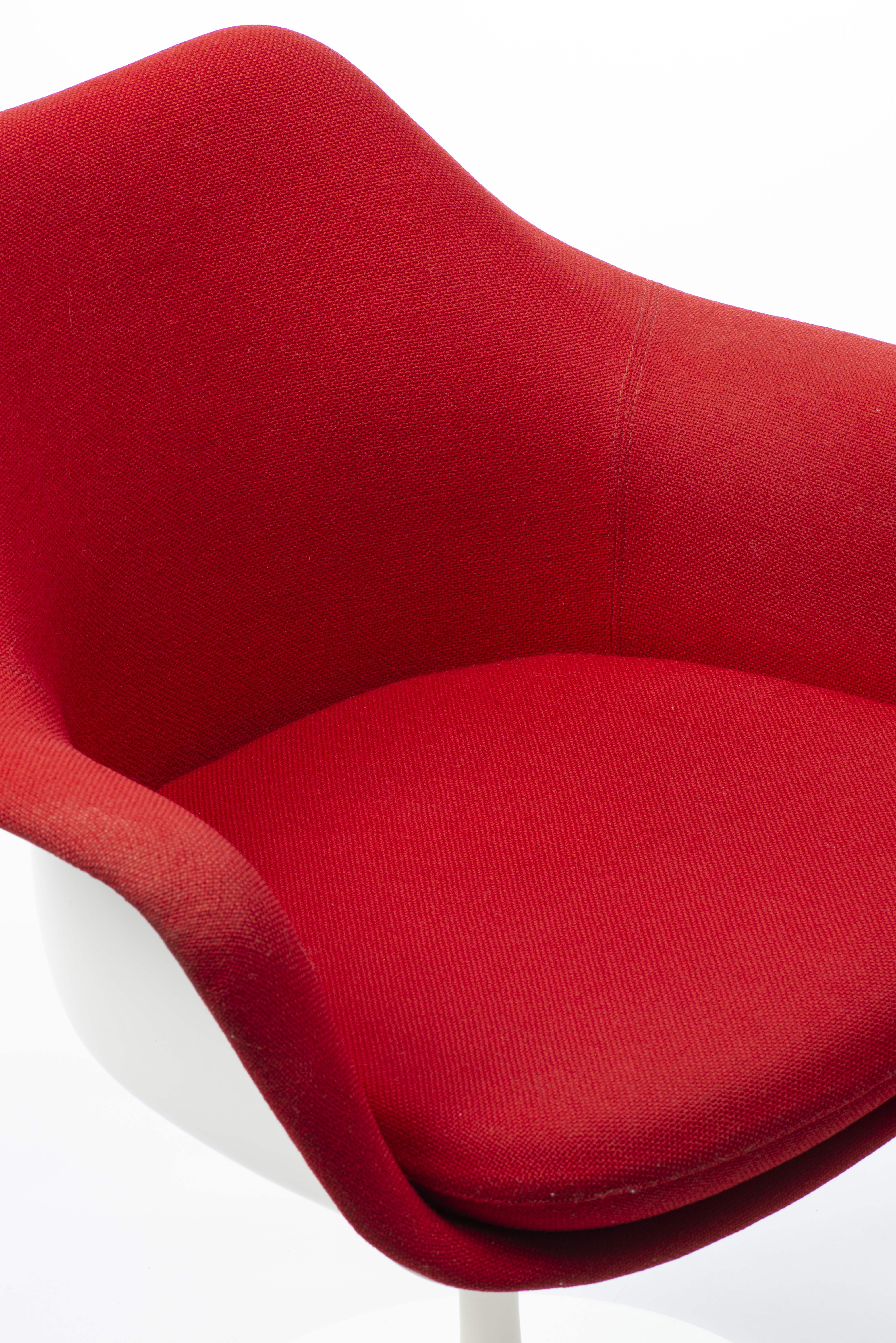 Deux fauteuils "Tulipe" à assise et dossier recouverts de tissu Hallingdal rouge. 80,5 x 49,5 x 54 cm
