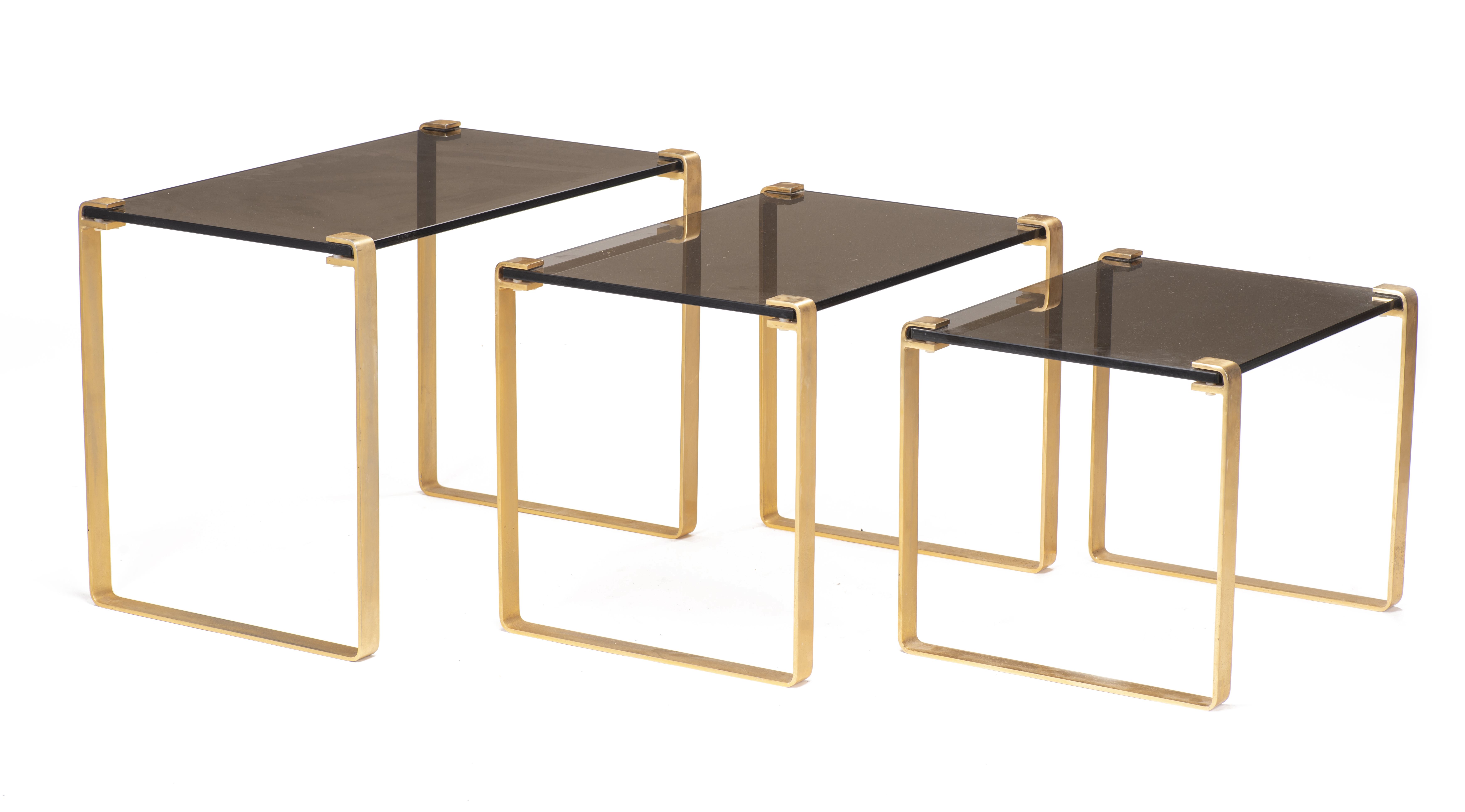 Travail des années 70, suite de trois tables gigognes. Piètement en laiton et plateau en verre fumé, vers 1970.