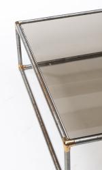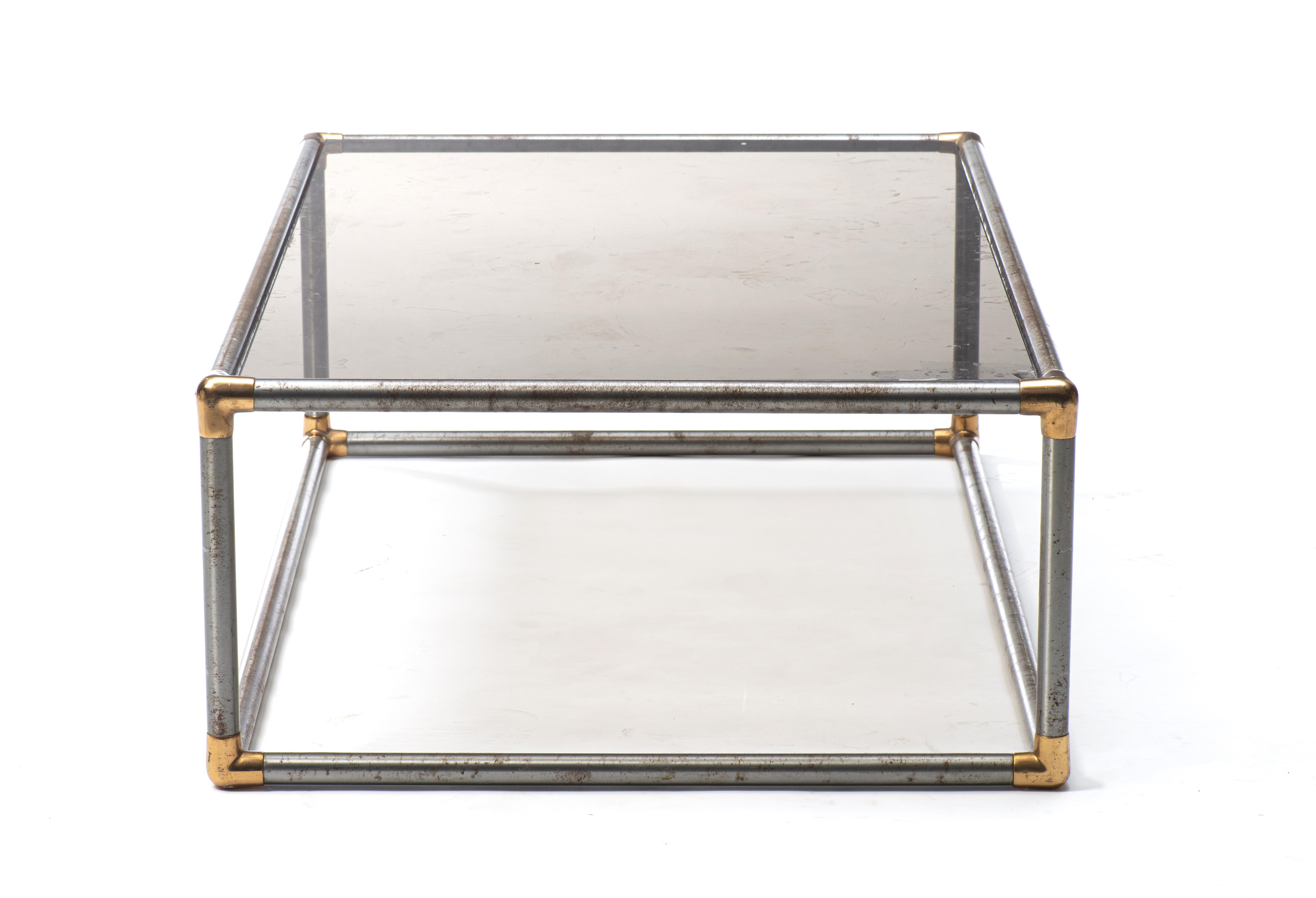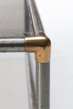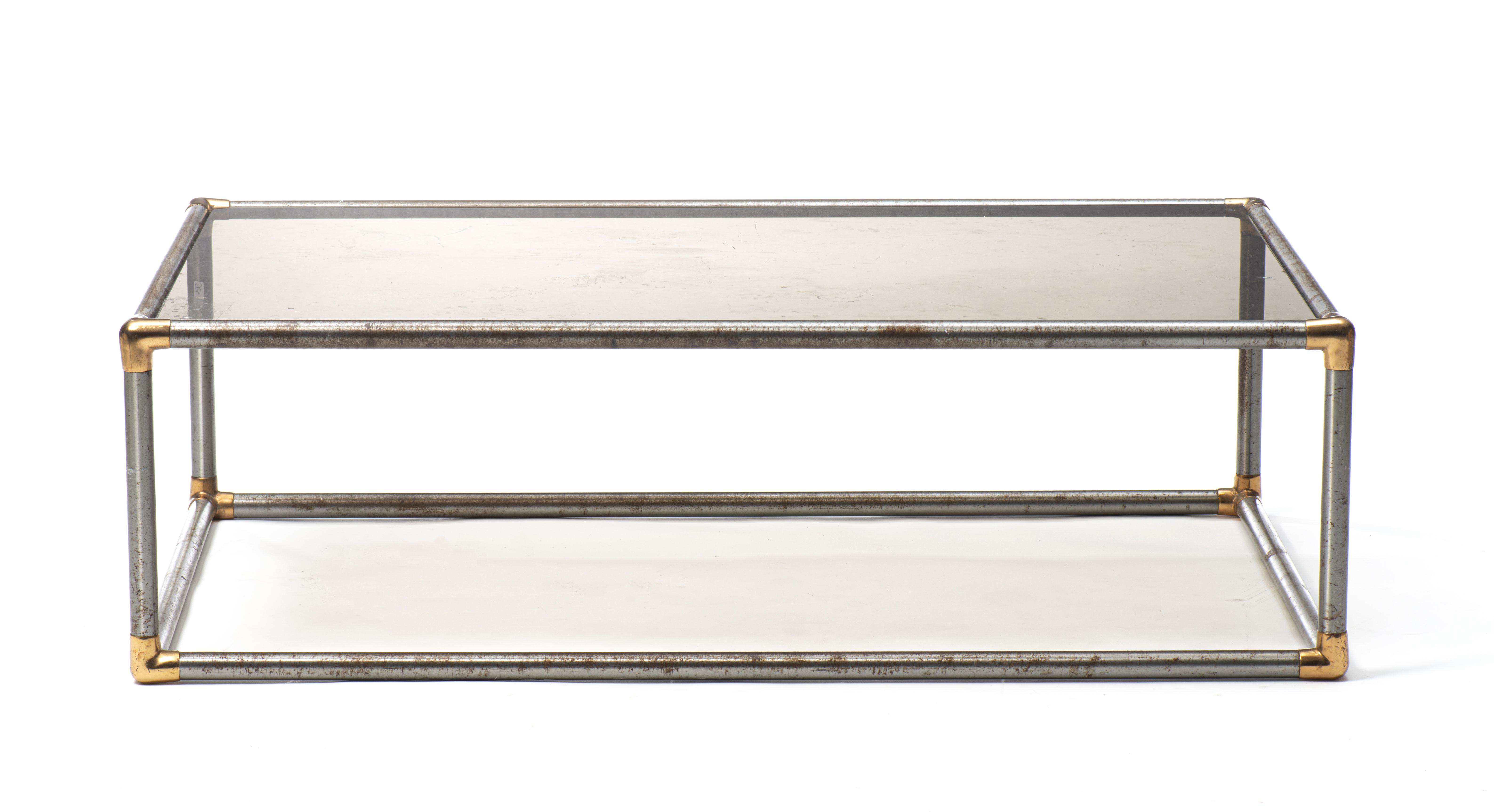 Table basse rectangulaire moderniste en fer, laiton et verre, vers 1950.