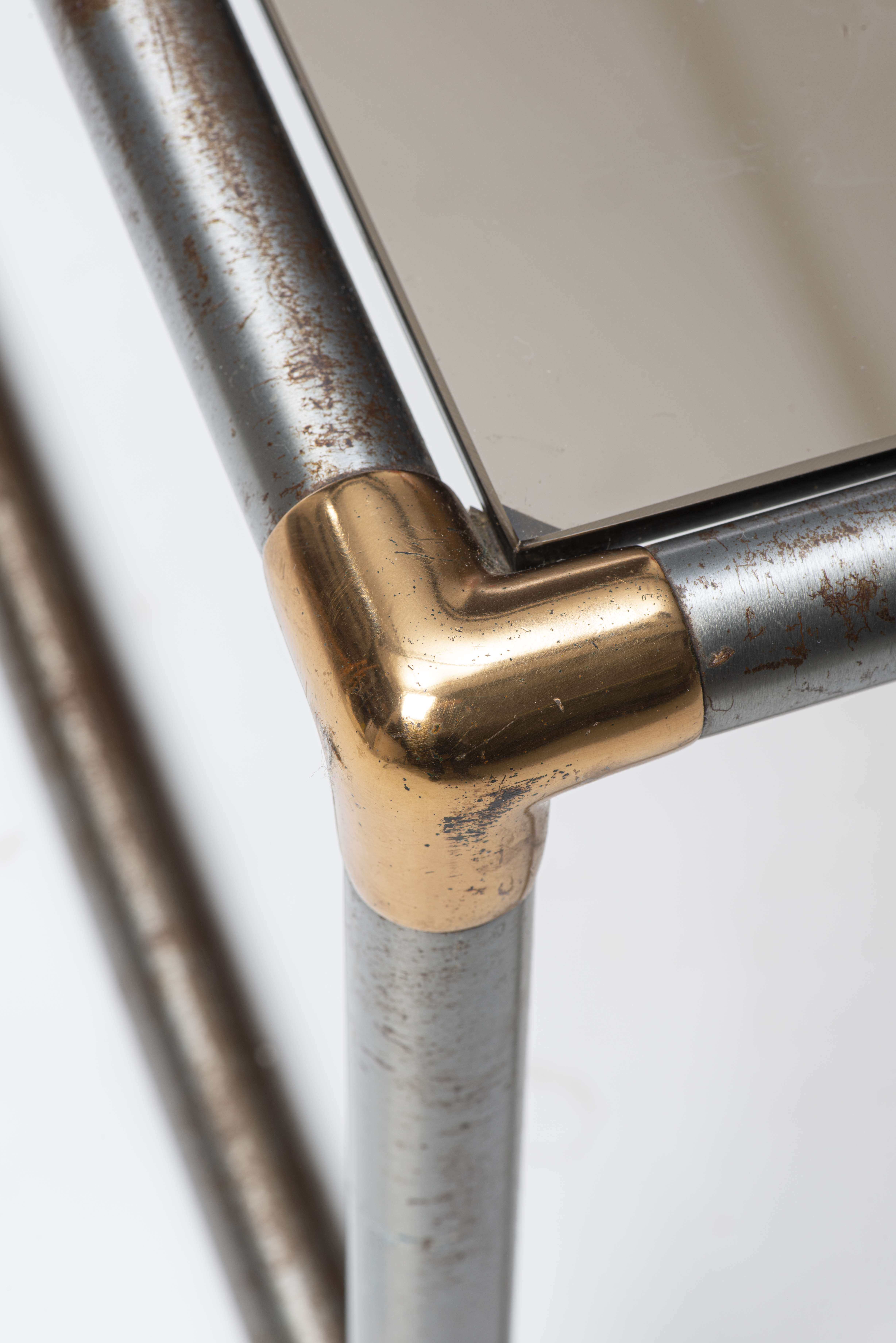 Travail des années 50, Table basse moderniste en fer, laiton et verre