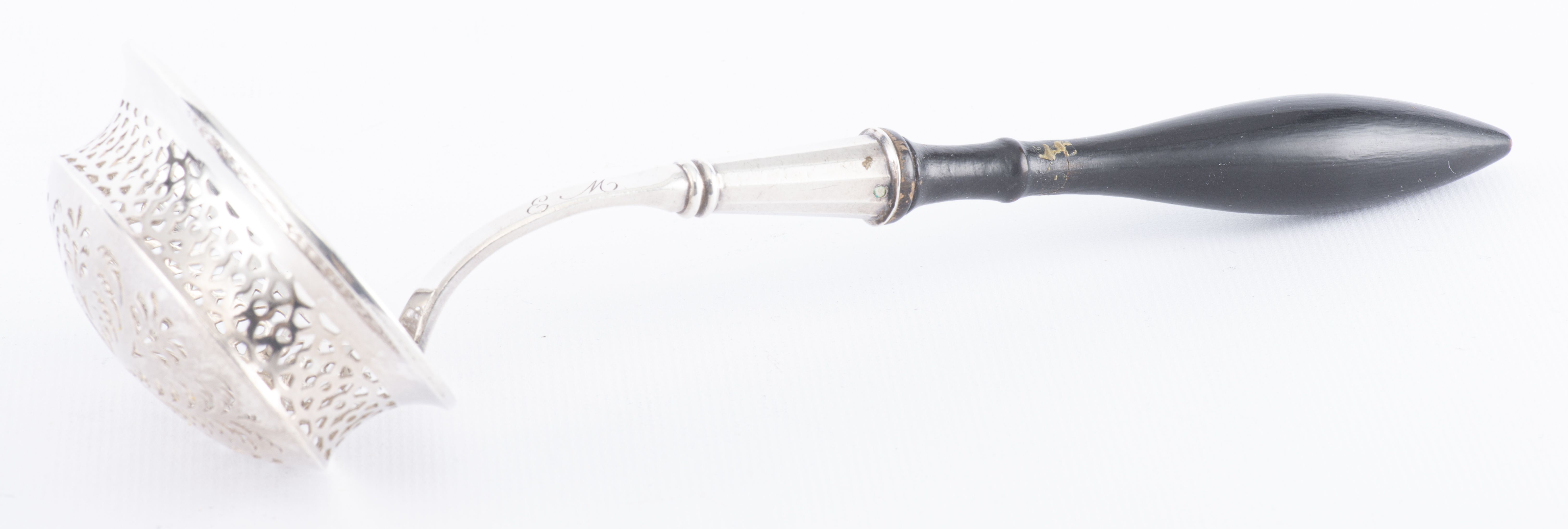Saupoudreuse à manche en argent 1er titre du Vieux Lausanne par F. Gelly, manche en poirier noirci. Monogrammé EM.