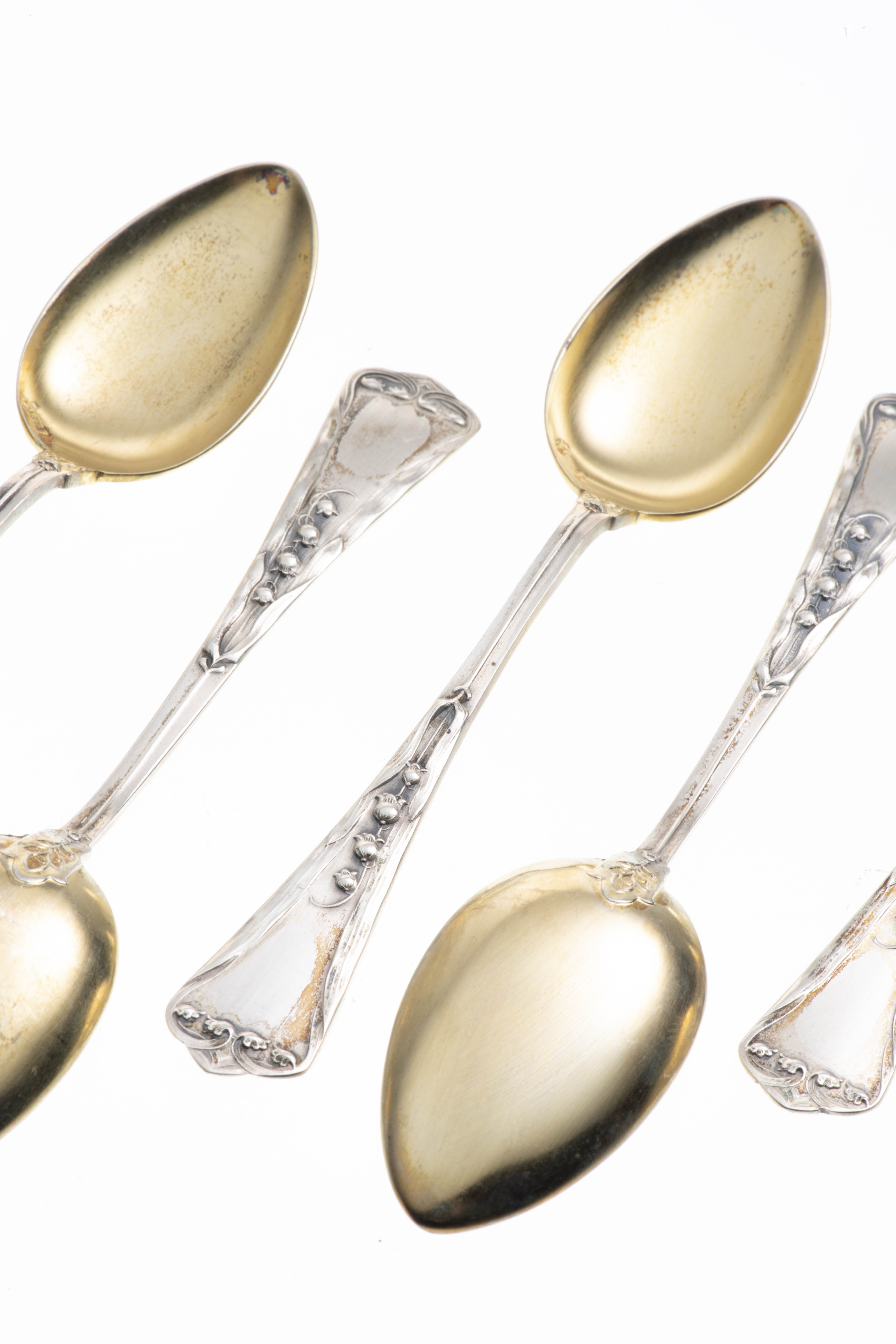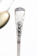 JEZLER, Neuf cuillères à moka en argent .800 modèle Muguet avec cuilleron en vermeil.