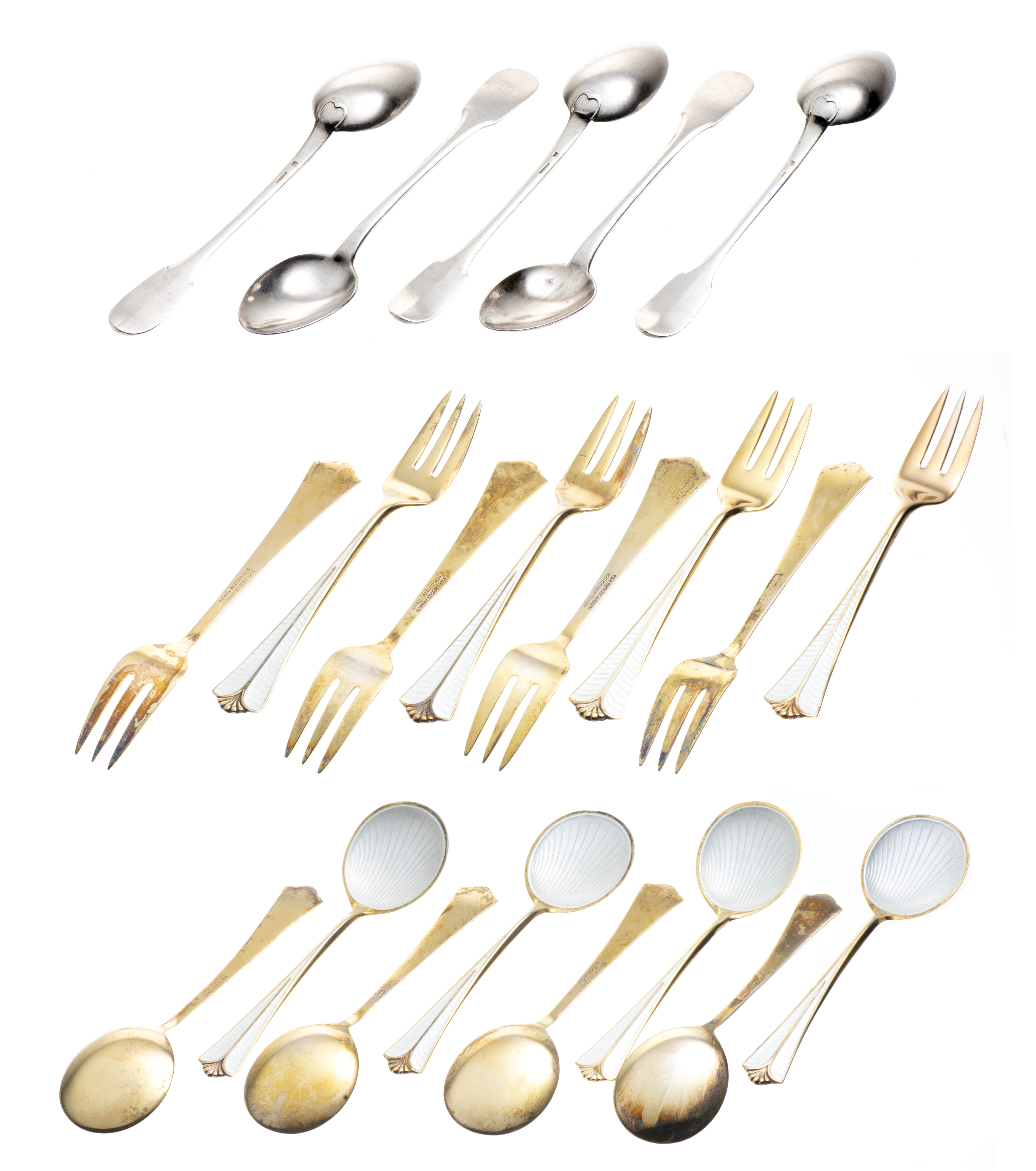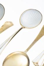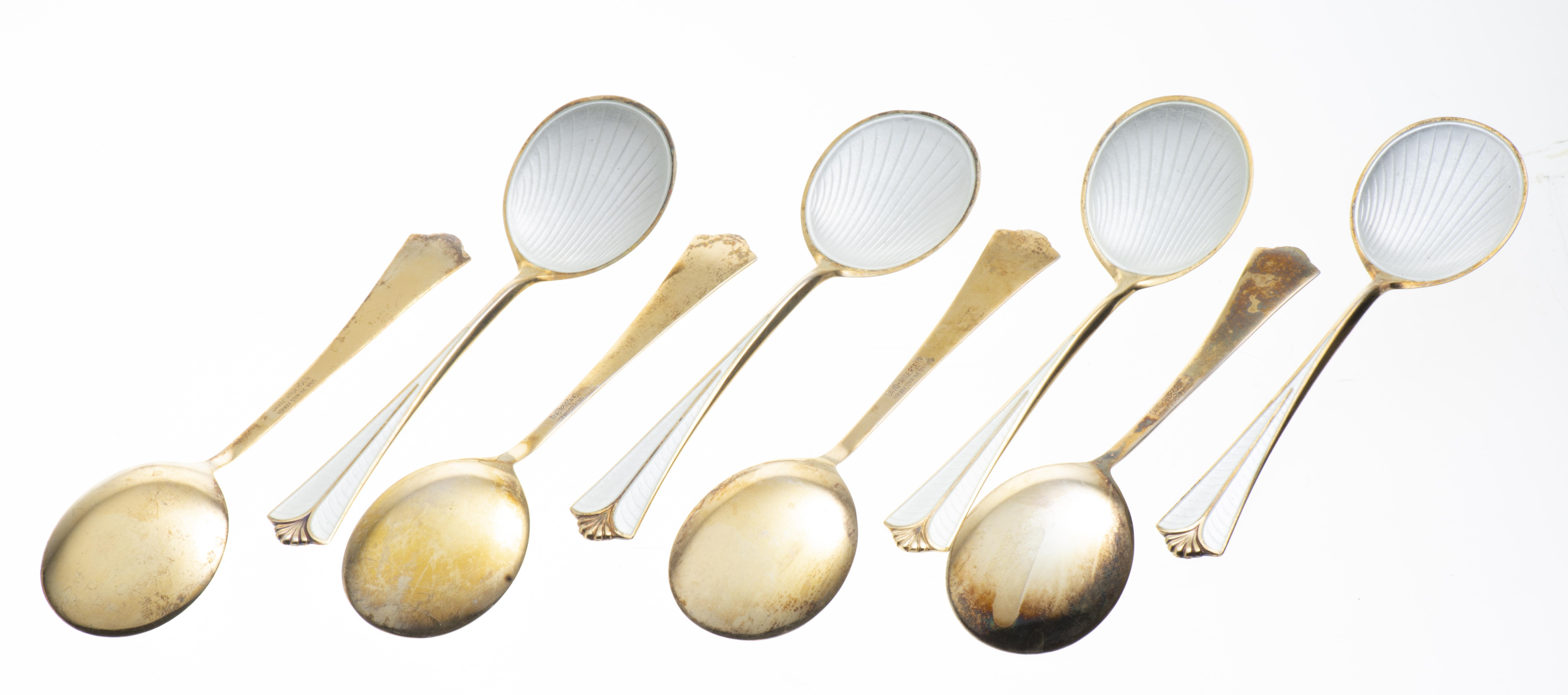 David-Andersen, Karl Johans Gate 20, Oslo Norway, 8 fourchettes et 8 cuillères à dessert en argent sterling .925 vermeil à décor en émail argent de coquillage.