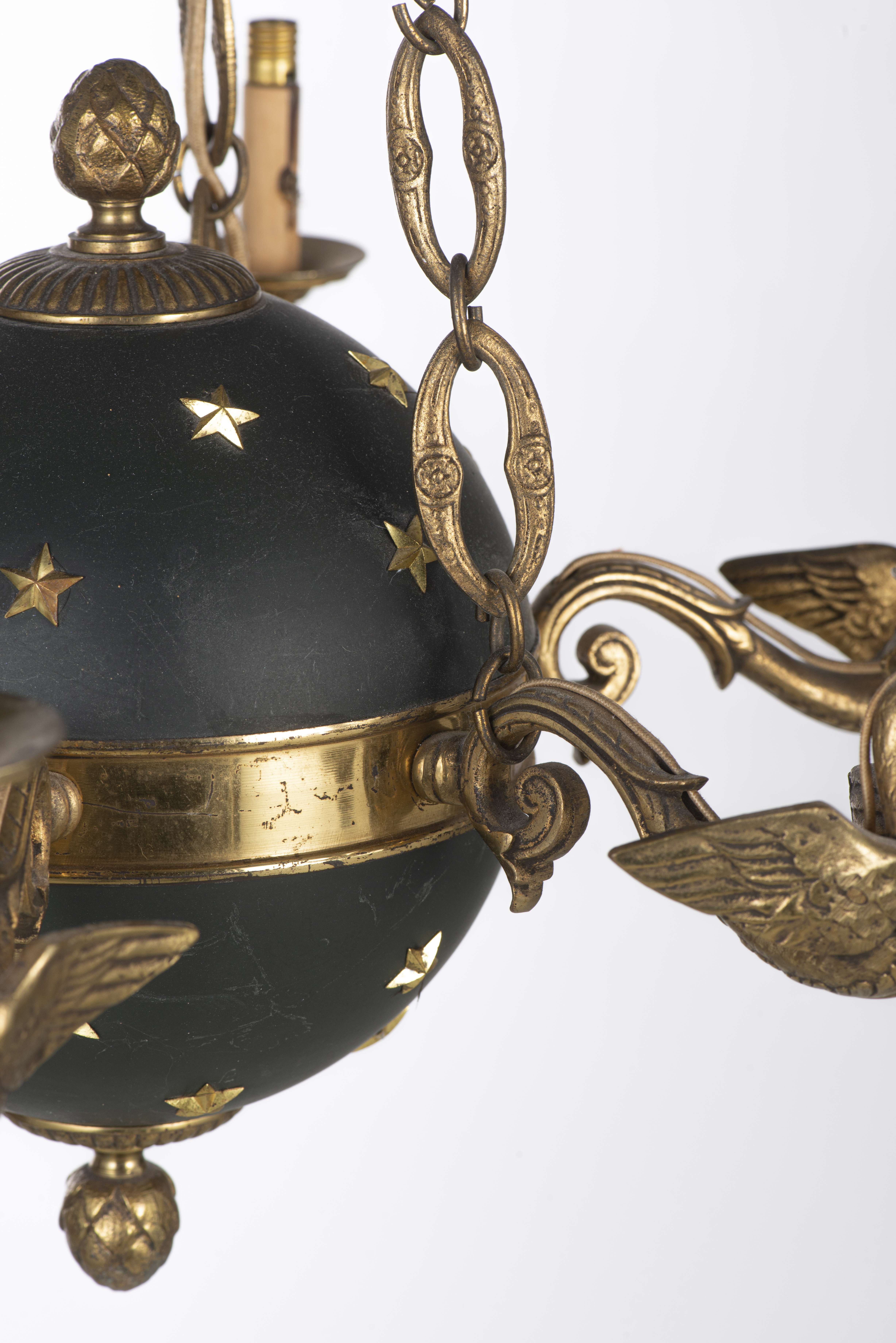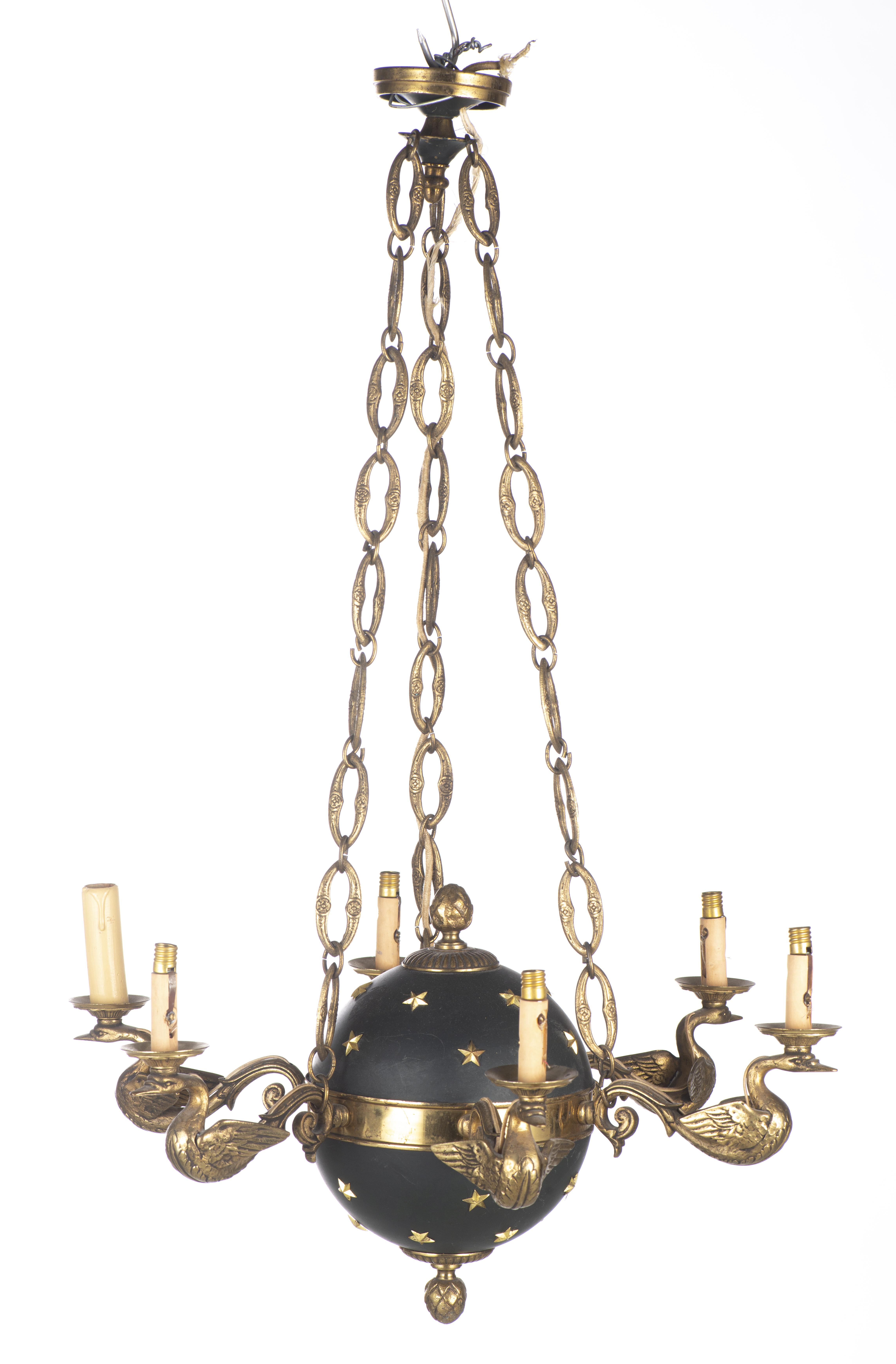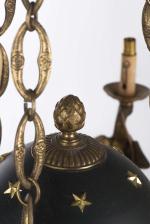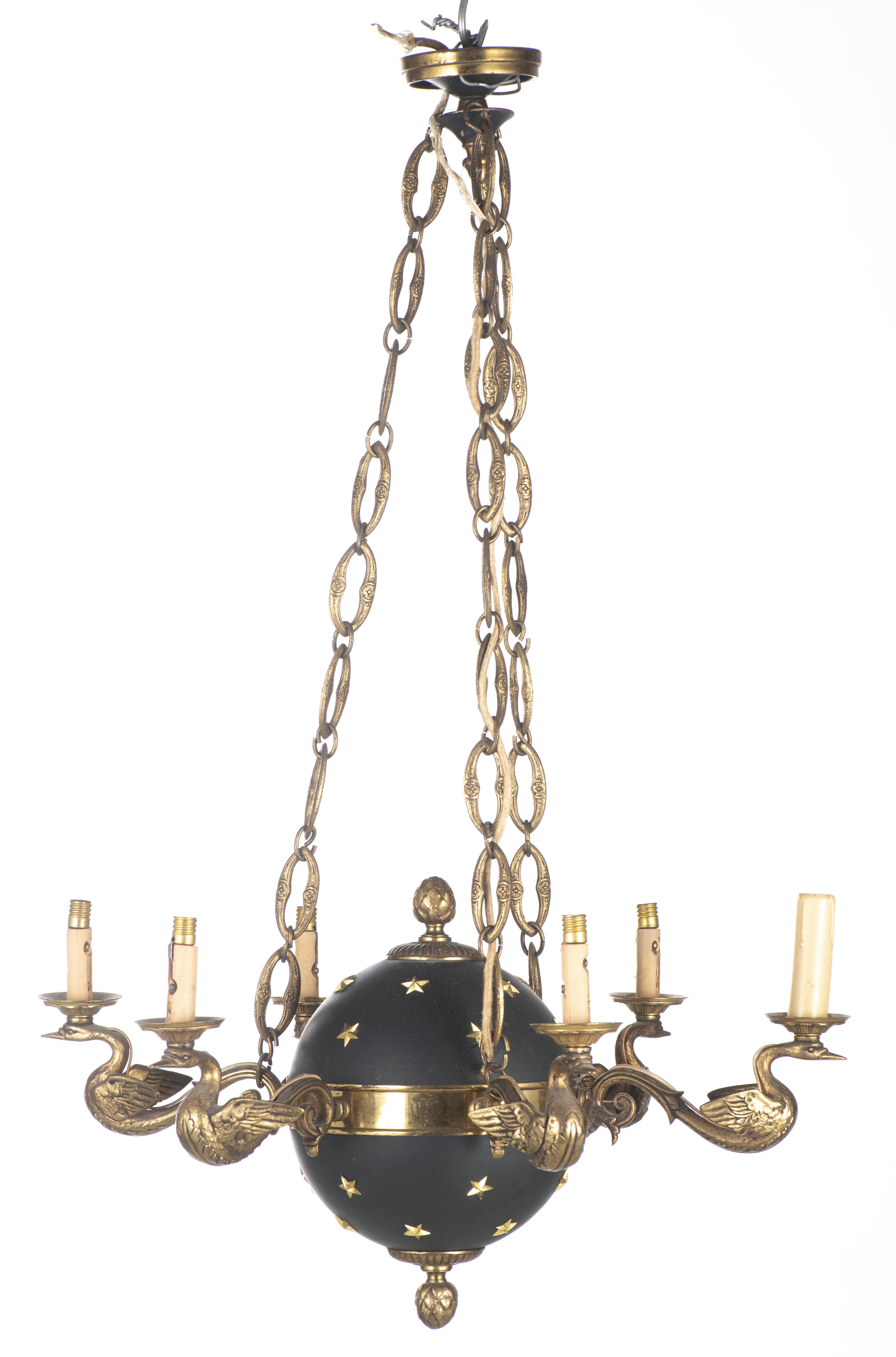 Maison JANSEN, attribué à, lustre en laiton et métal peint en vert à six branches en forme de cygne supportant 6 flammes, centre en forme de boule étoilée, sur un axe terminé par deux pommes de pin.