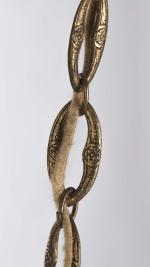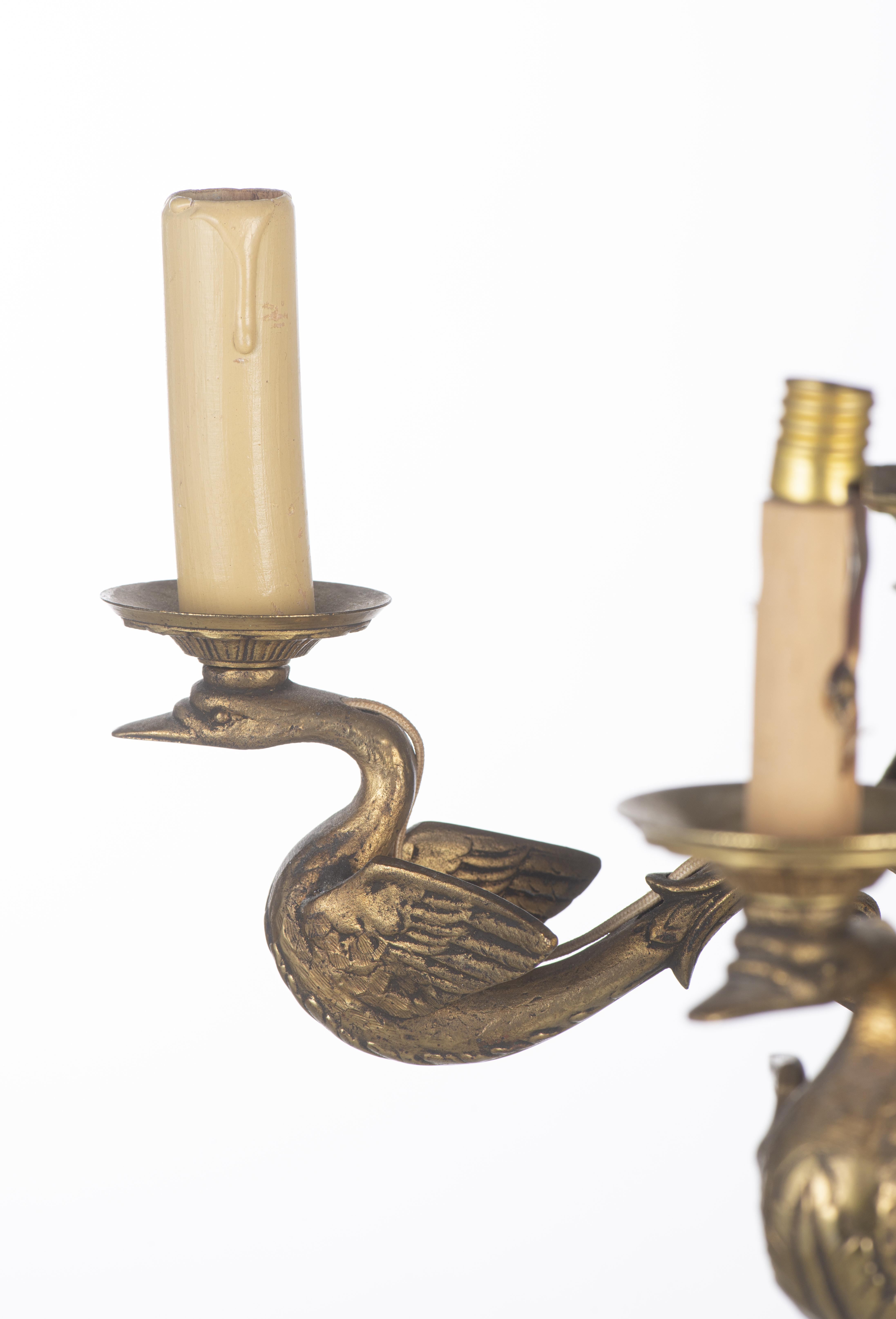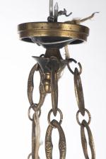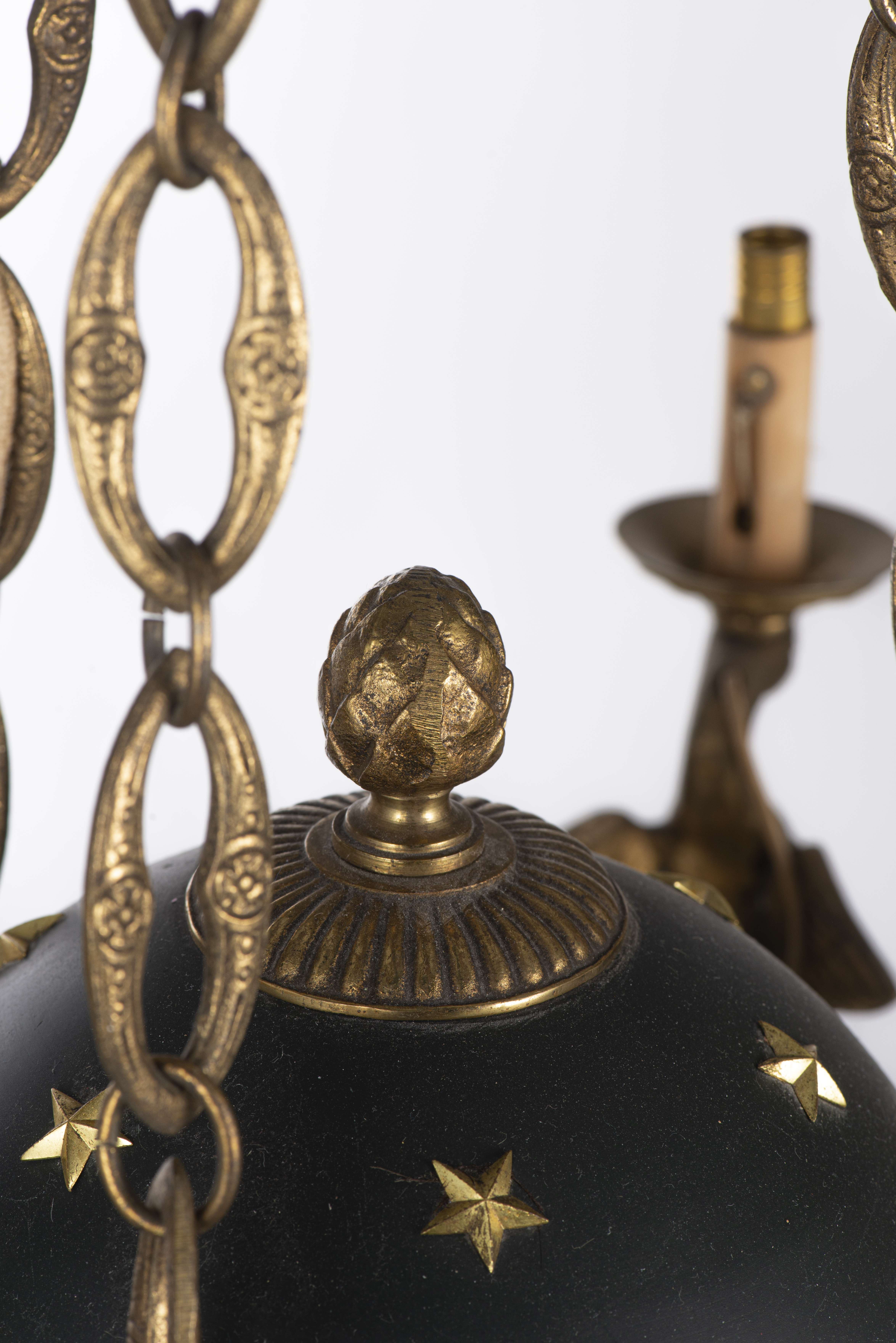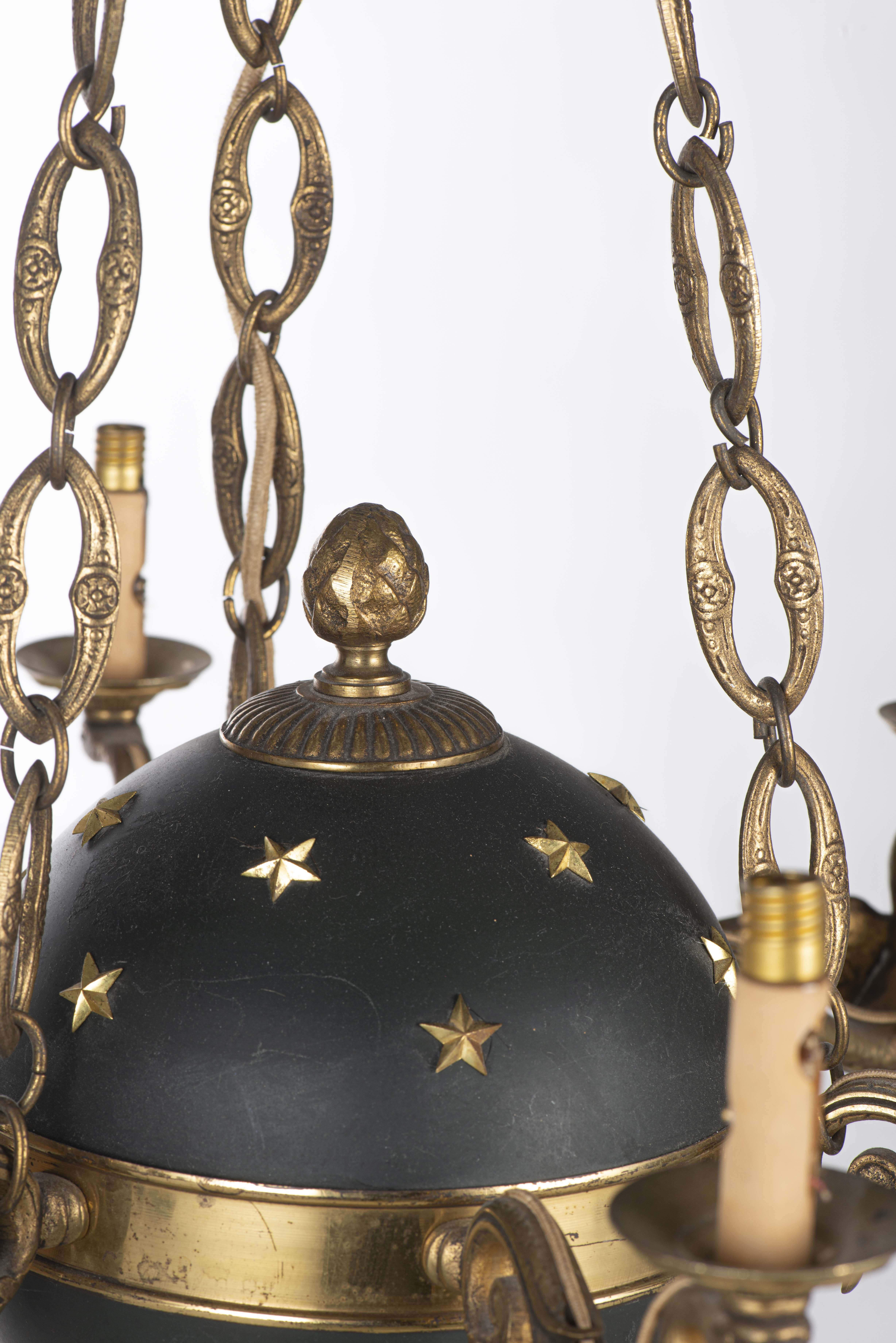 Maison JANSEN, attribué à, lustre en laiton et métal peint en vert à six branches en forme de cygne supportant 6 flammes, centre en forme de boule étoilée, sur un axe terminé par deux pommes de pin.