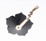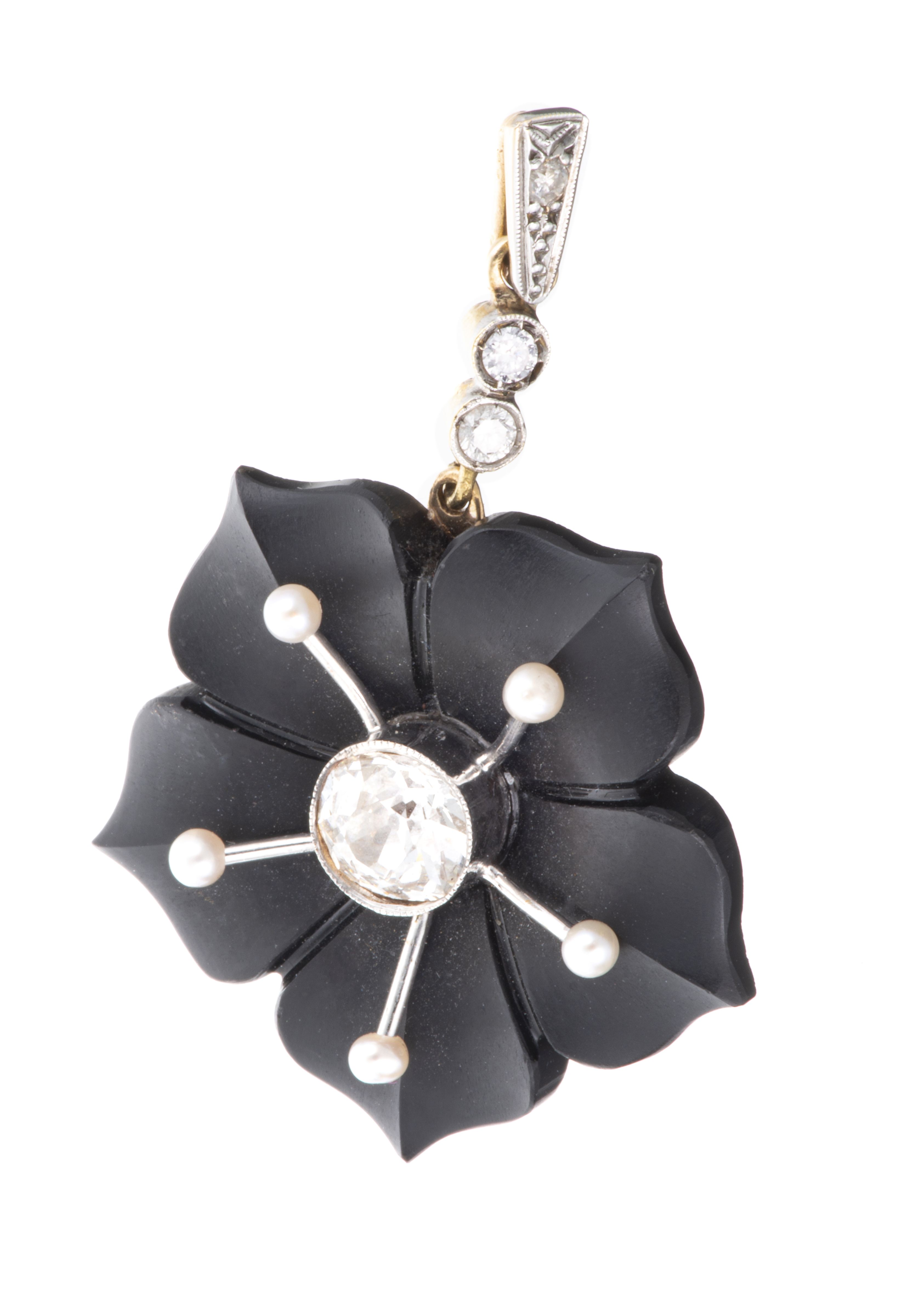 Pendentif fleur en onyx et or .750 orné au centre d'un diamant de taille ancienne de 1 ct et de pistils stylisés à 5 perles.