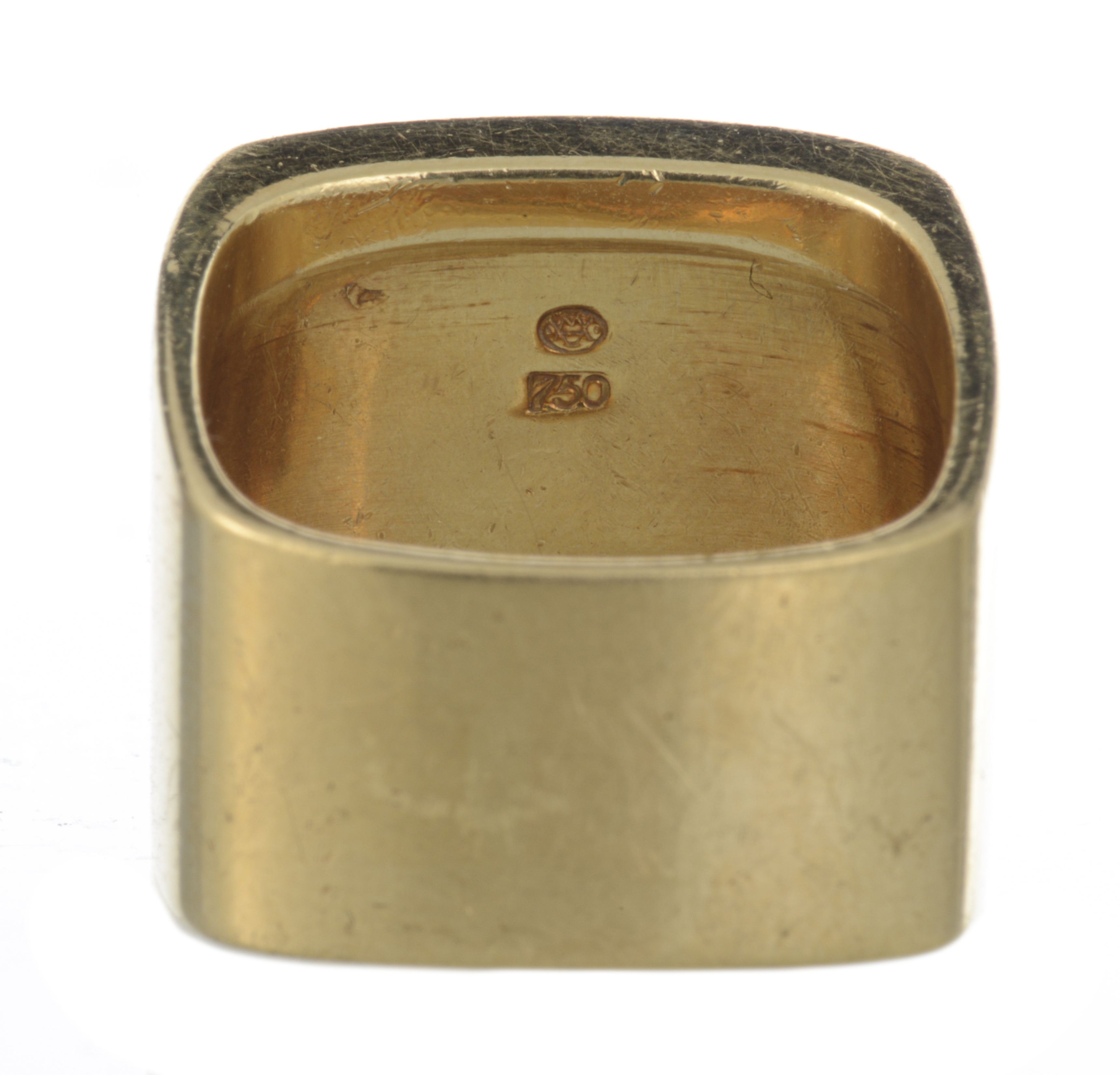 Bague chevalière carrée en or jaune .750 avec gravure d'un trèfle à quatre feuilles.