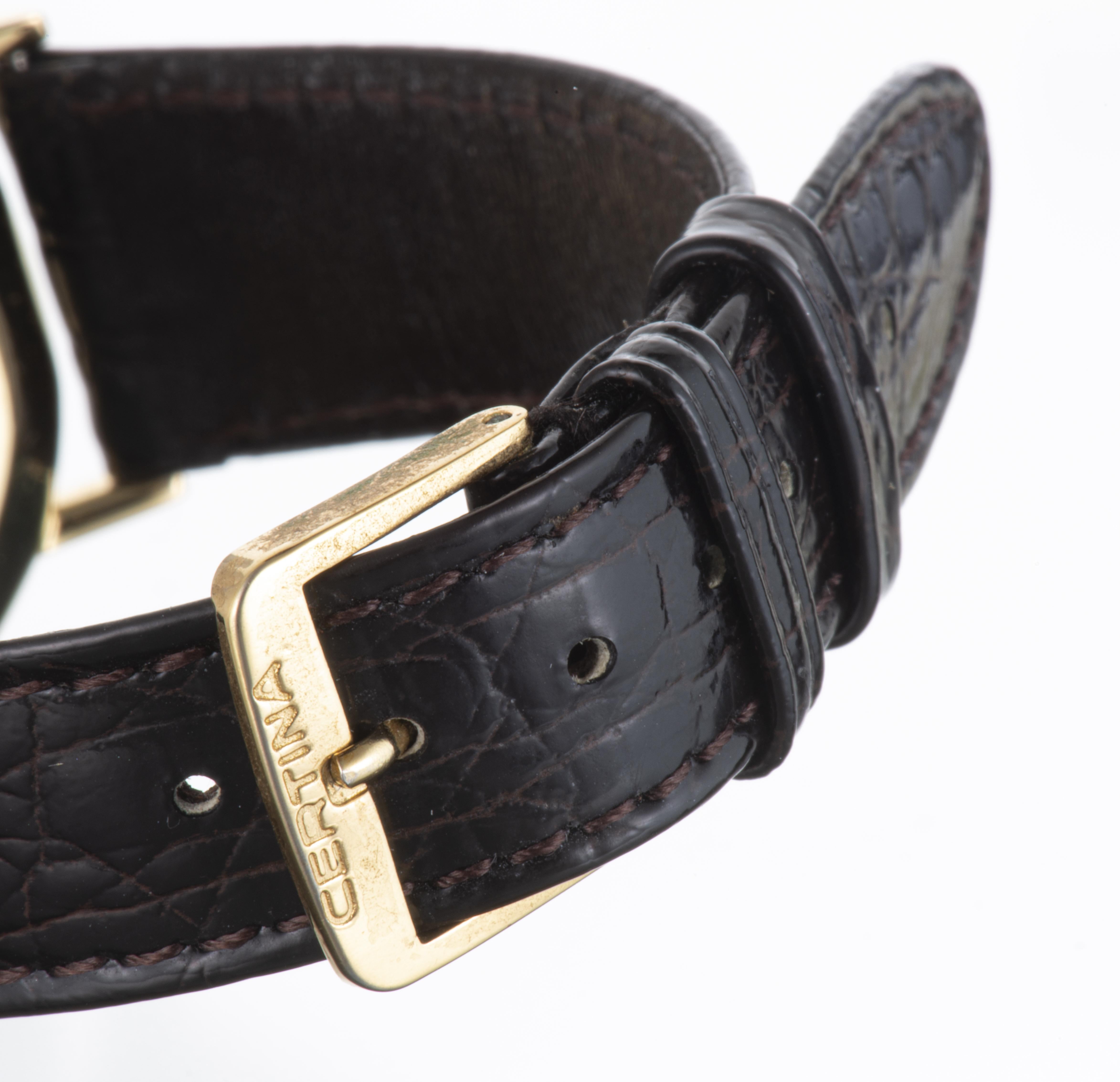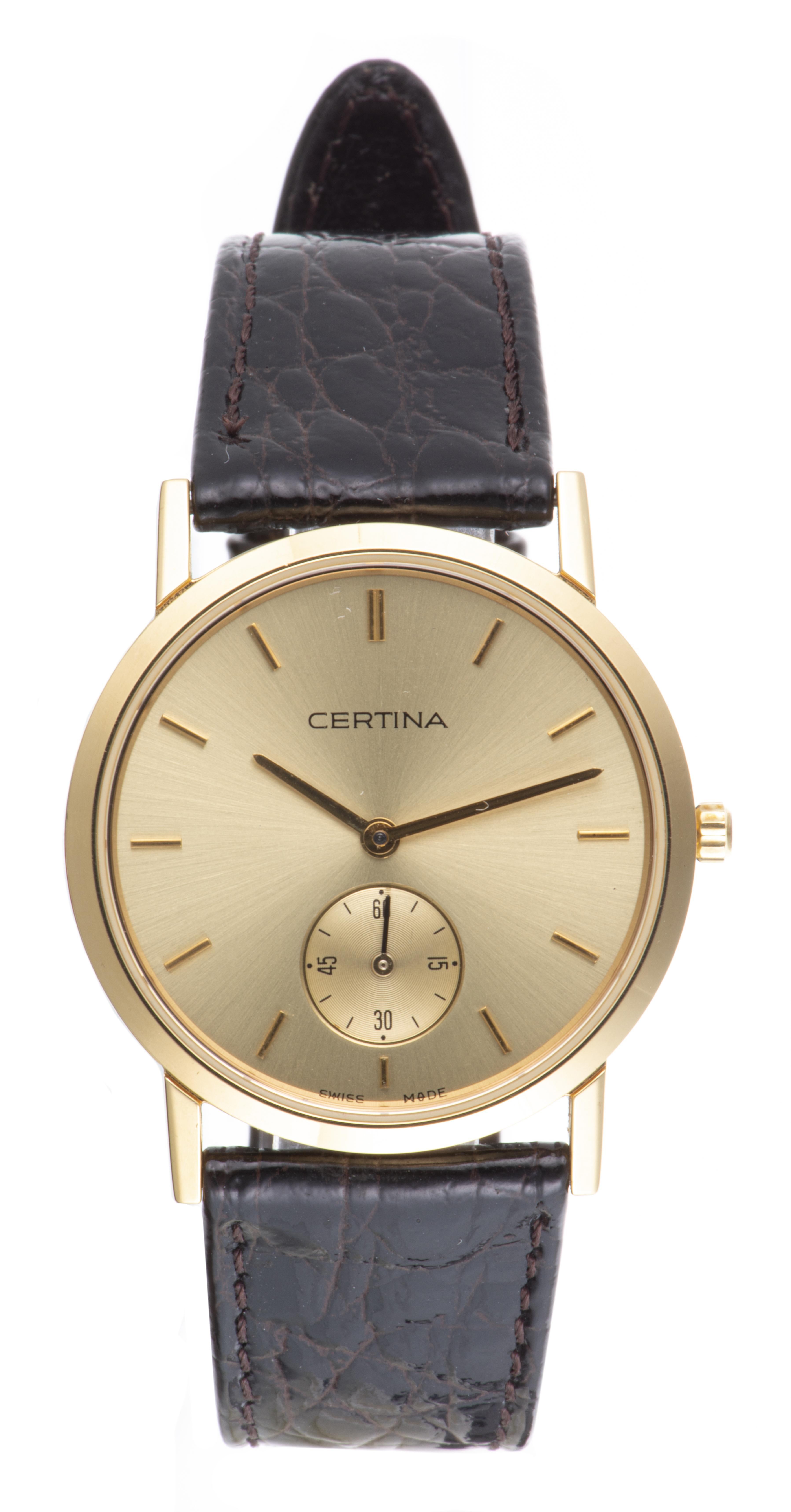 - montre-bracelet homme à quartz Certina plaqué or à cadran aune et aiguille des secondes à 6h avec verre "saphire crystal" n° EOL 176 1040 26B (dans une pochette Zircon Swiss).