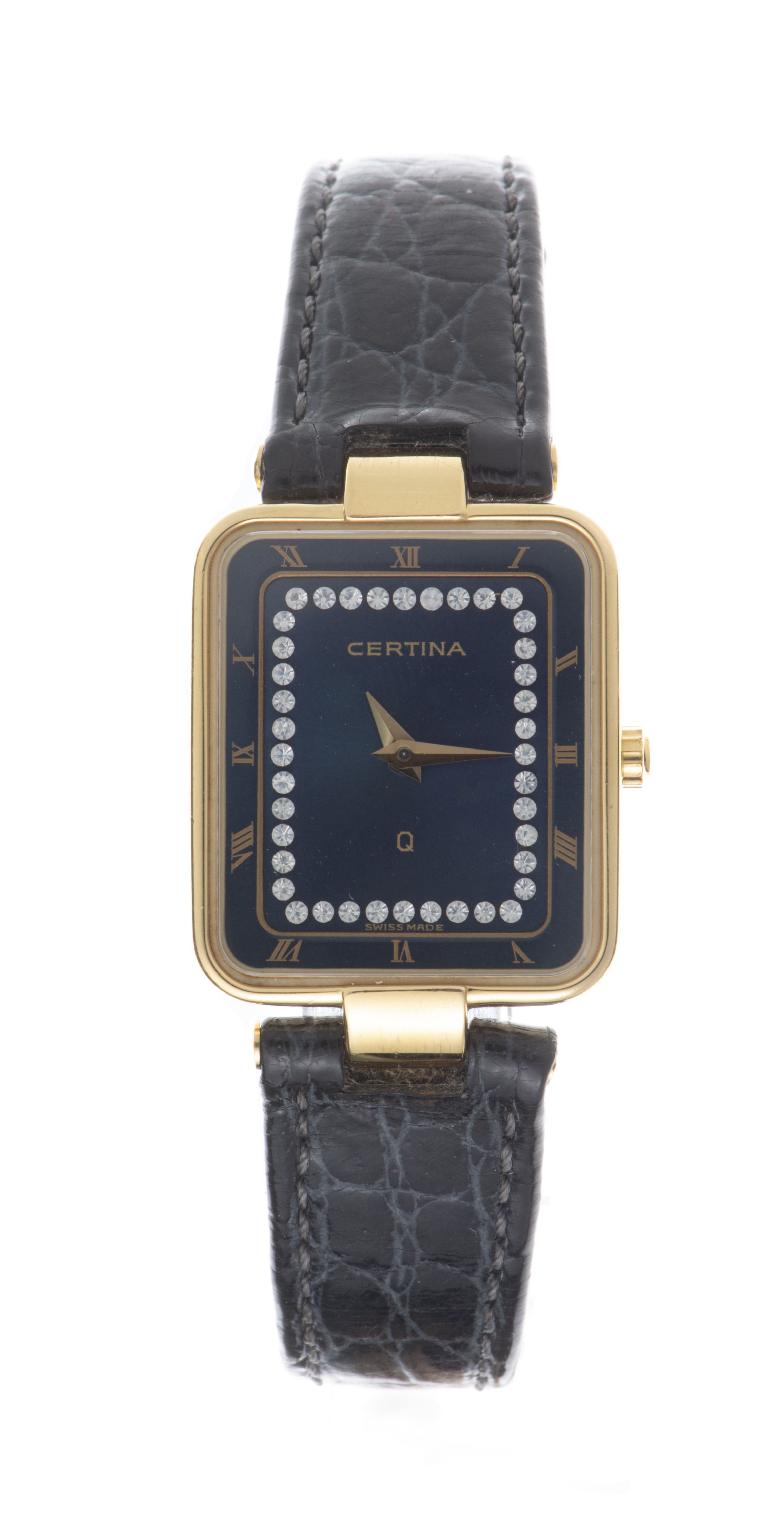 - montre-bracelet femme à quartz Certina en métal doré à cadran bleu serti de brillants et verre "saphire crystal" modèle rectangulaire 203 2005 2105 26 dans un écrin Jaeger-LeCoultre