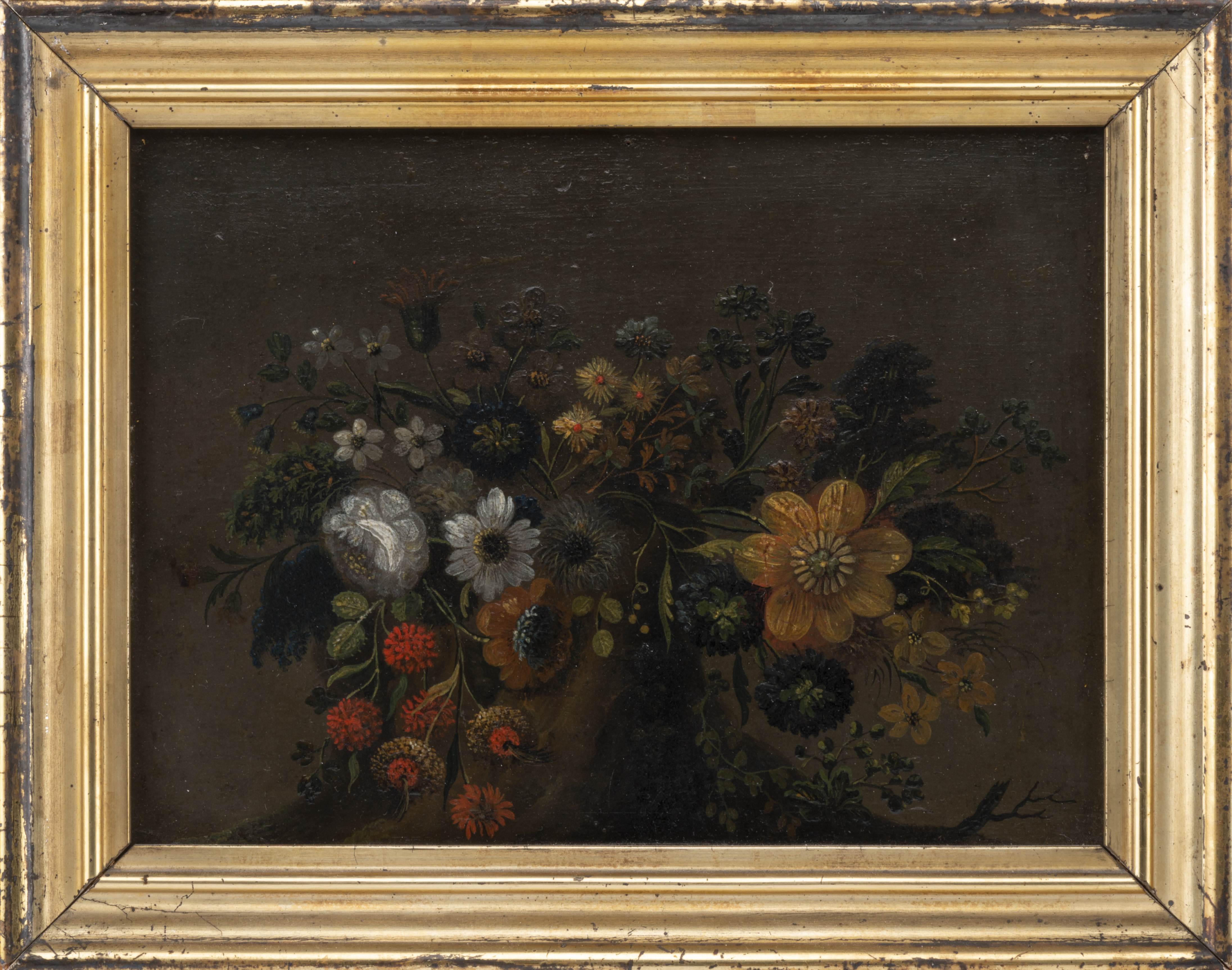 TRAVAIL du XVIIe "Natures mortes aux fleurs", paire d' huiles sur bois, non signé.