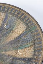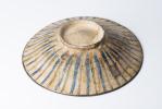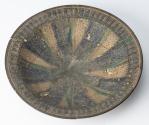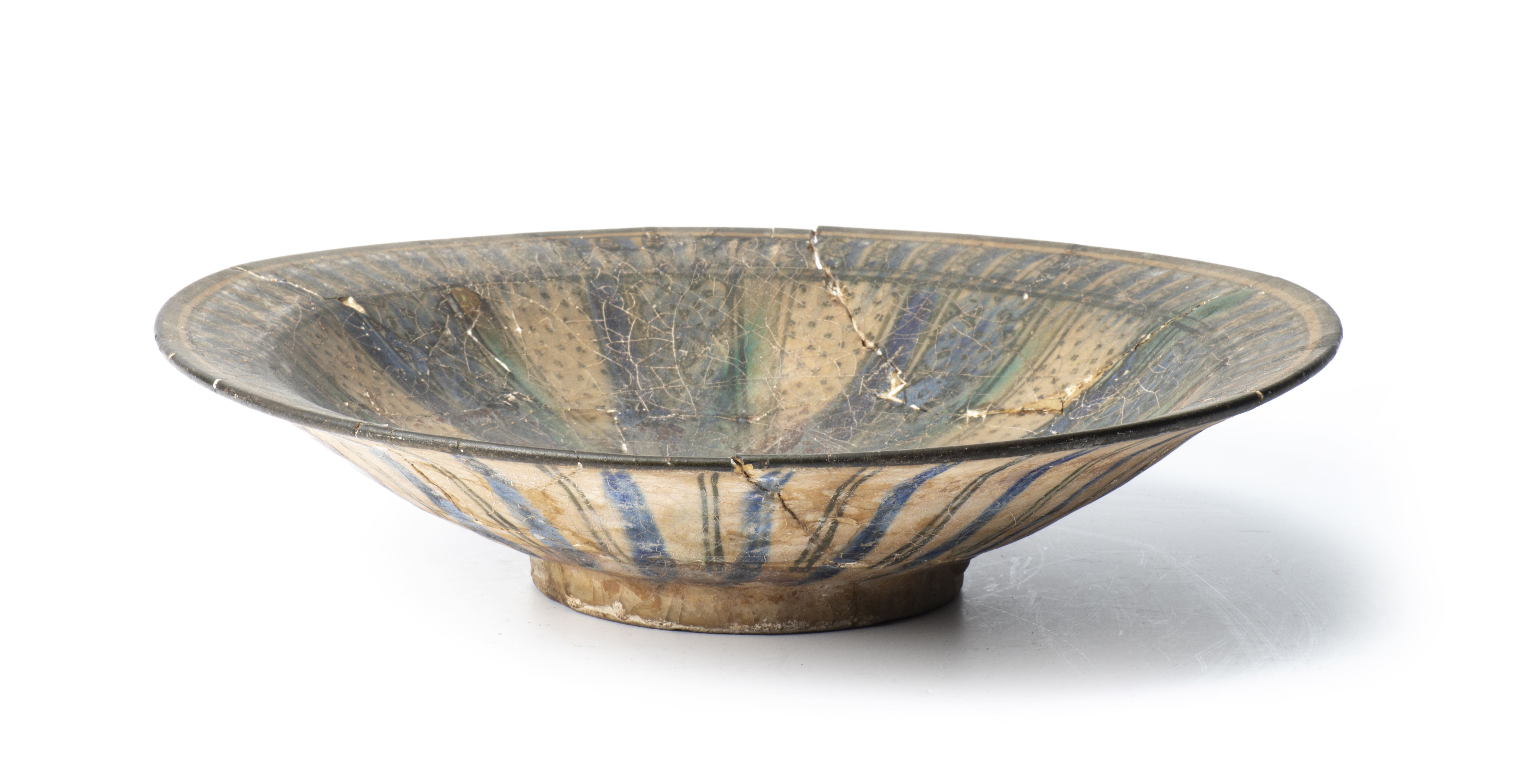 Coupe en faïence du Moyen-Orient à marli extérieur à décor rayonnant de lignes alternées bleues et noires, marli intérieur rayonnant à médaillons en bandes bleues, vertes et blanches à semis noirs, bordure à décor géométrique rehaussé de noir. XIe-XIIe