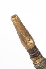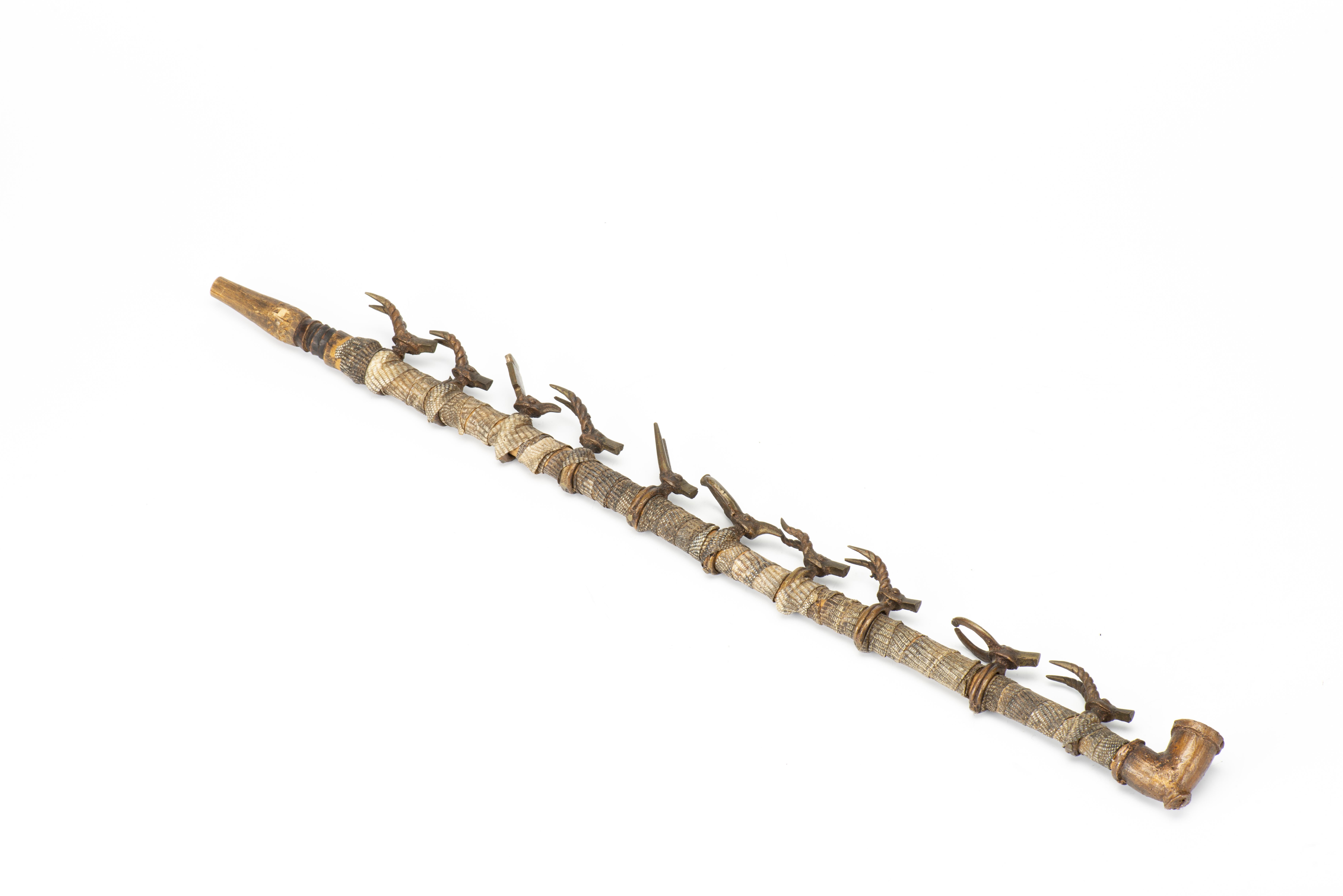 Pipe en bronze du Ghana à décor d'oiseaux et têtes de cervidé. Le fût est entouré d'une peau de serpent.