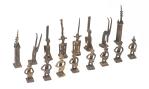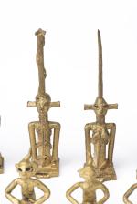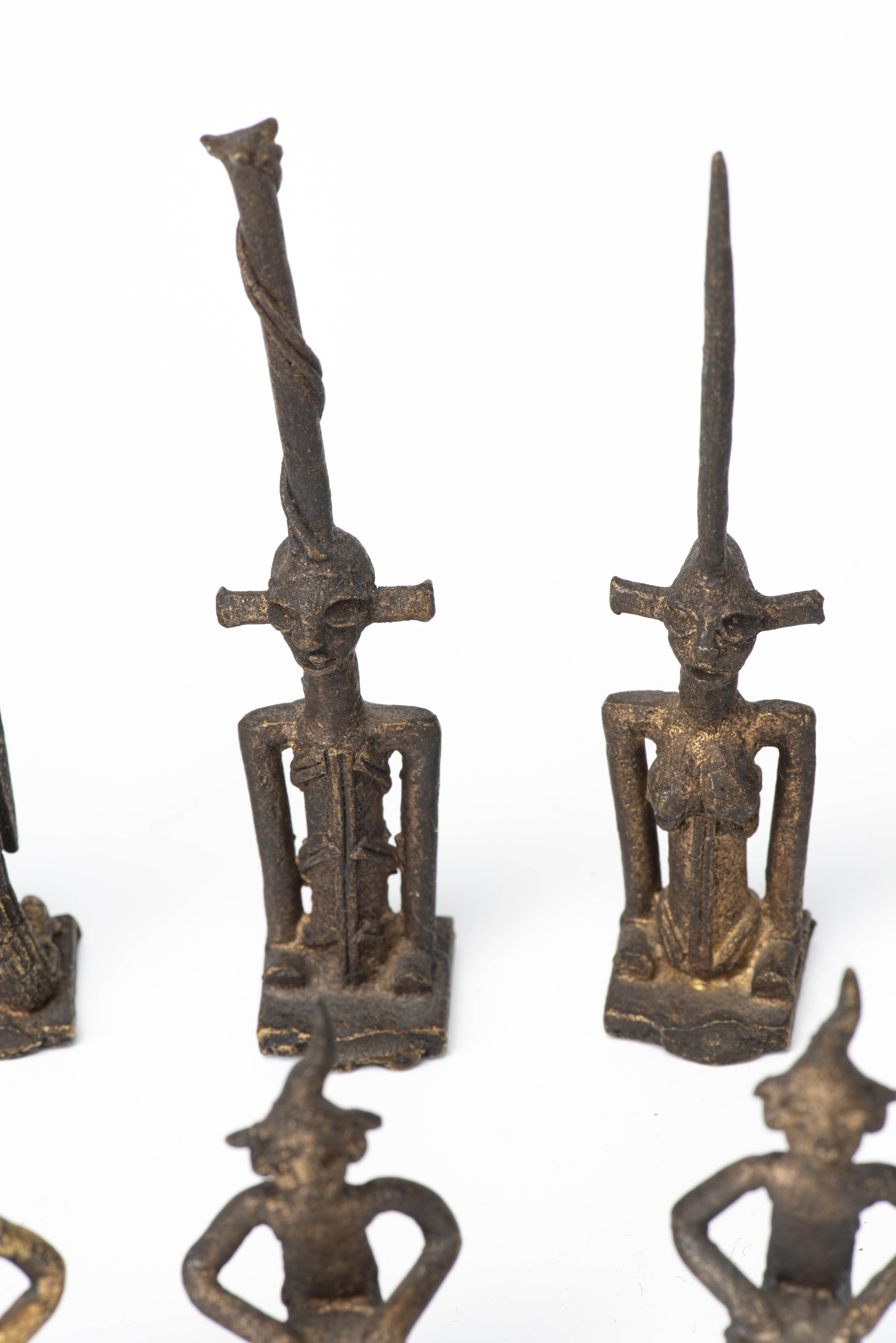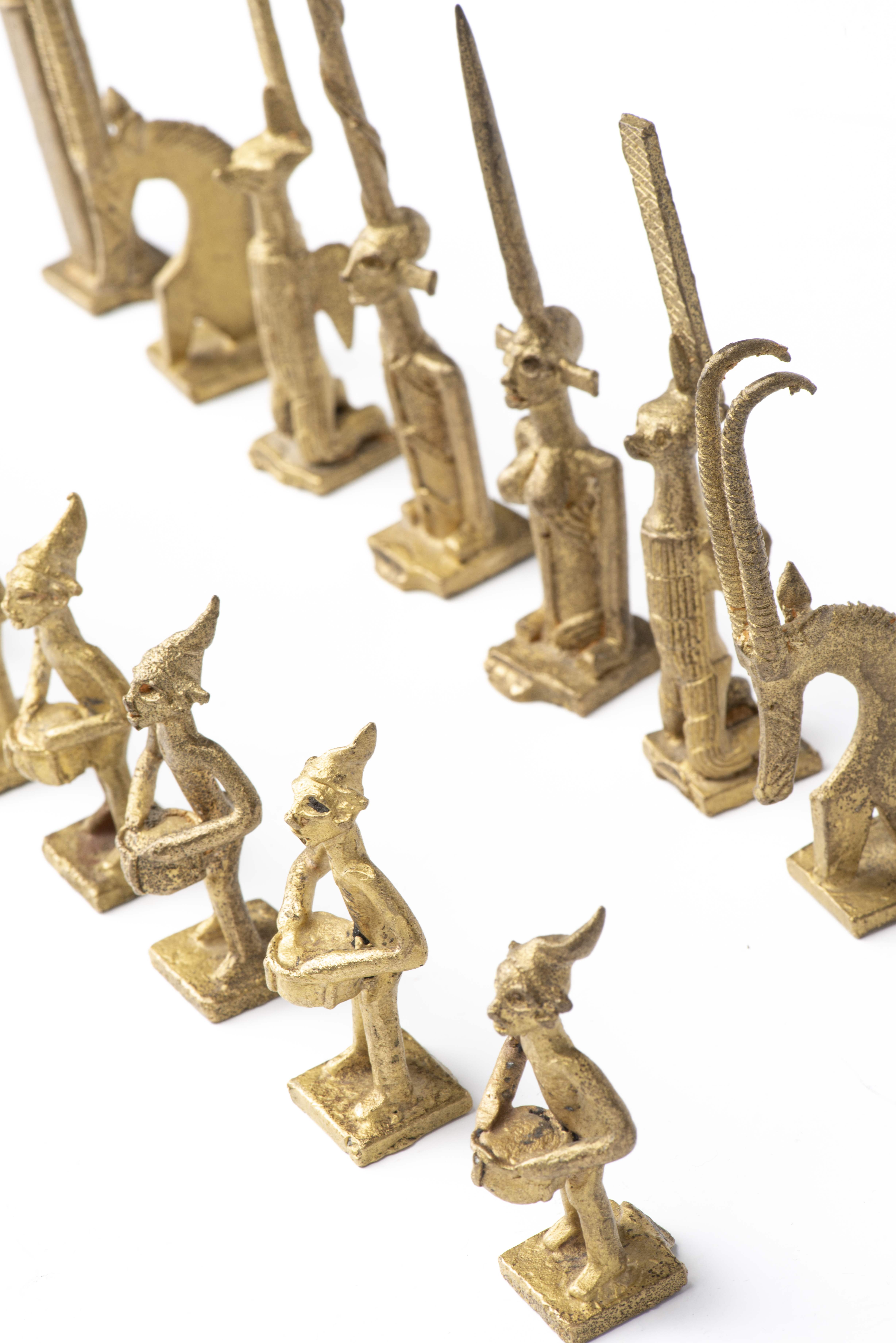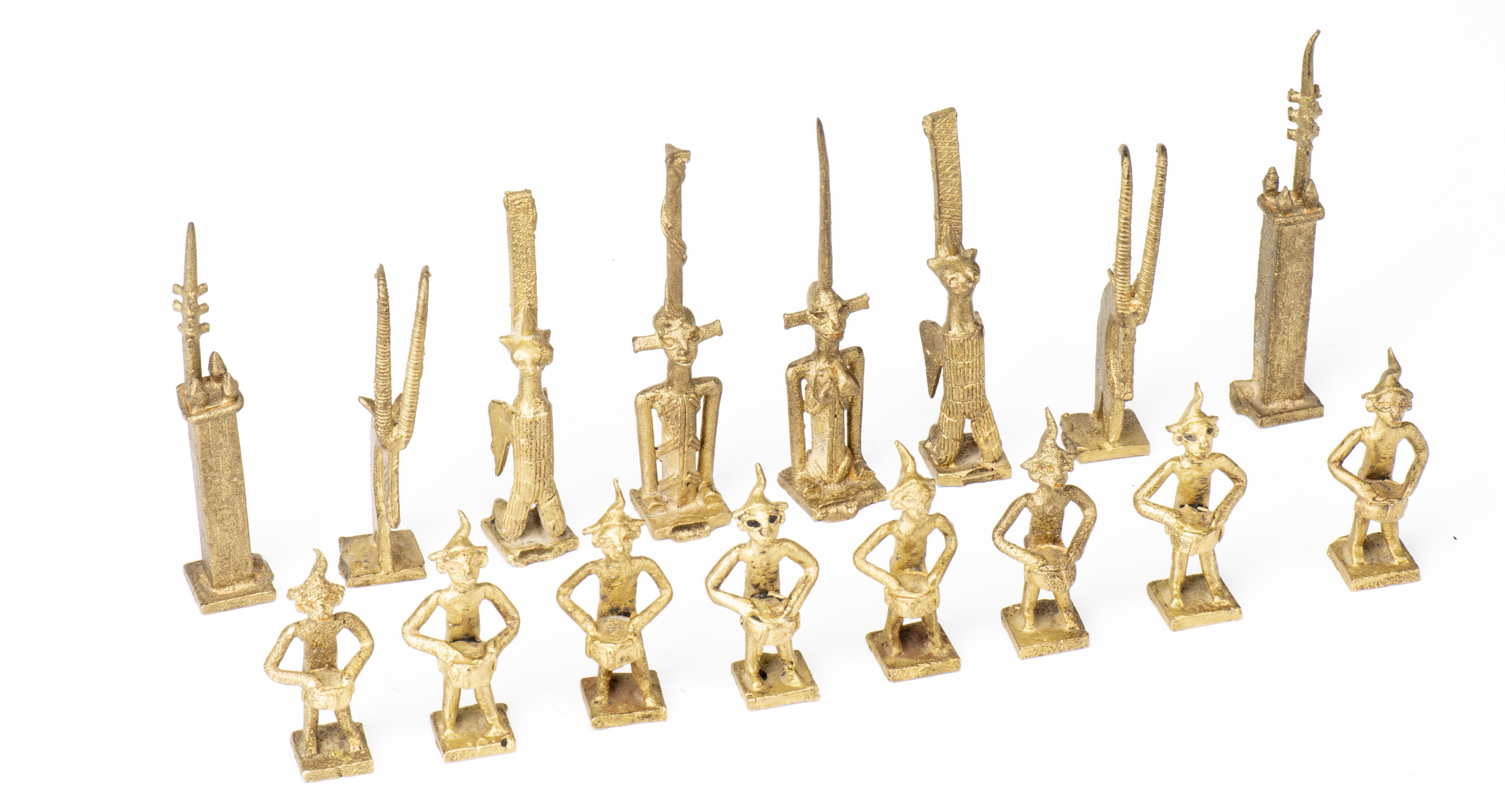Jeu d'échec du Ghana en bronze et damier en peau de chèvre. 32 pions.
