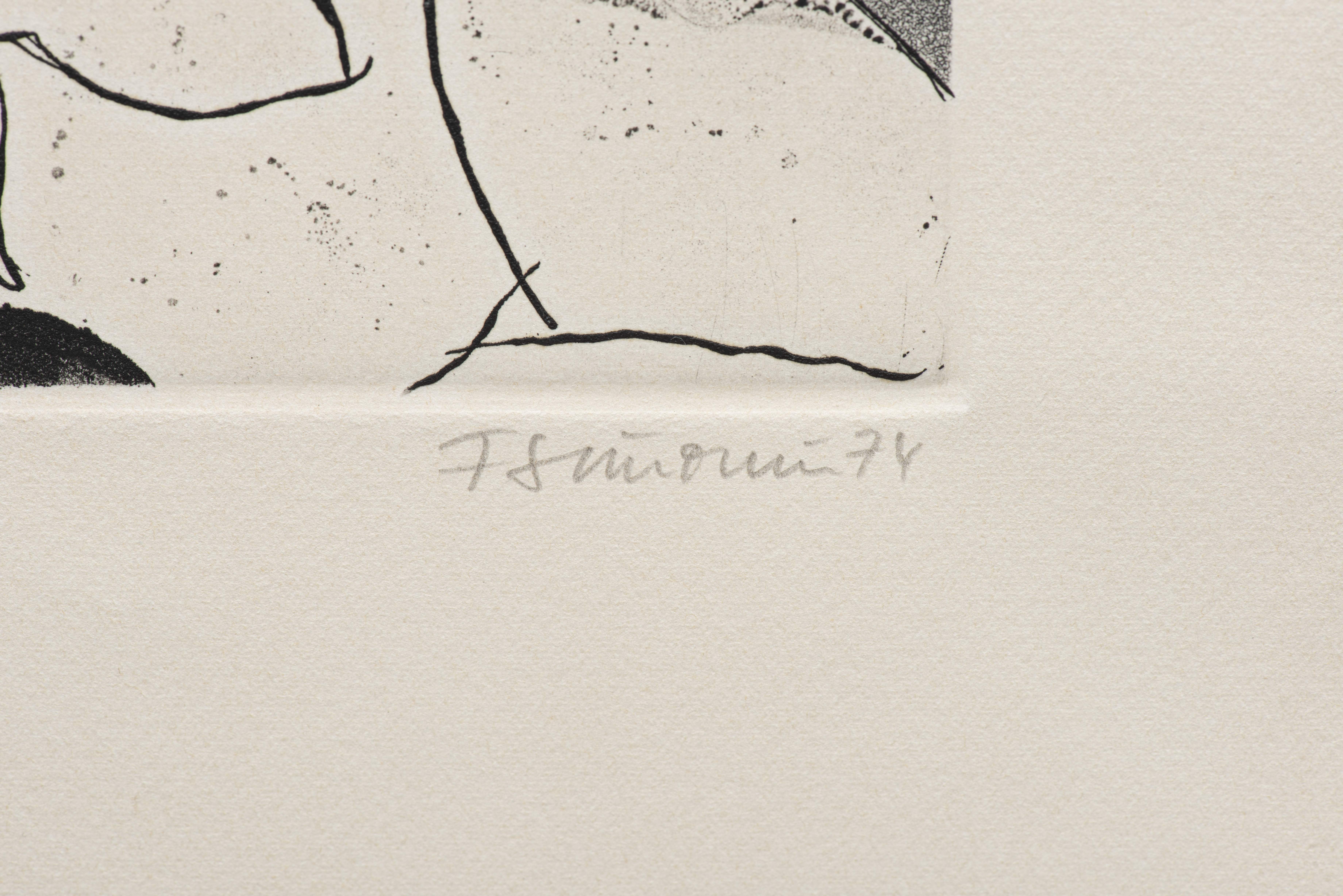 Dans la même série: "intimité" gravure à l'eau forte, numéroté 14/25 en bas à gauche, daté 1974 et signé en bas à droite au crayon.