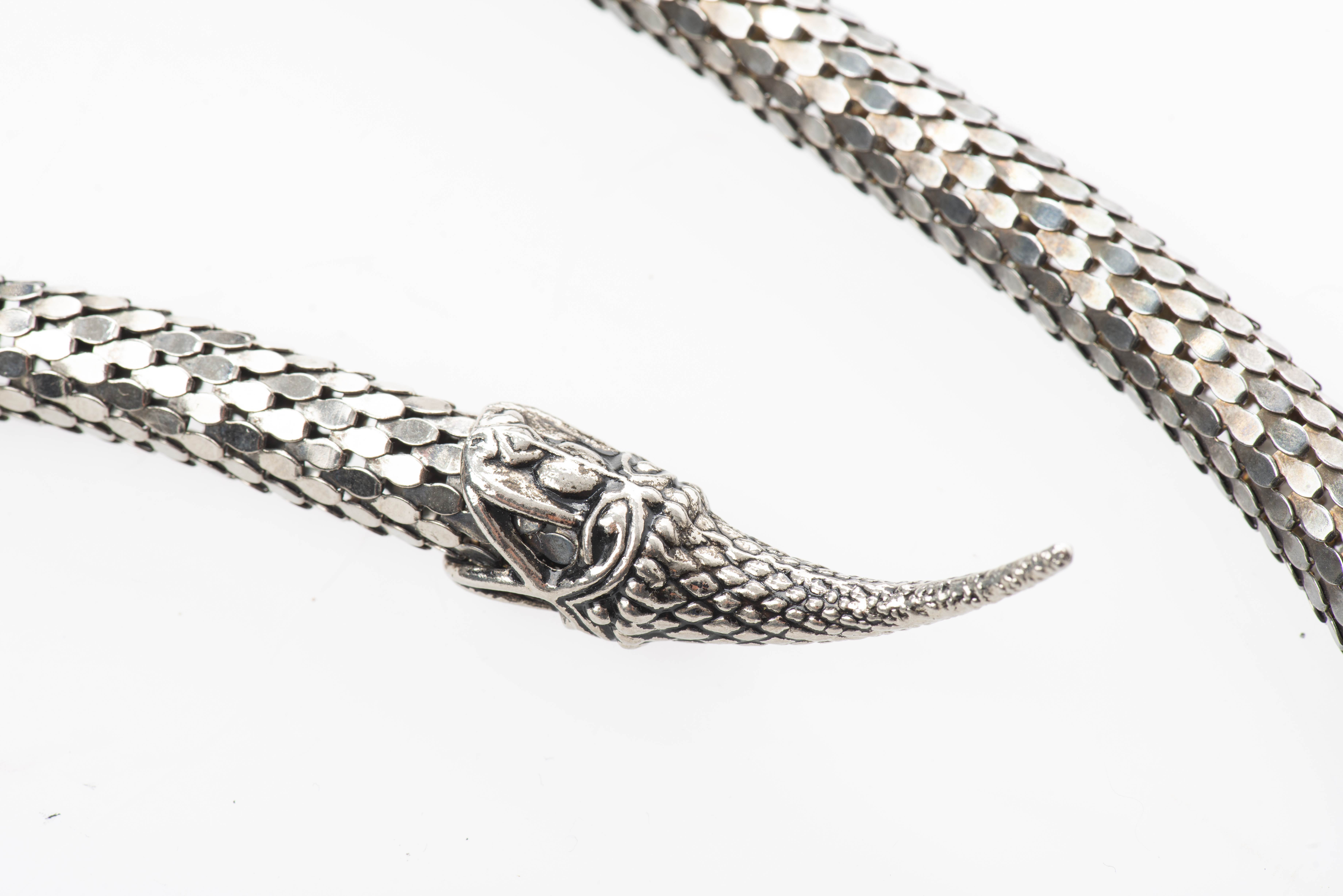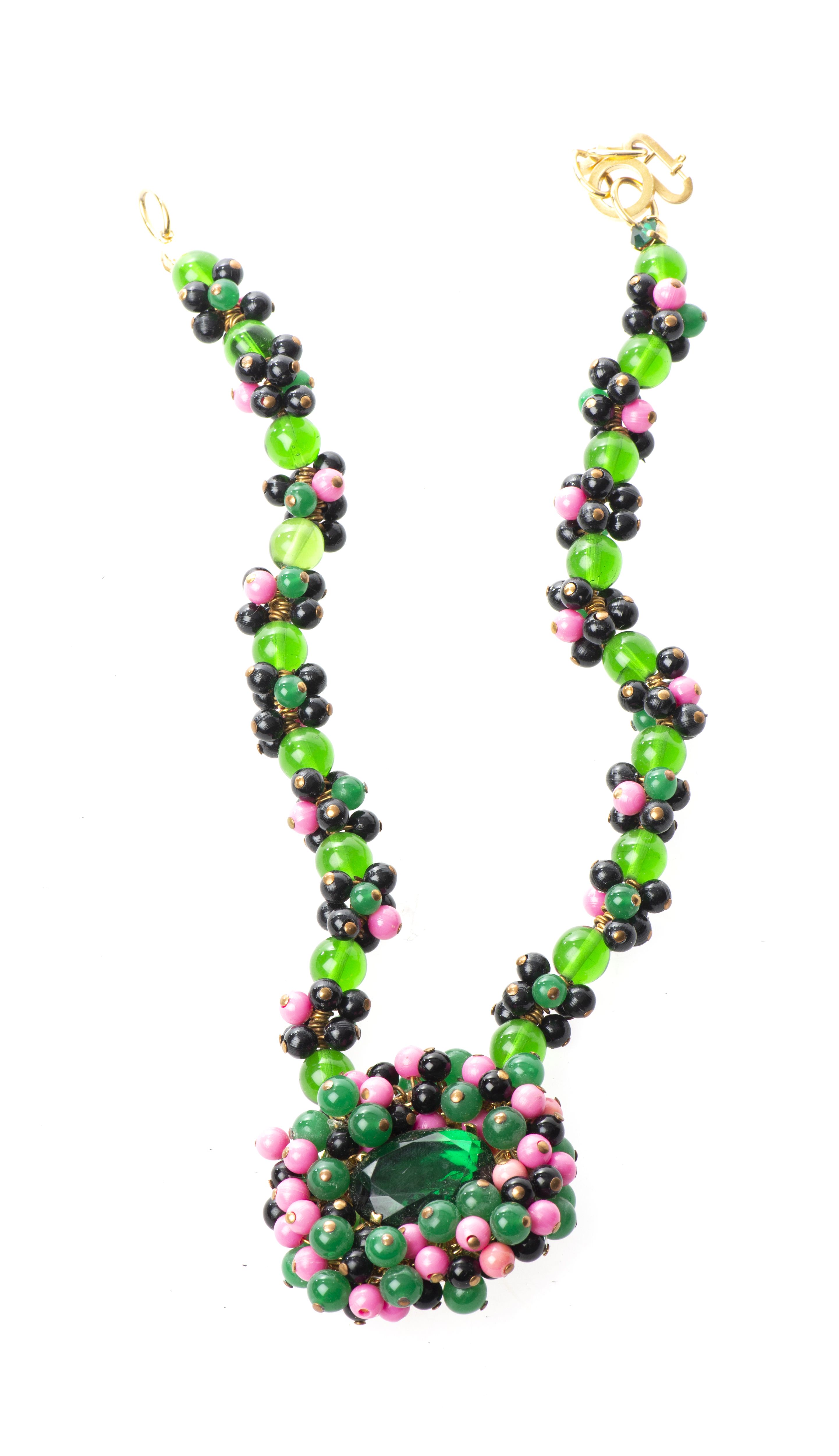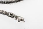 Deux colliers et une ceinture fantaisie avec perles de verre et de plastique et un collier serpent en métal. Un signé.