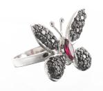 Bague en or gris .750 en forme de papillon aux ailes pavées de 52 diamants noirs pesant au total 1.10 ct et un corps central d'un rubis marquise serti à griffes pesant au total de 0.30 ct.