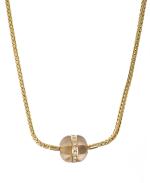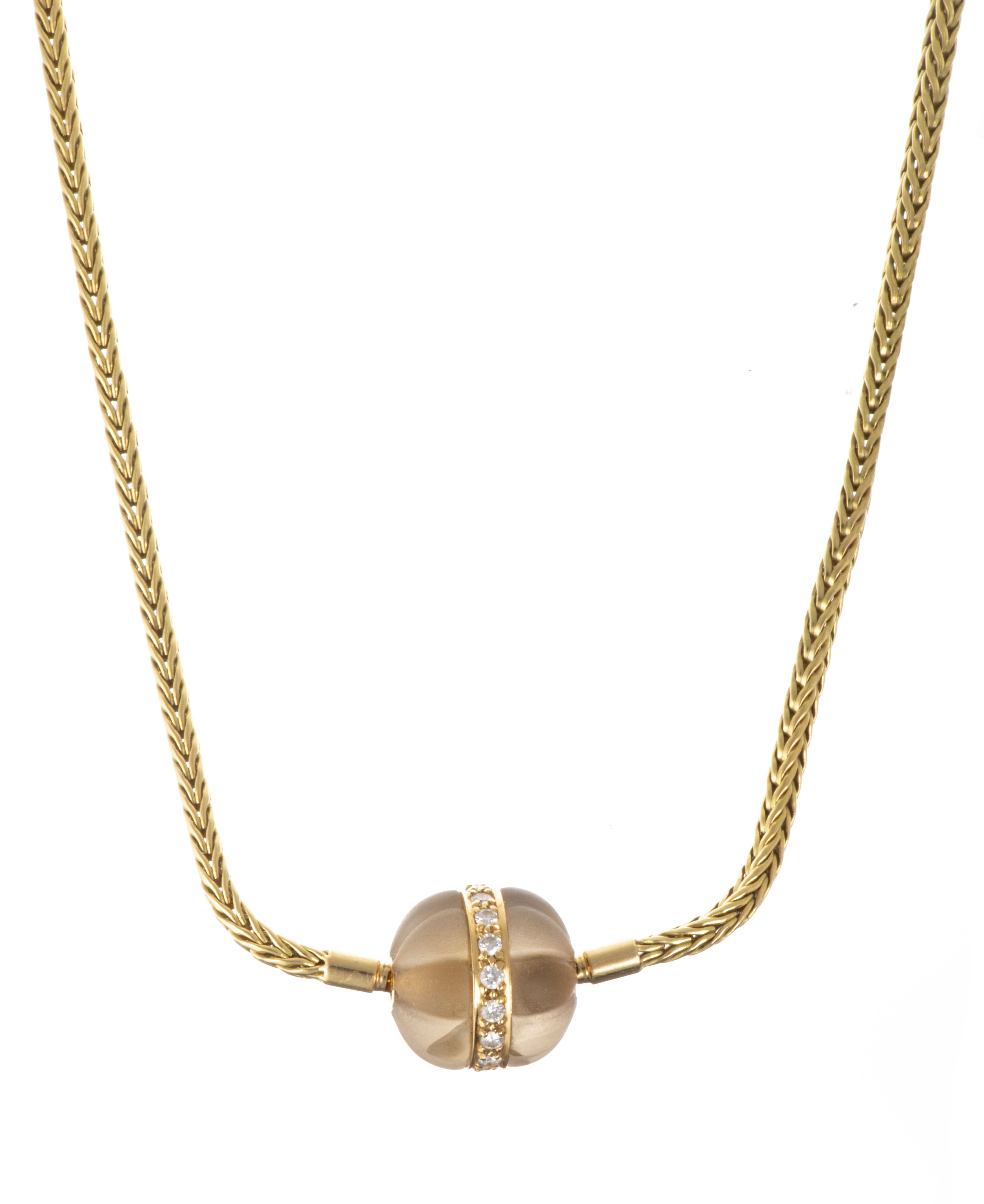 Collier chaîne palmier en or jaune .750 avec fermoir invisible dans le pendant en quartz fumé de forme melon serti d'un anneau en or jaune .750 pavé de 16 diamants pesant au total 0.32 ct avec une boule interchangeable de forme melon en hématite.