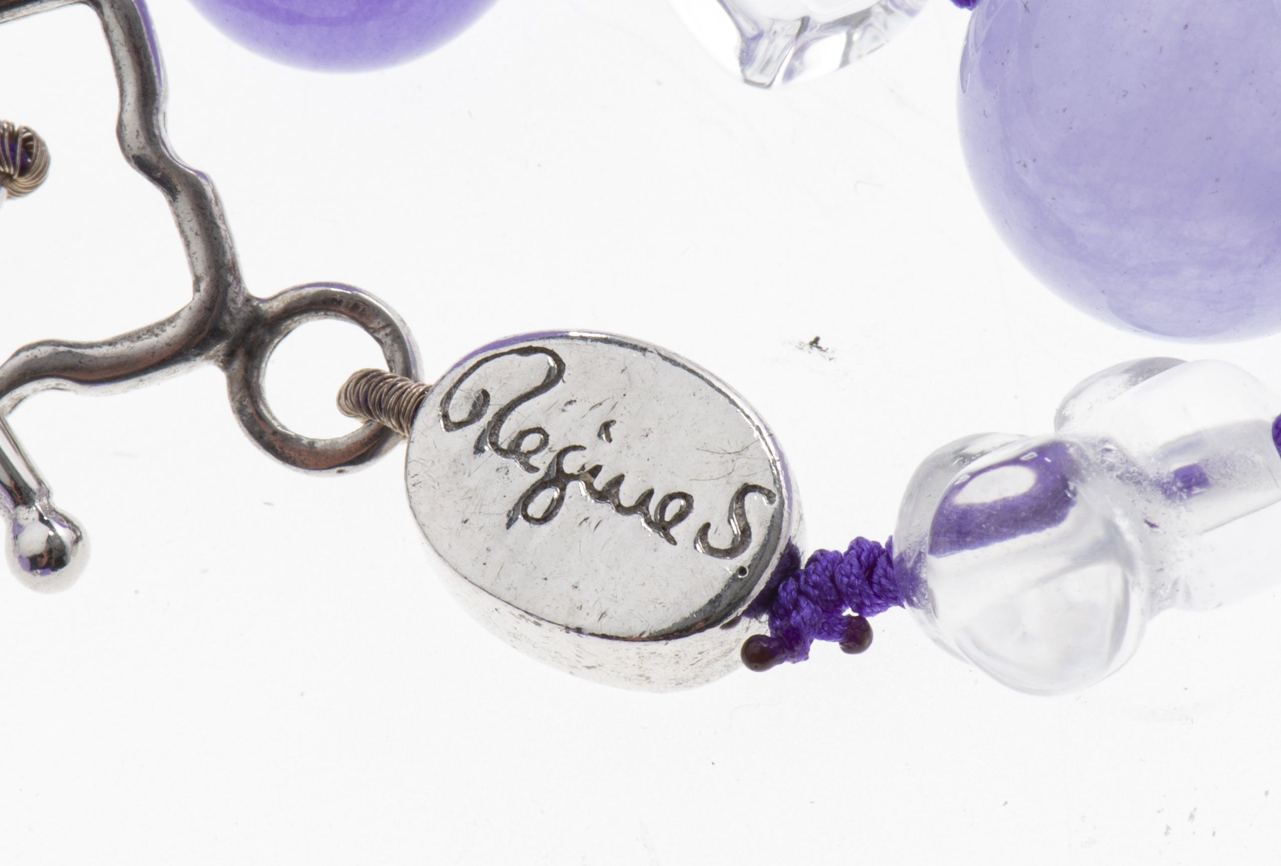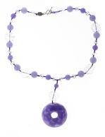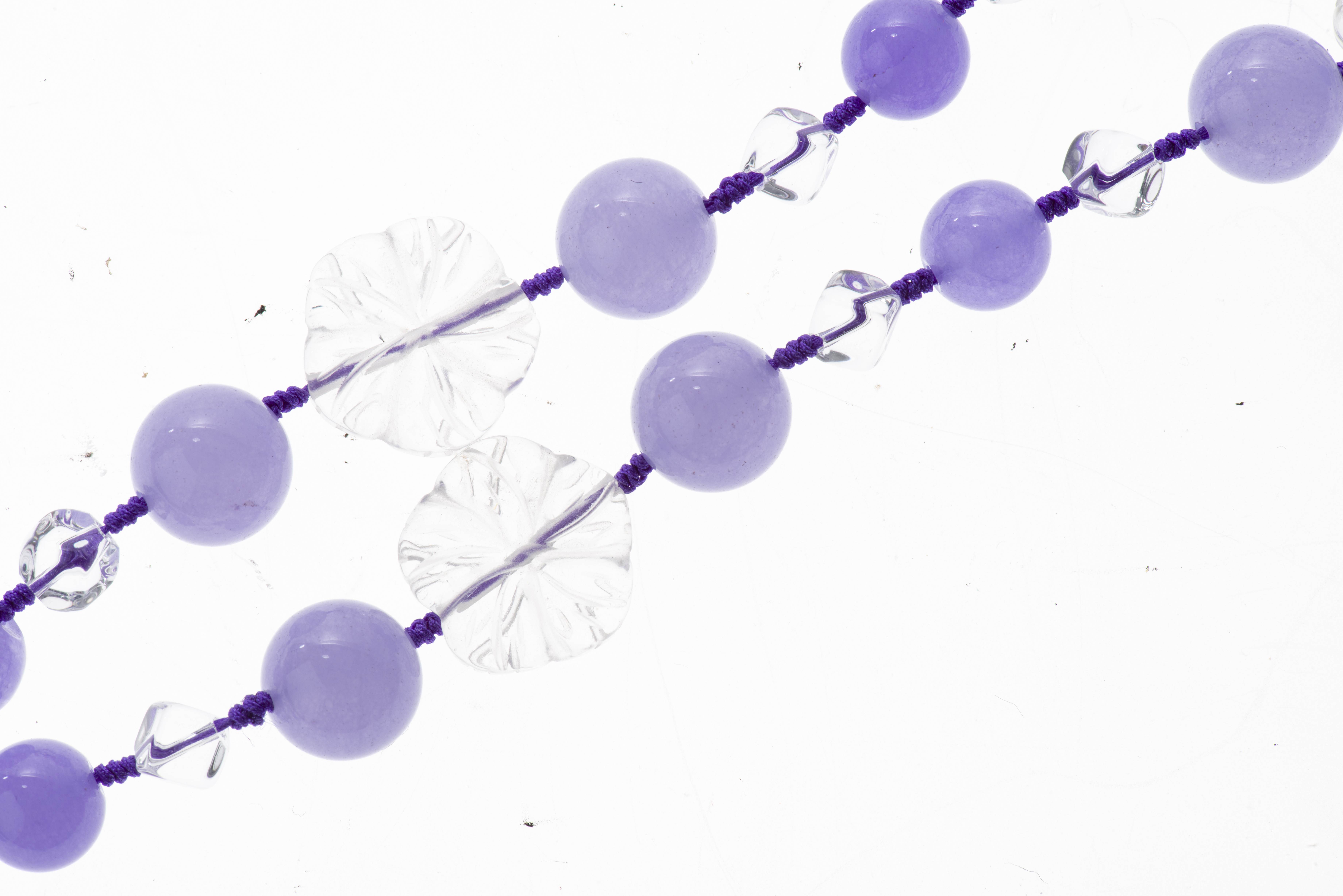 Régine S, collier de boules de jadéïte teinte en mauve avec du cristal de roche en forme de fleurs et cubes en cristal de roche, pendentif en jadéite teinte en mauve à motif décoratif.