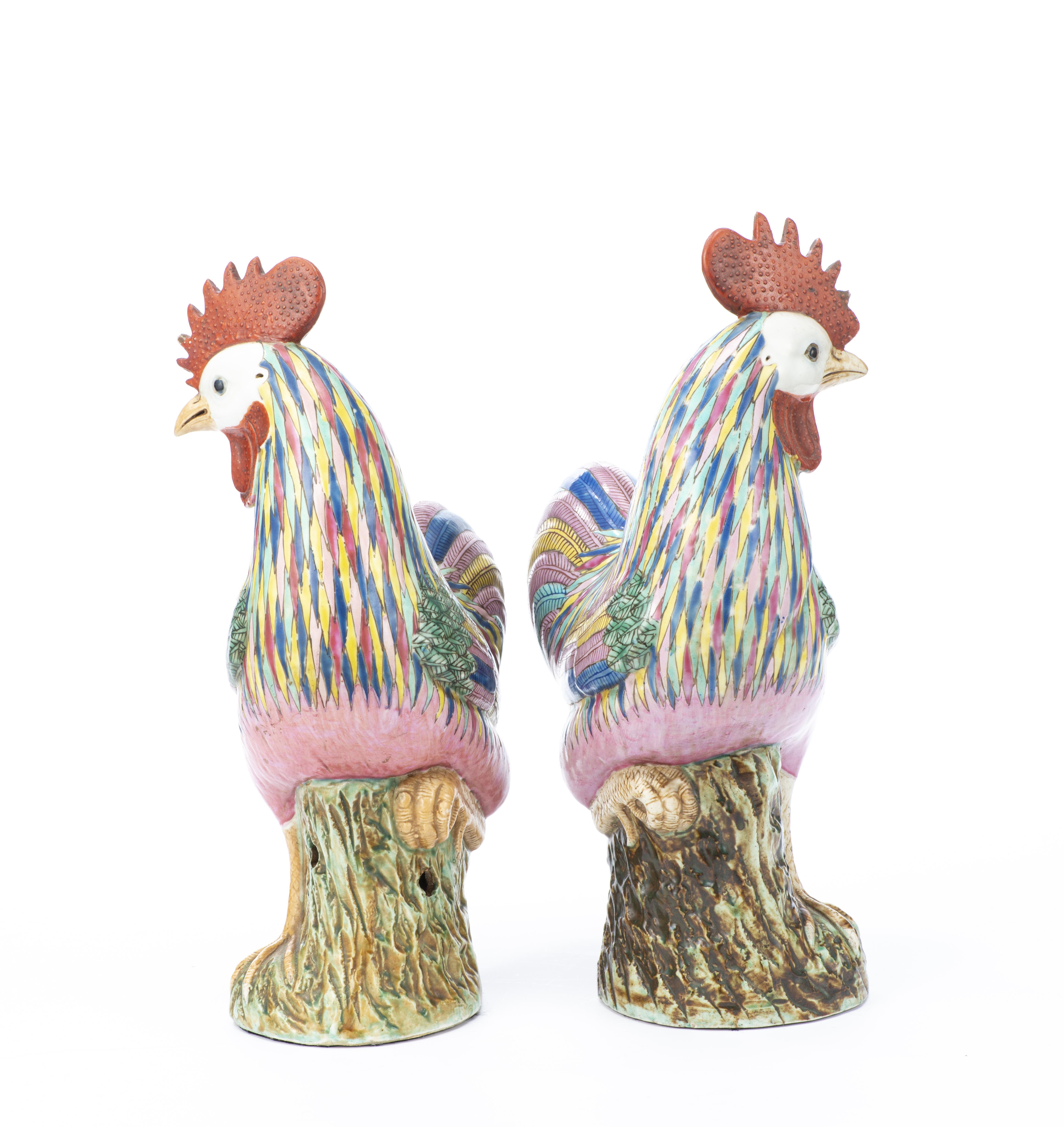 CHINE, Compagnie des Indes XIXe, paire de coqs en porcelaine de la famille rose.