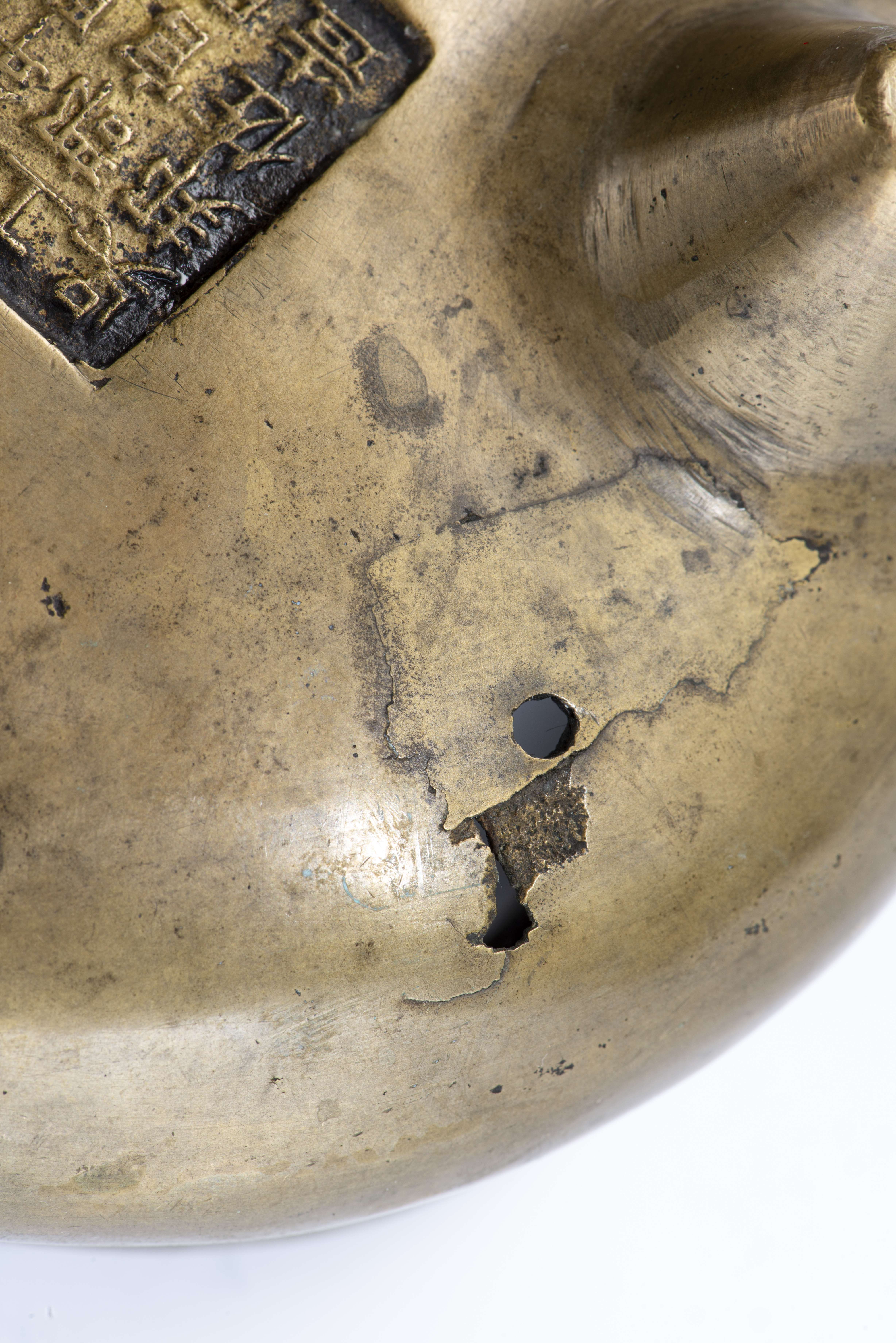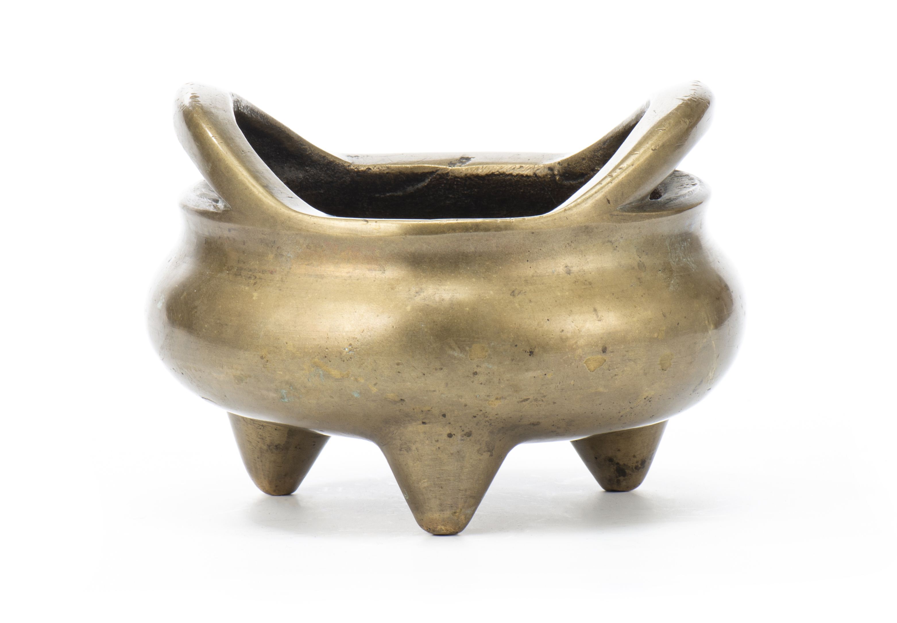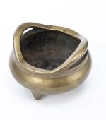Brûle-parfum tripode en bronze de Chine à patine bronze à 2 anses, marque apocryphe de la 5ème année de Xuande sous la base à 16 caractères.