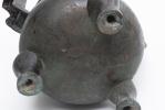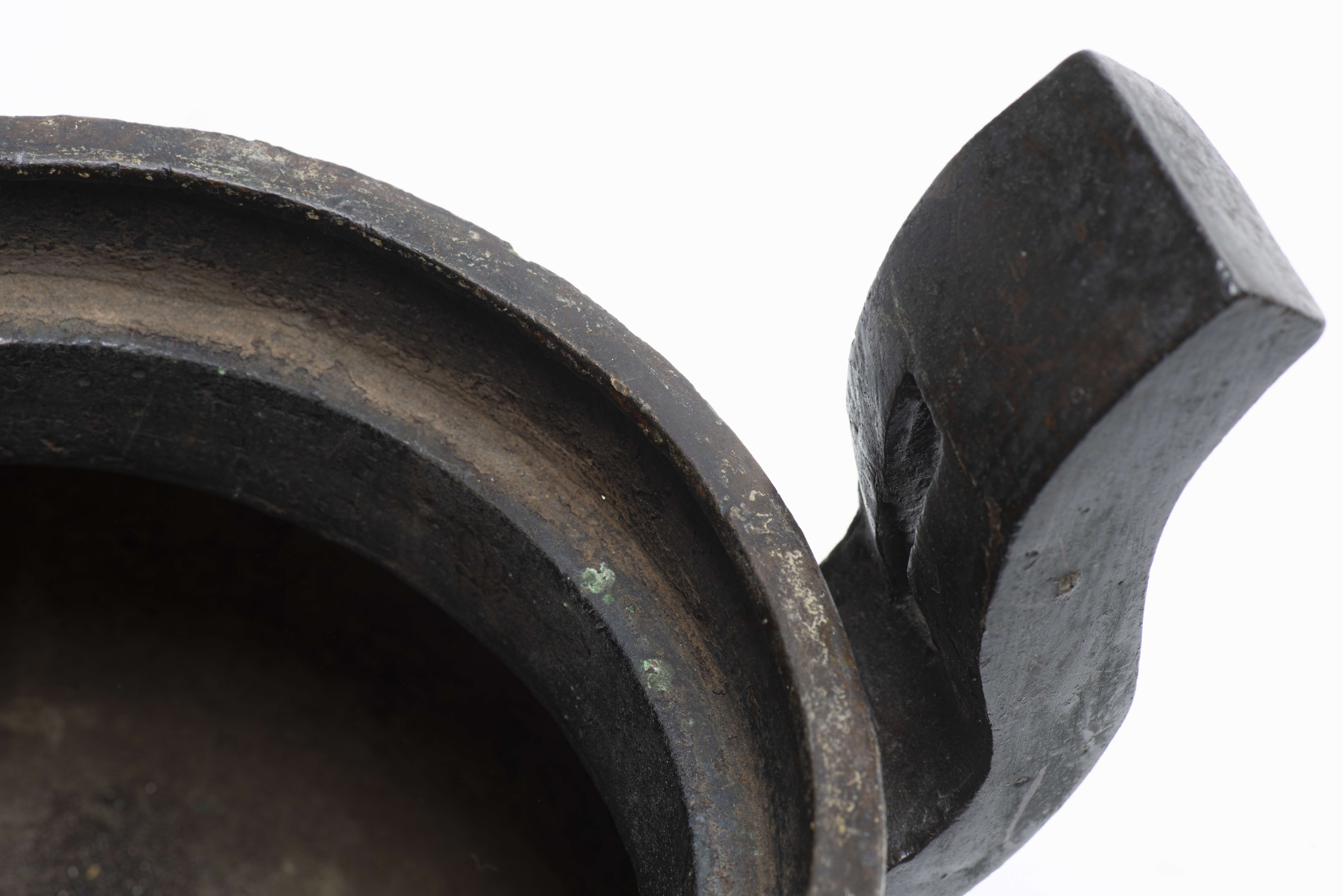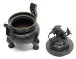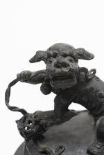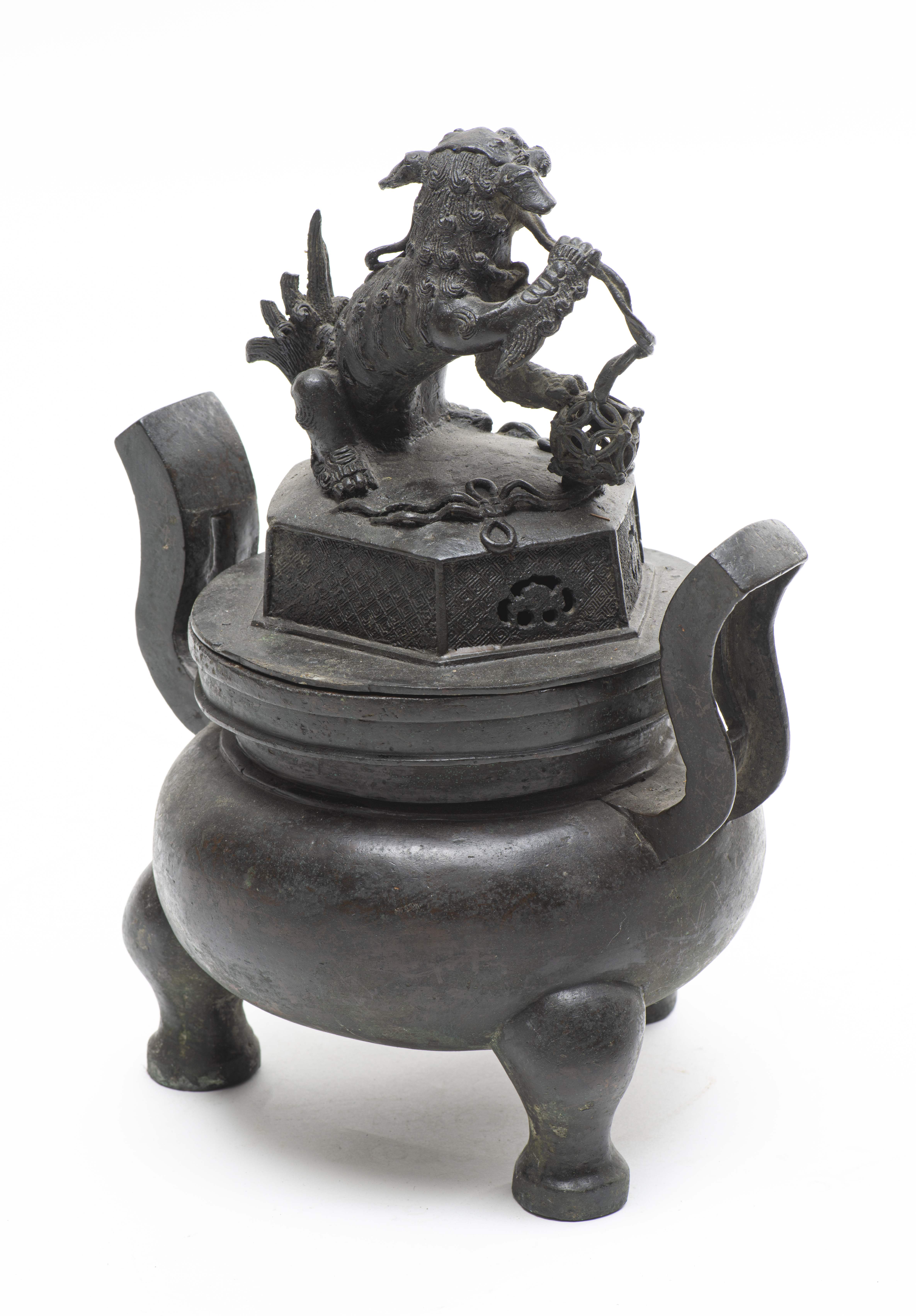 CHINE, Brûle-parfum tripode bombé (rappelant les brûle-parfums boudhistes en porcelaine) à deux anses levées au ciel et à corps globulaire et large lèvre circulaire XVIIIe en bronze. Prise du couvercle en forme de Shi Shi (chien lion boudhiste).