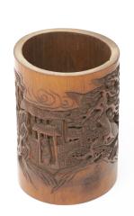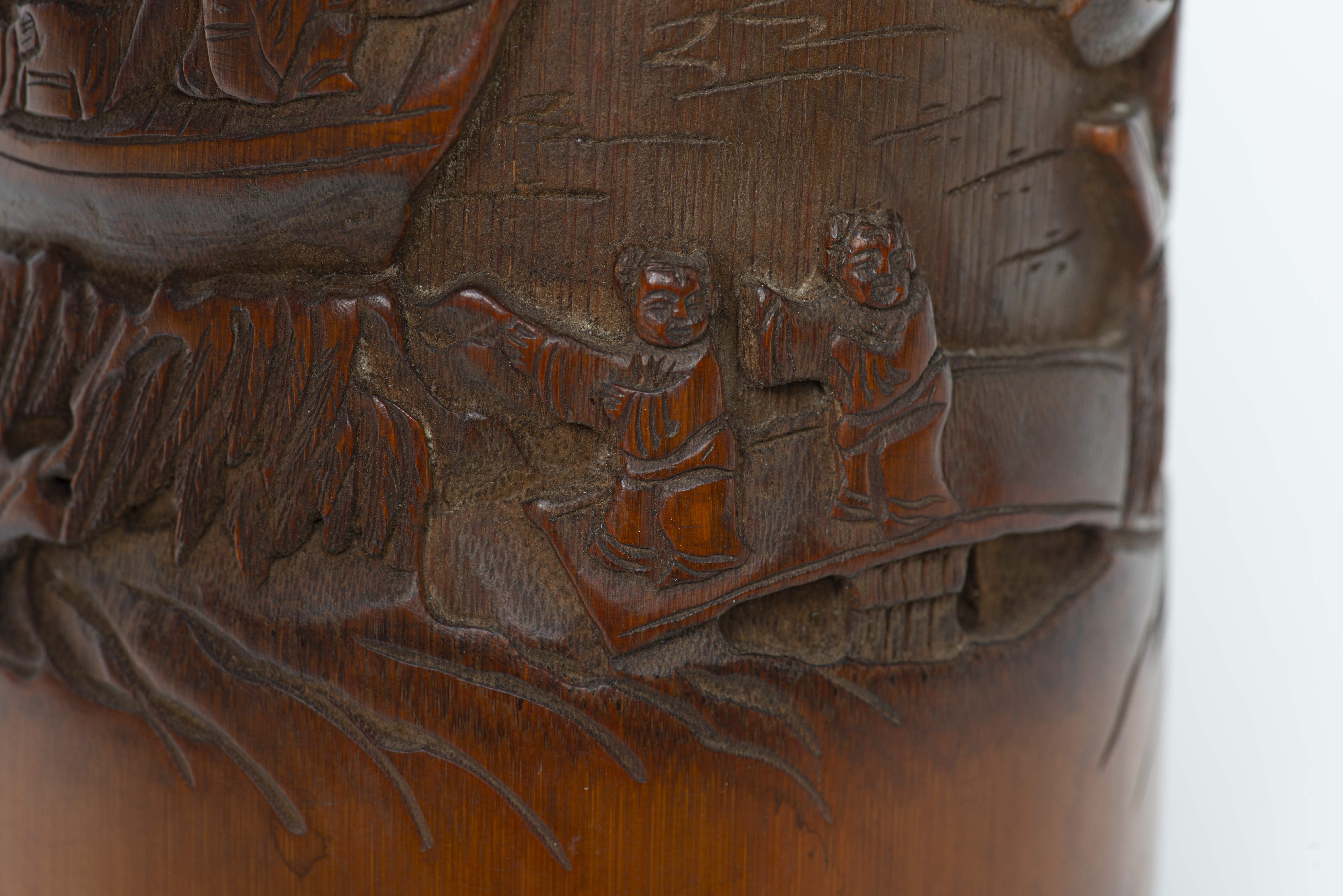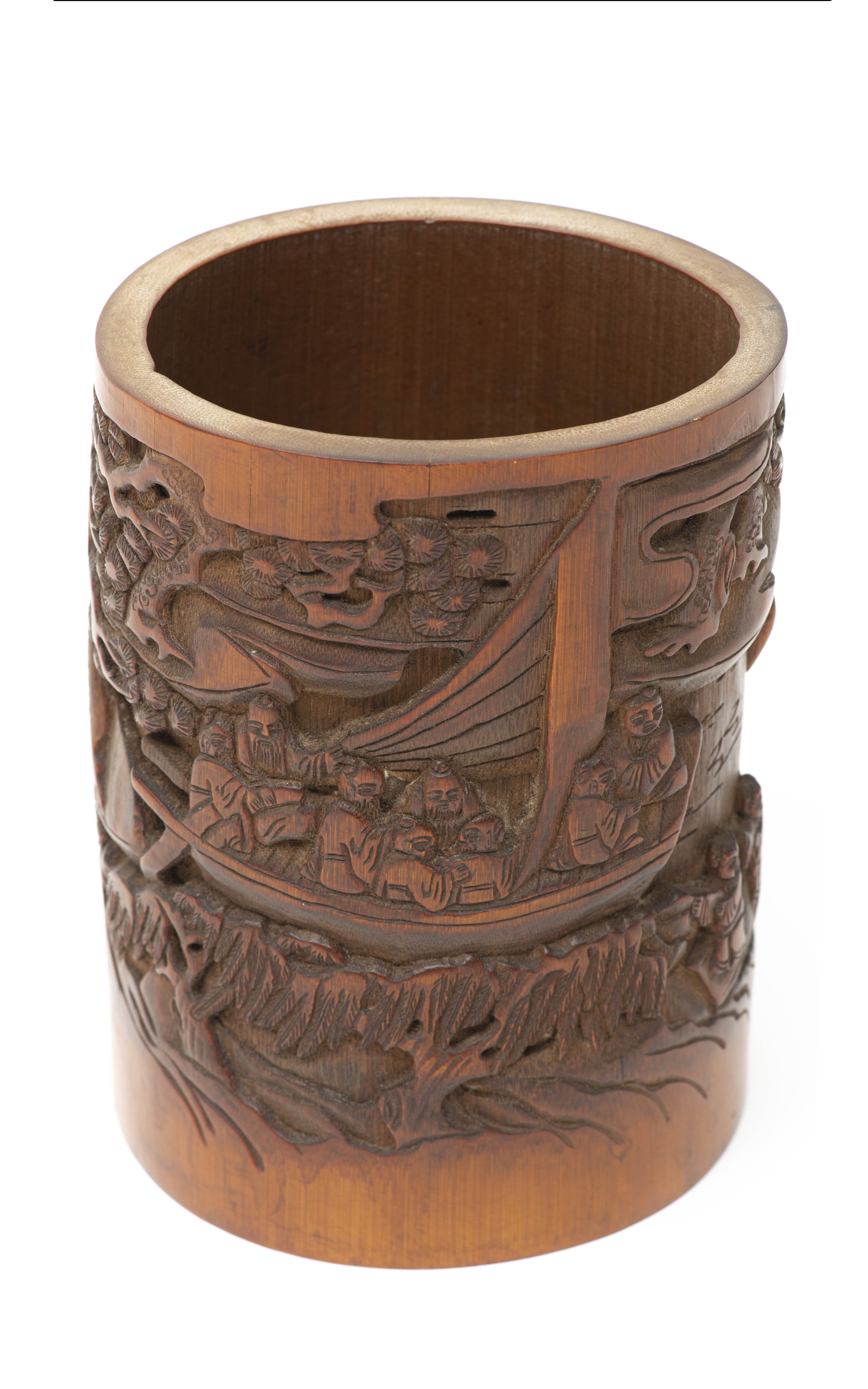 CHINE, Porte-pinceau en bambou sculpté des huit immortels sur un bateau