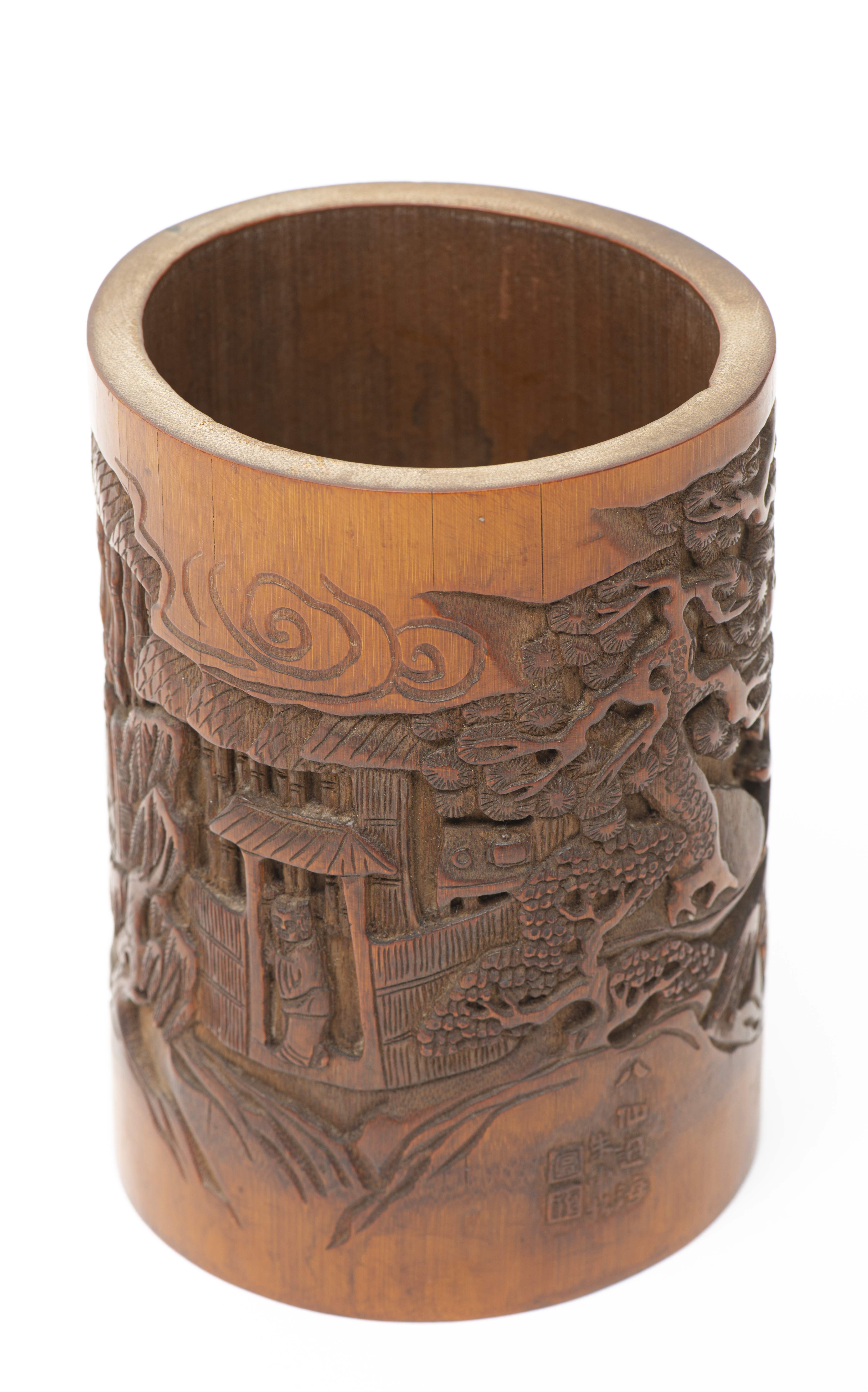 CHINE, Porte-pinceau en bambou sculpté représentant les huit immortels dans un bateau, signé de sept caractères chinois et deux sceaux.