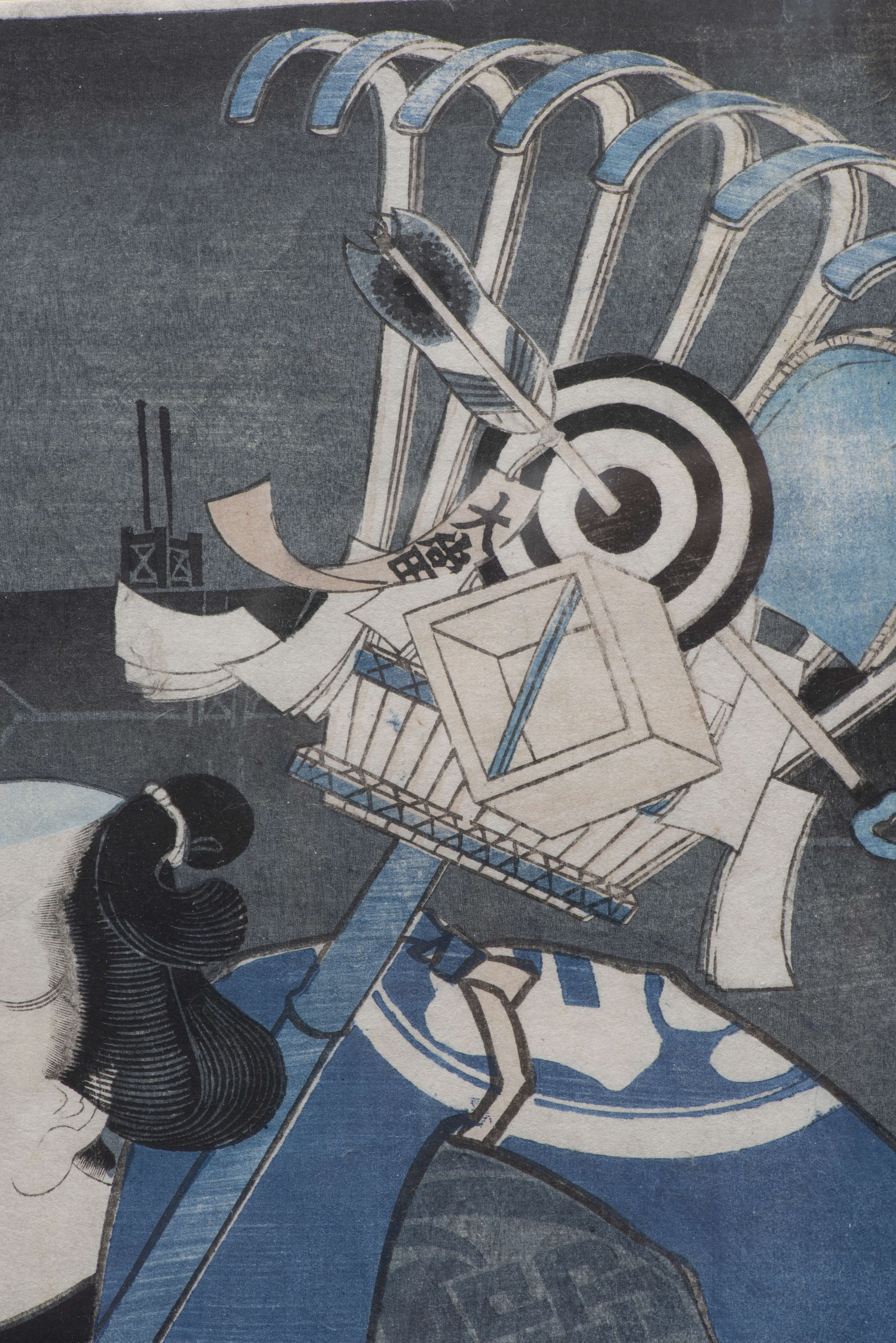 JAPON, Utagawa Kunisada (Toyokuni III) (1786-1865) "Le tireur à l'arc" estampe sur papier édité par Joshuga Kinzo, dernière période, avec le cachet de censure Aratame vers 1860.