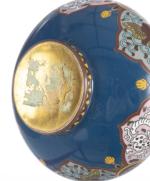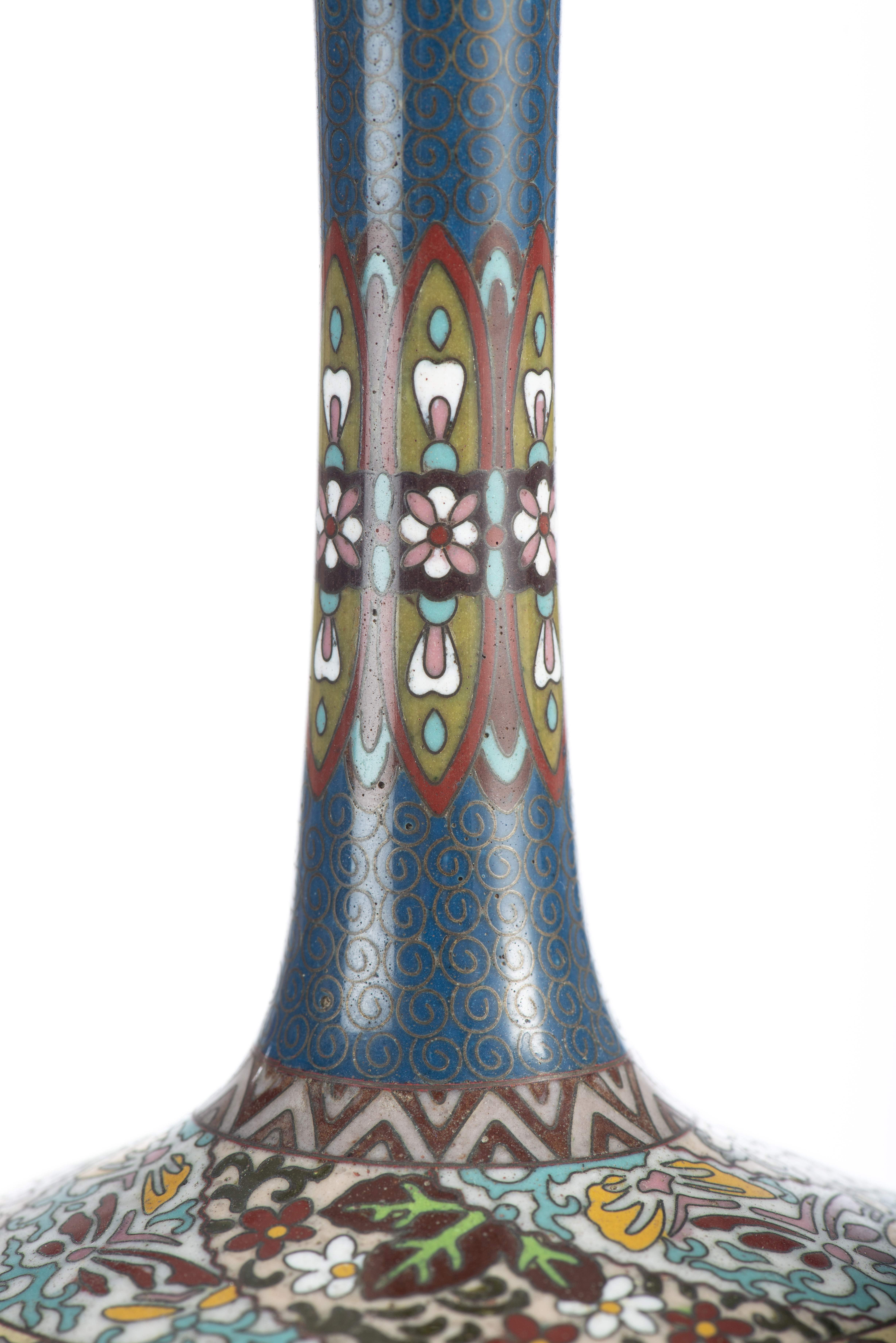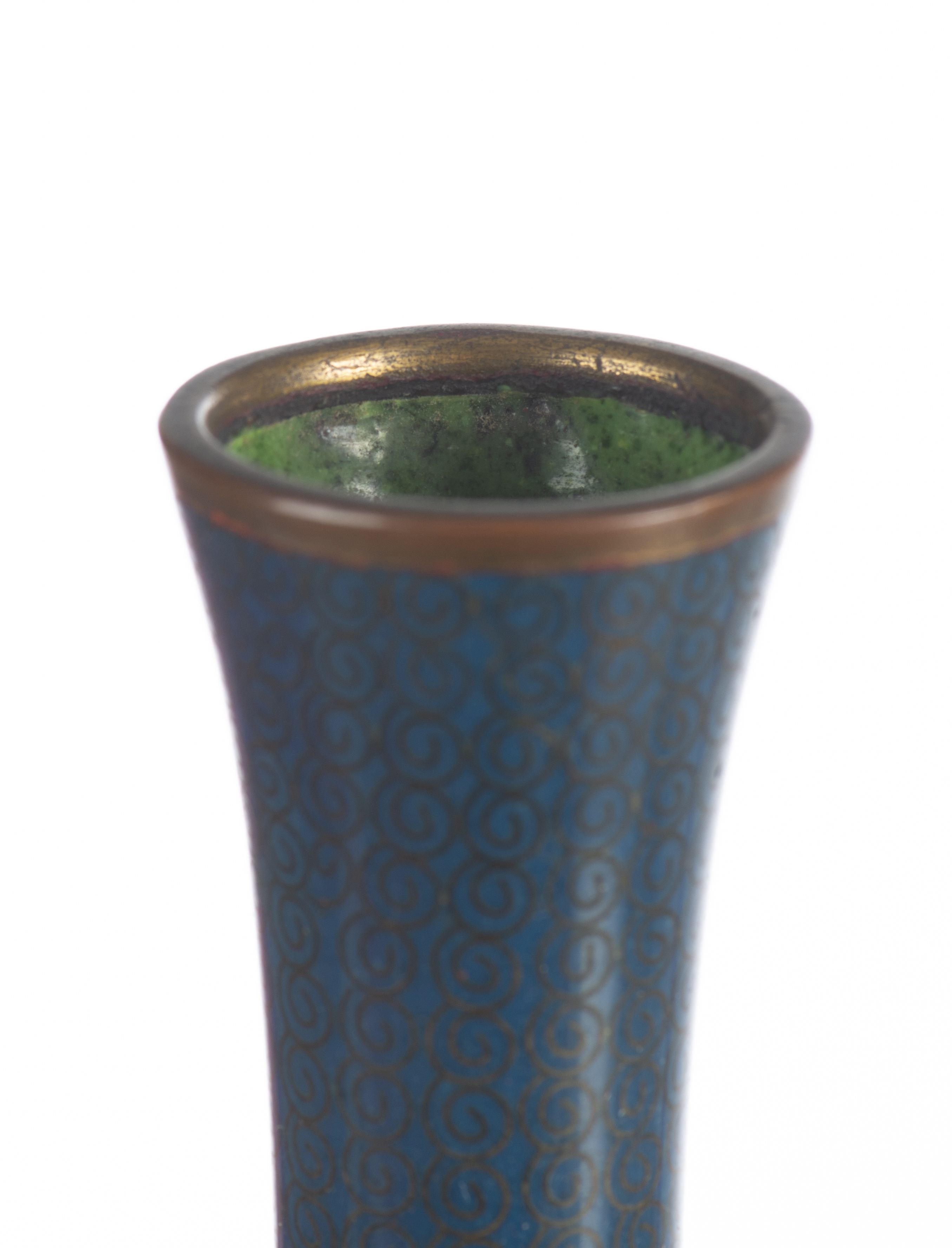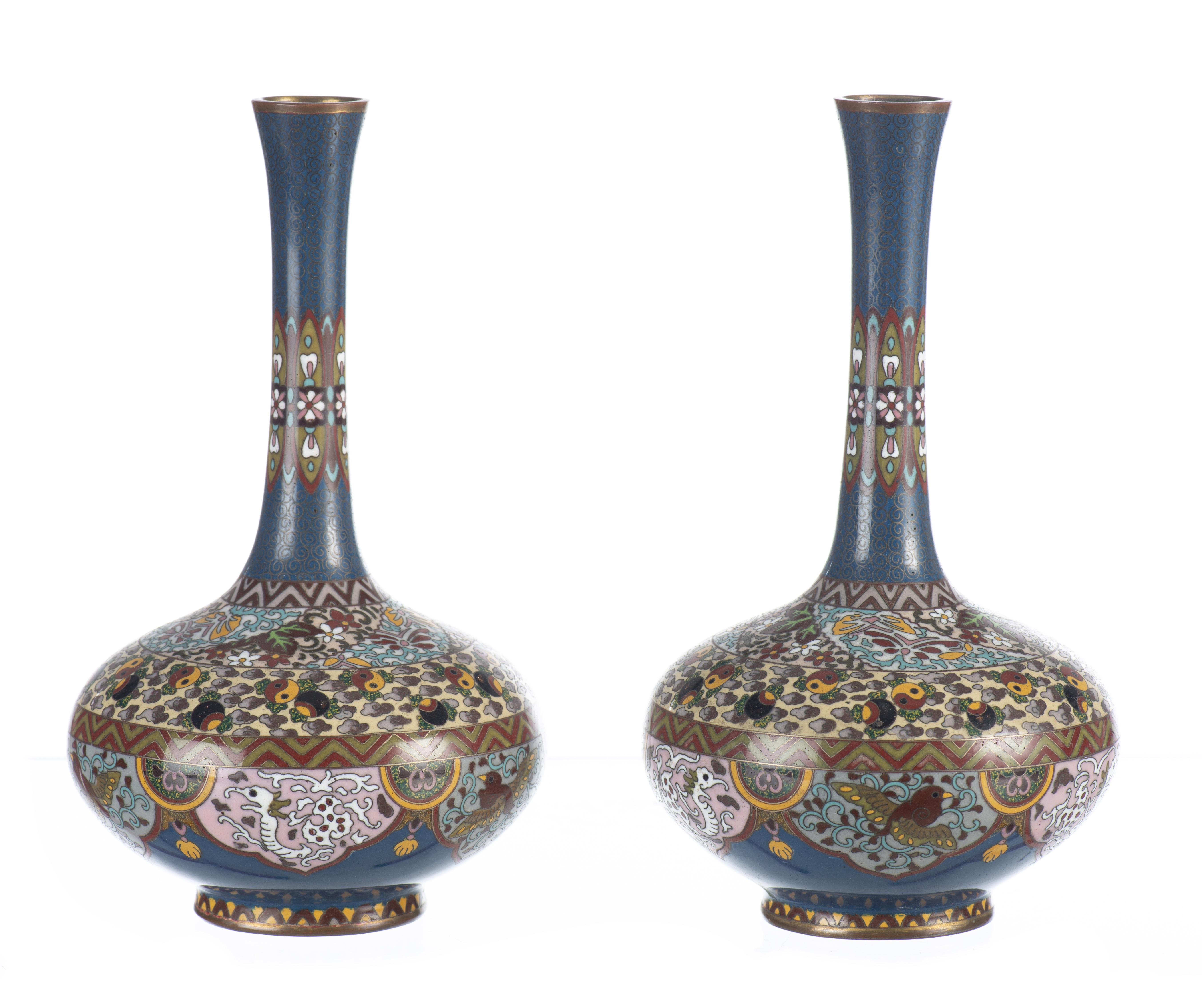 JAPON, Paire de petits vases en cloisonnés, ère Meiji, vers 1900, à décor en registres horizontaux en bandes sur champs principal bleu pétrole.