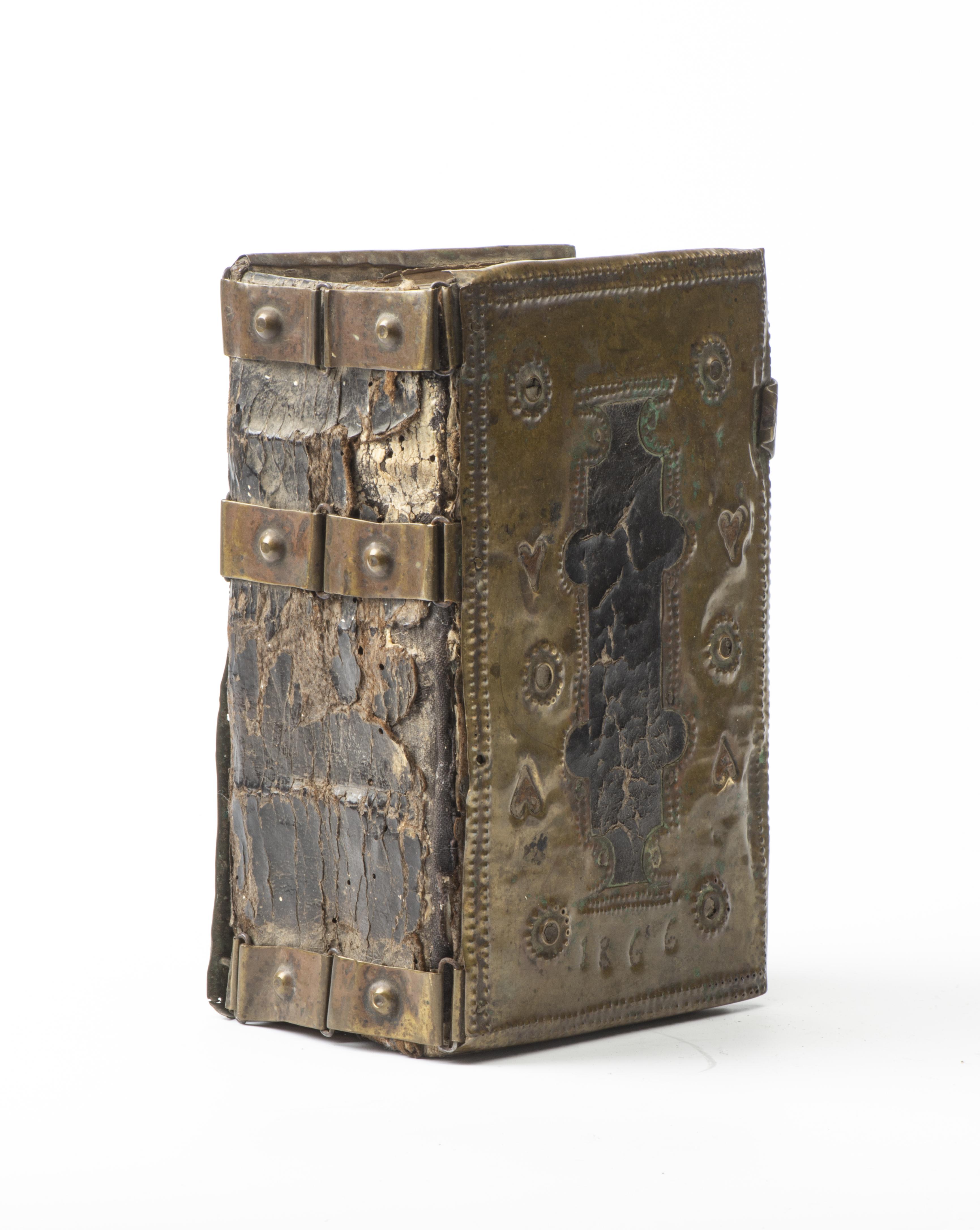 Livre écclesiastique antique de chants et prières "Cithara Sanctorum Apocalyps 5 & 8" par Visné Duchownj Modlitba, Srdecne zpjwanj, Edition de 1849 avec plats en veau recouvert de cuivre ajouré, daté 1866.