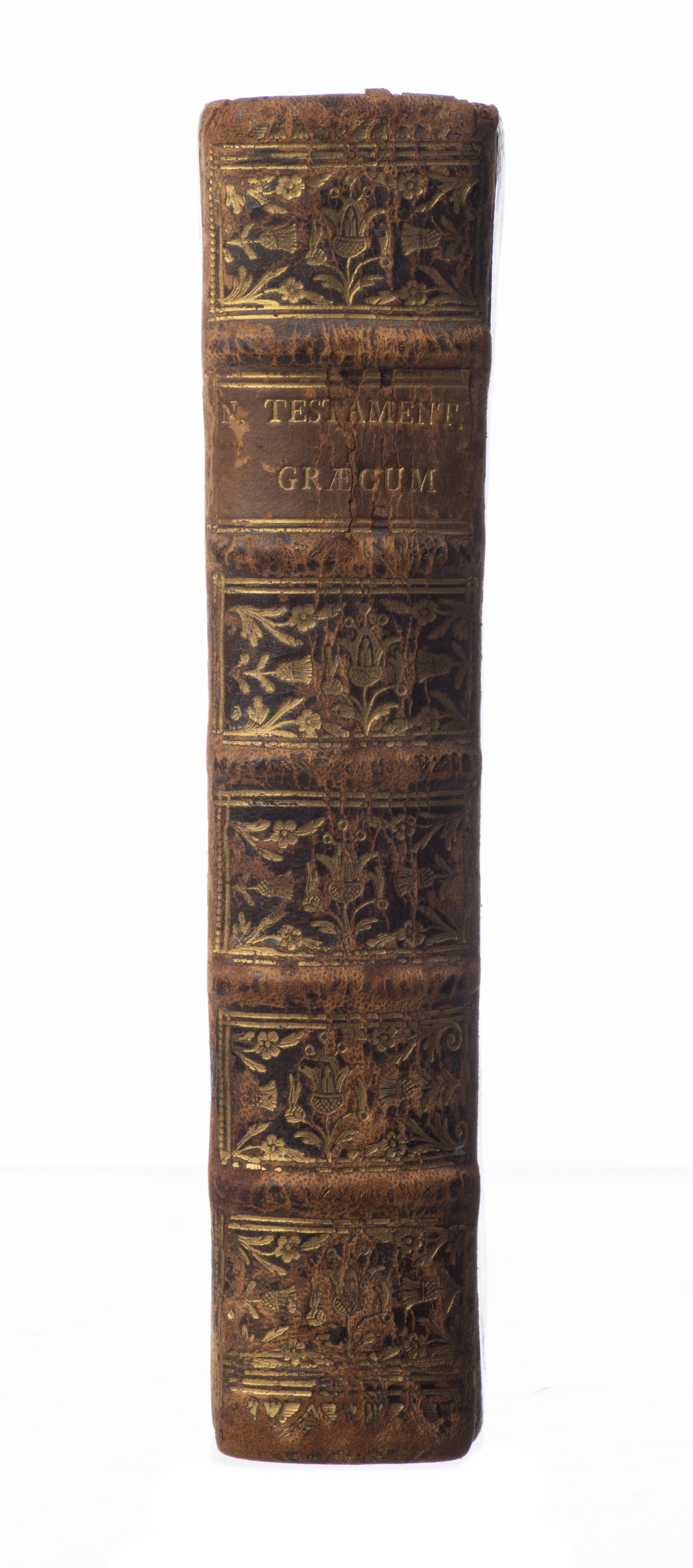 Nouveau Testament en grec, imprimé à Bâle en 1749, nom de l'ancien possesseur LUD. SECRETAN. DATUM: 1769, In-8, reliure plein veau d'époque.