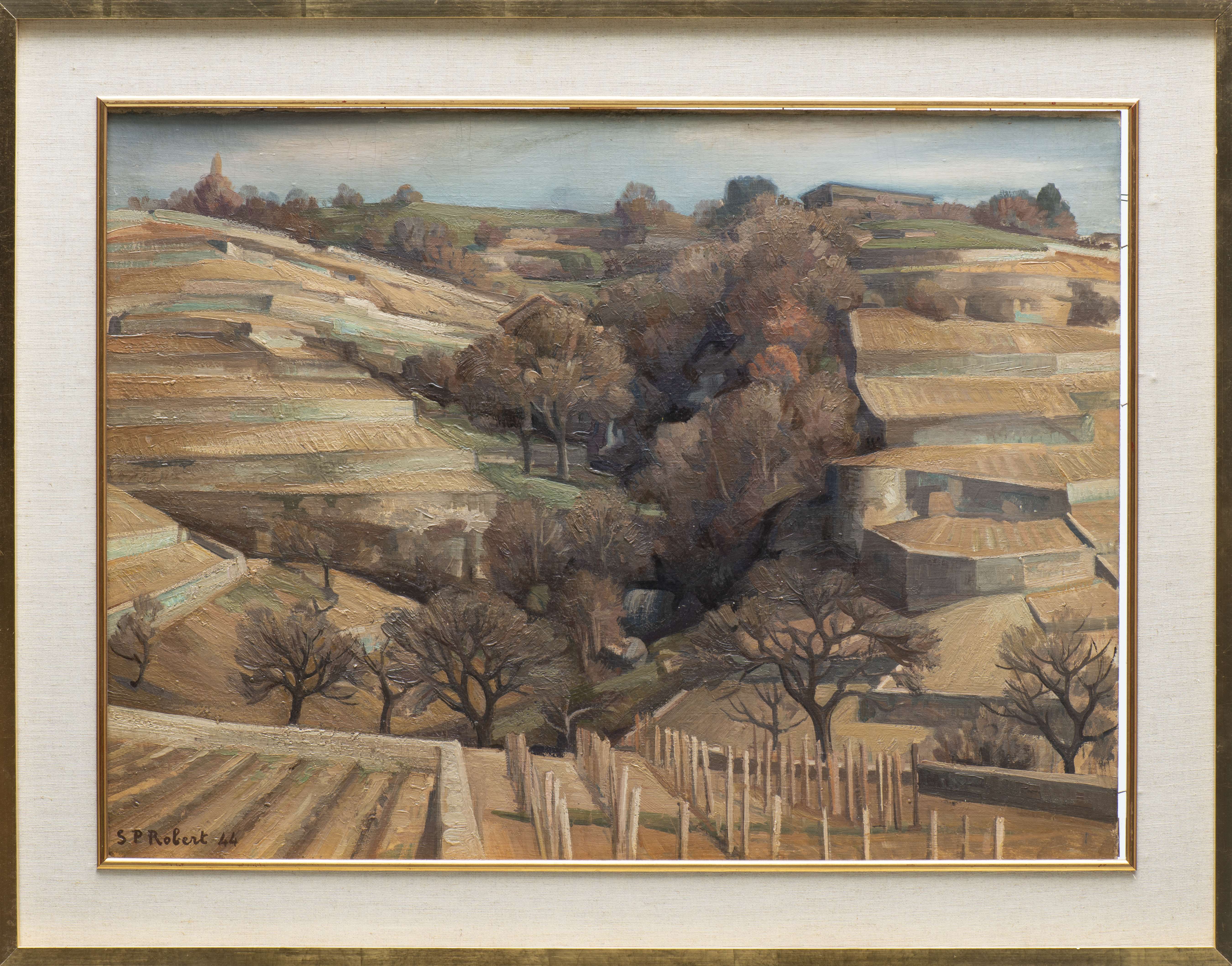 Steven Paul ROBERT (1896-1985), 'Les vignoble à Rivaz', Huile sur panneau, signé et daté 44, signé et daté 44 en bas à gauche.