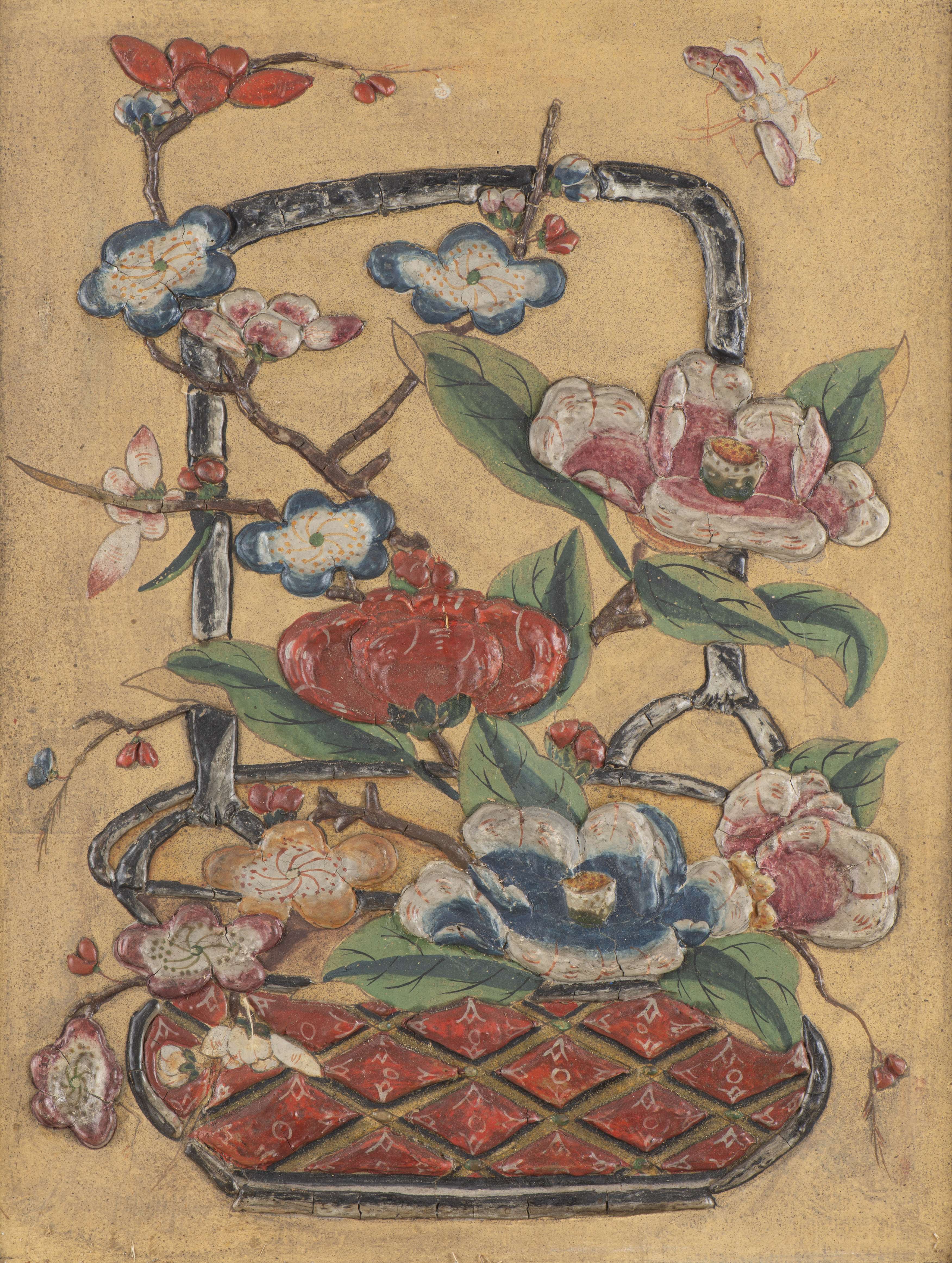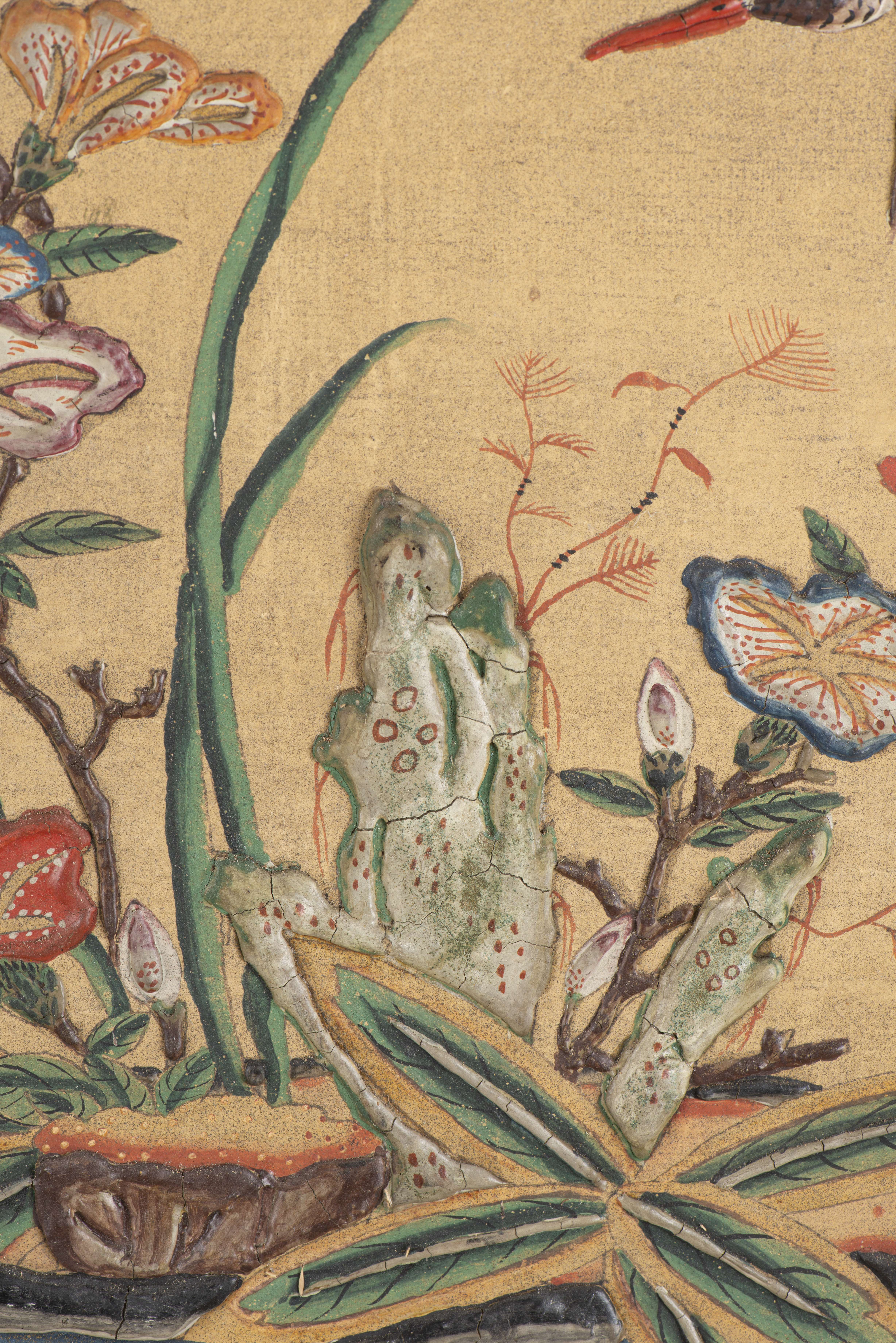 CHINE, Ensemble de trois peintures en relief sur toile de jute représentant des compositions en nature morte d'arrangements floraux et oiseaux et papillons.