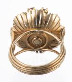 Bague en or rose .750 en forme de fleur sertie de 7 rubis cabochon pour un total de 0.30 ct et 7 diamants de taille brillant pour un total de 0.35 ct.