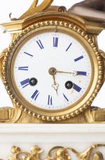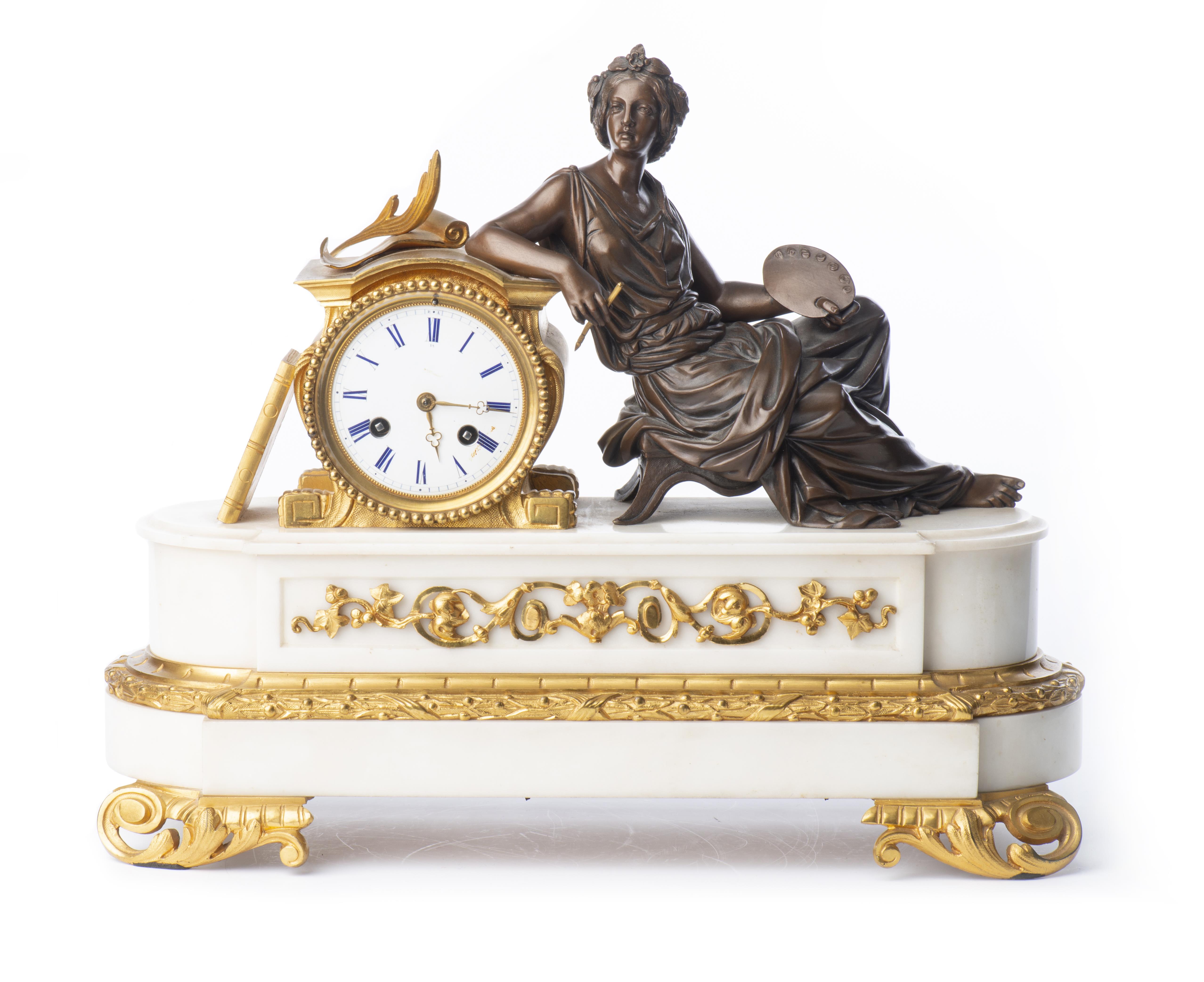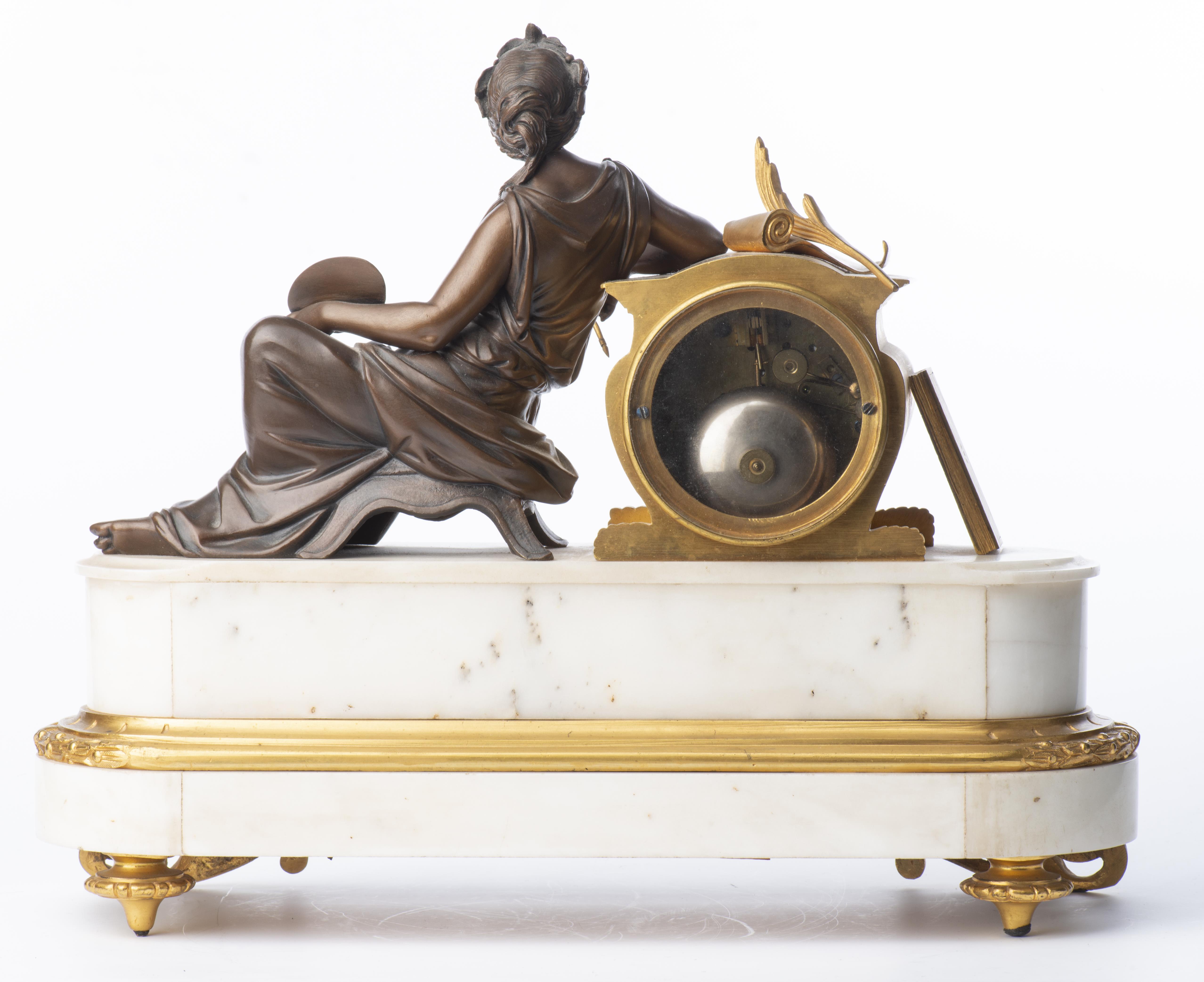 Travail Napoléon III, Pendule en bronze à patine doré ornée d'une femme à l'antique à patine brune. Socle en marbre blanc et piètement en bronze ciselé quadripode.