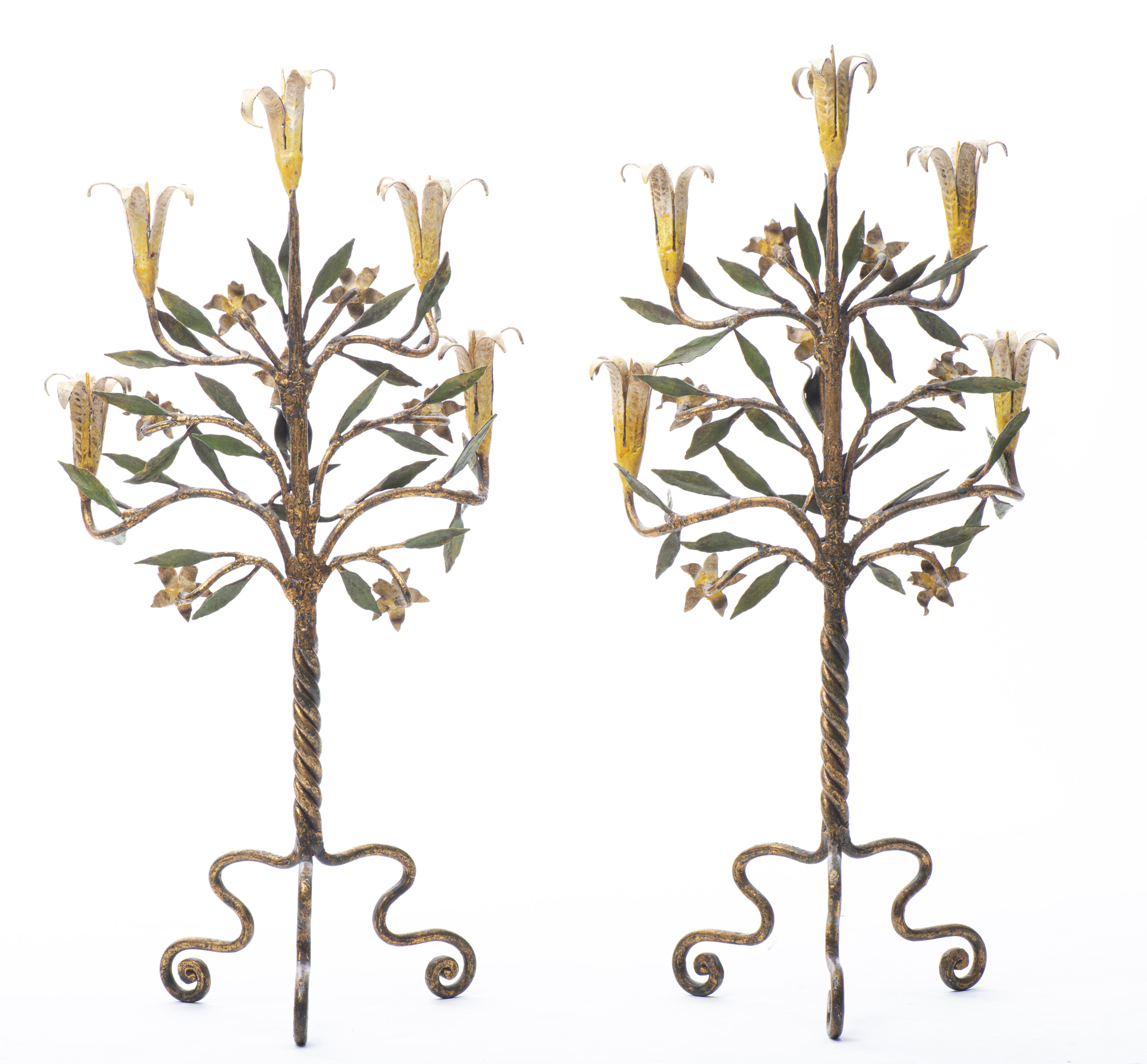 Travail italien des années 1950, Paire de bougeoirs en fer forgé polychrome à cinq lumières chacune à forme de fleurs.