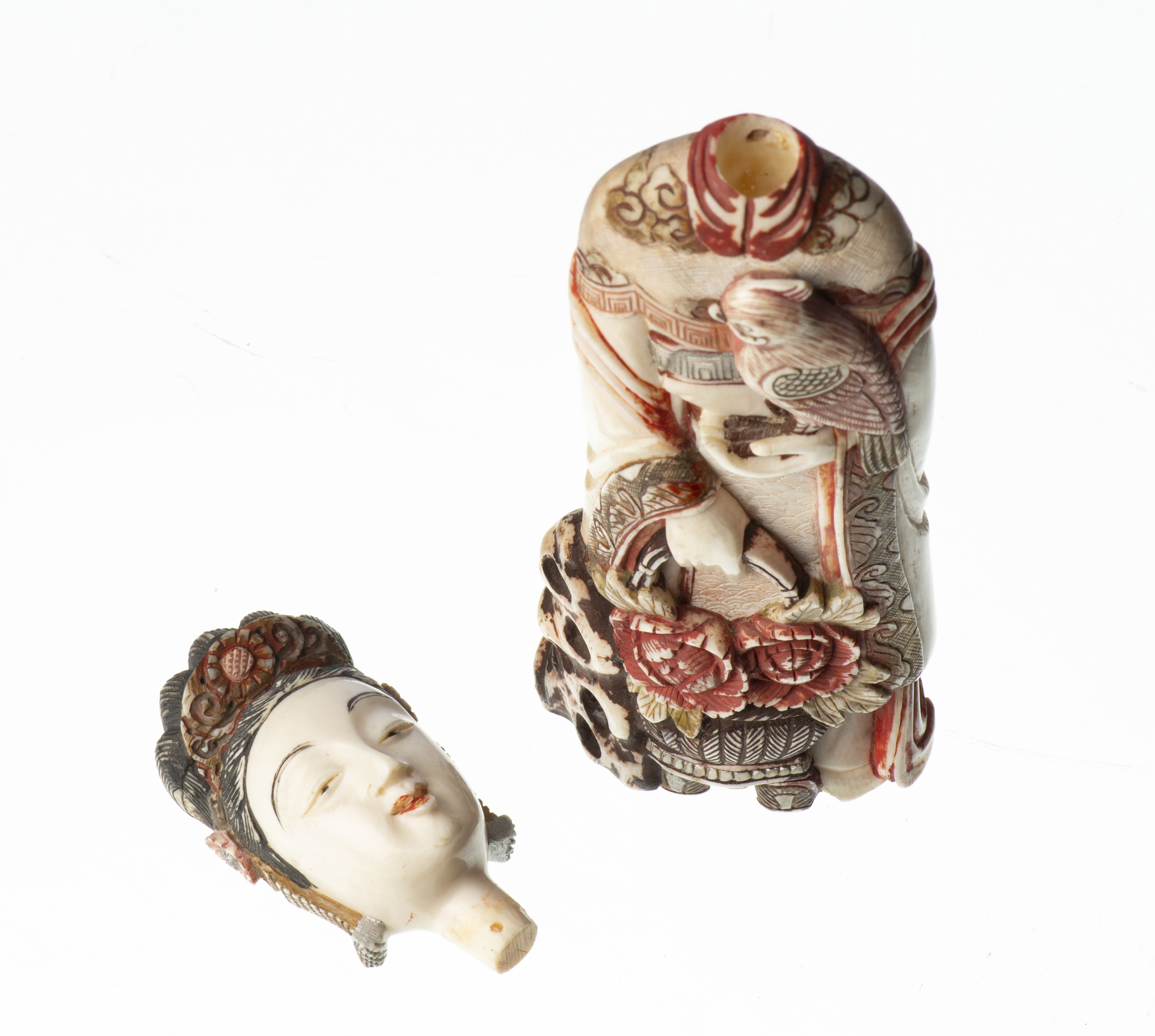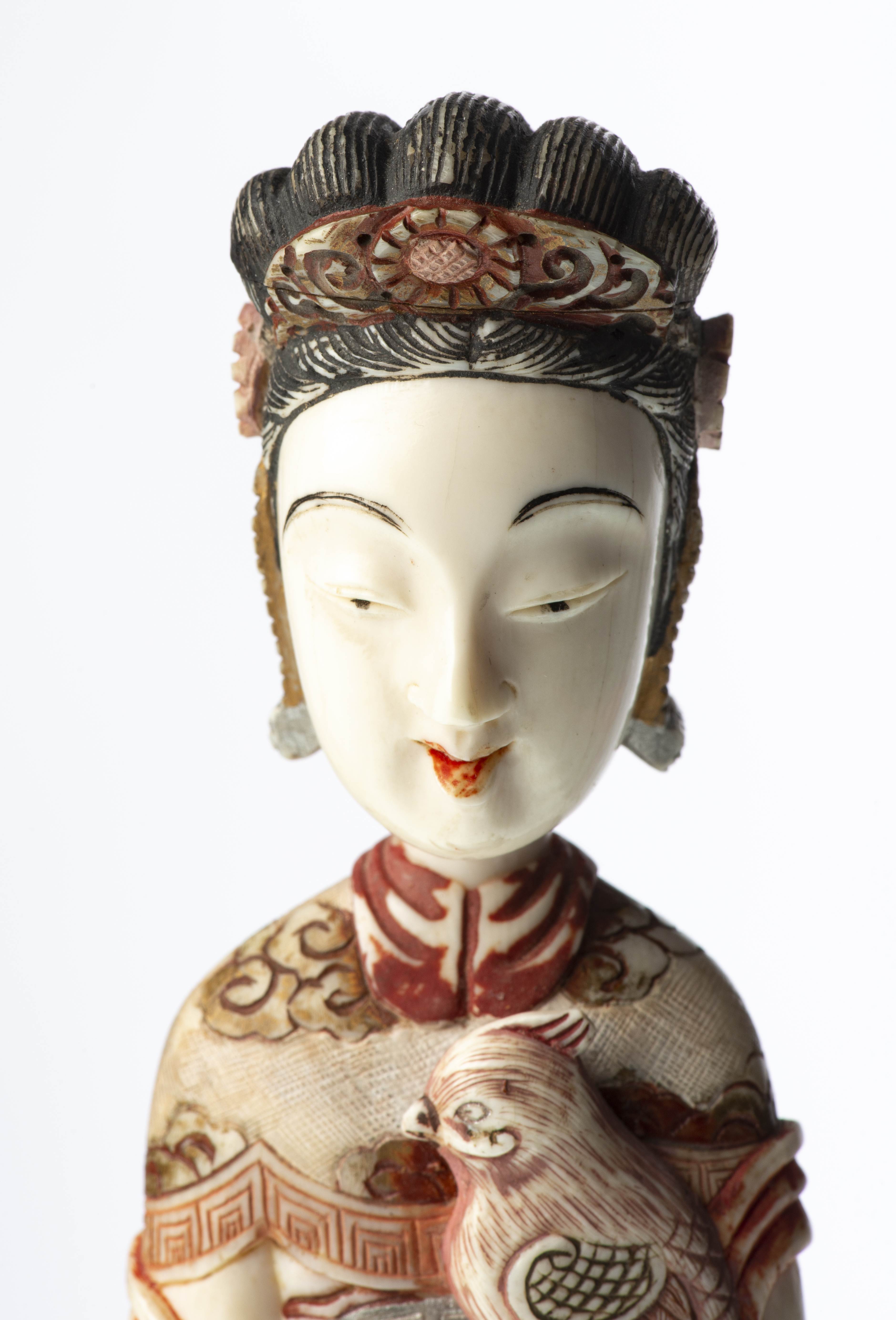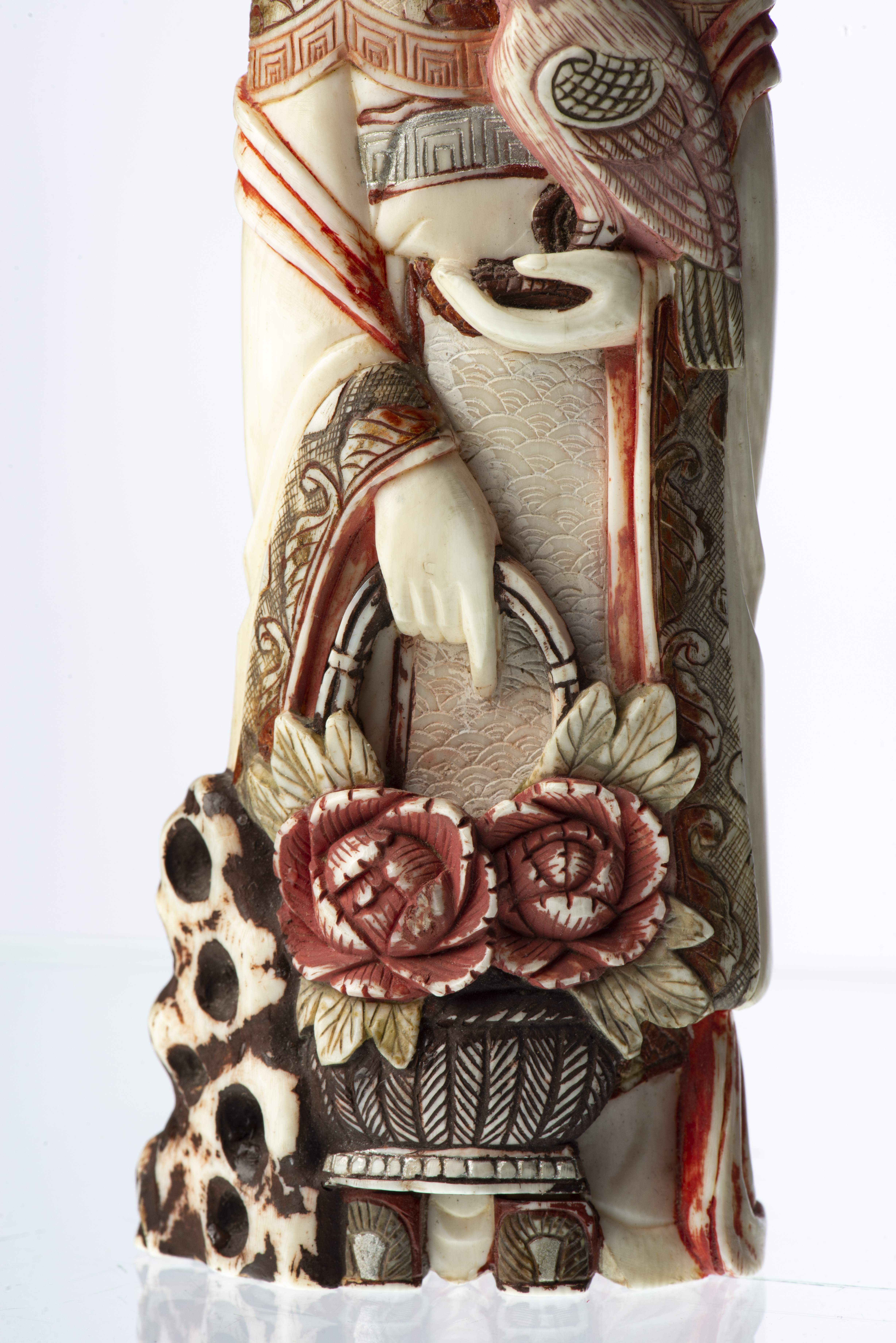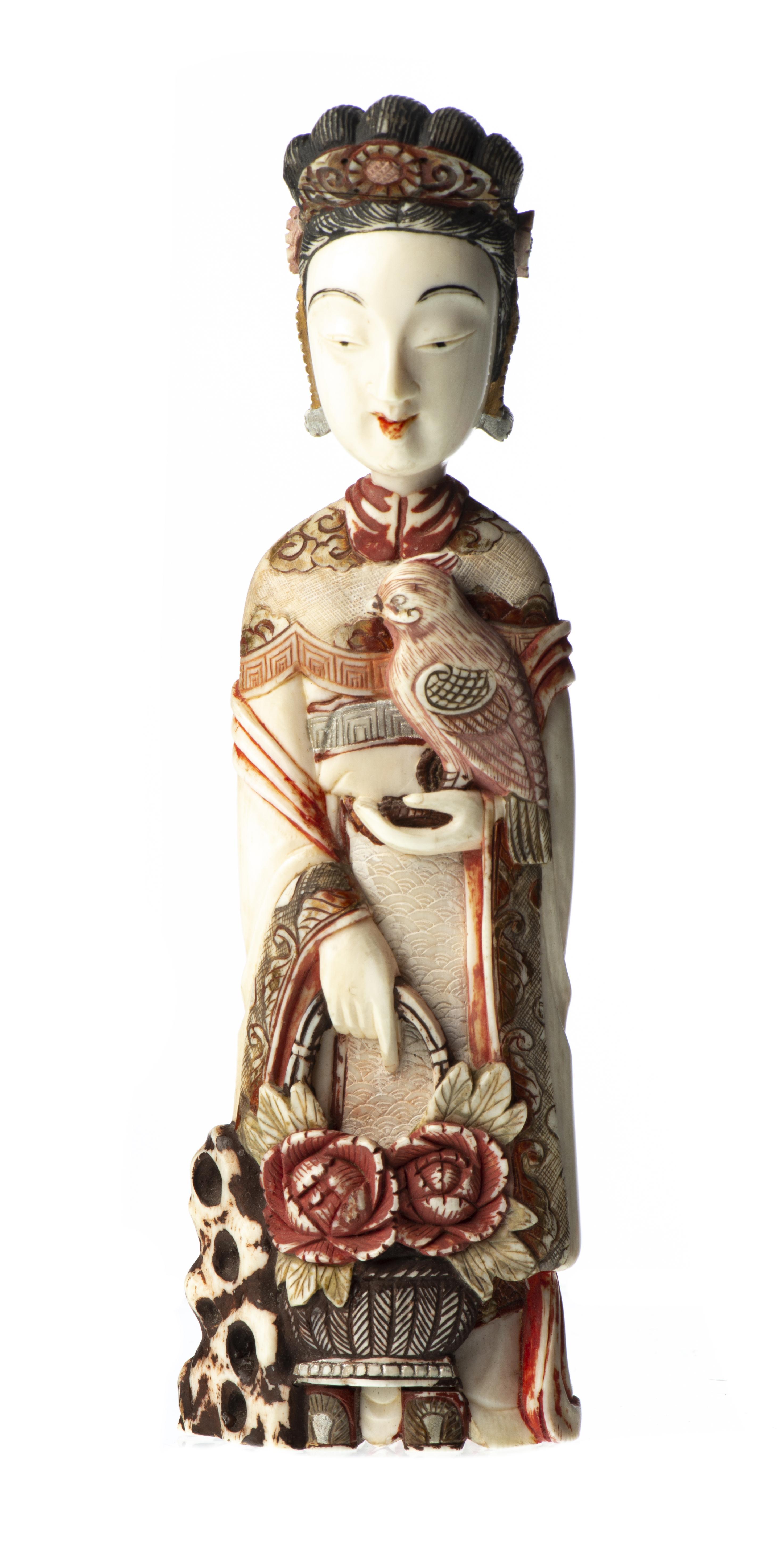 CHINE, Statue en ivoire teinté représentant une jeune femme tenant de sa main droite un panier fleuri et un perroquet dans sa main gauche. Tête mobile.